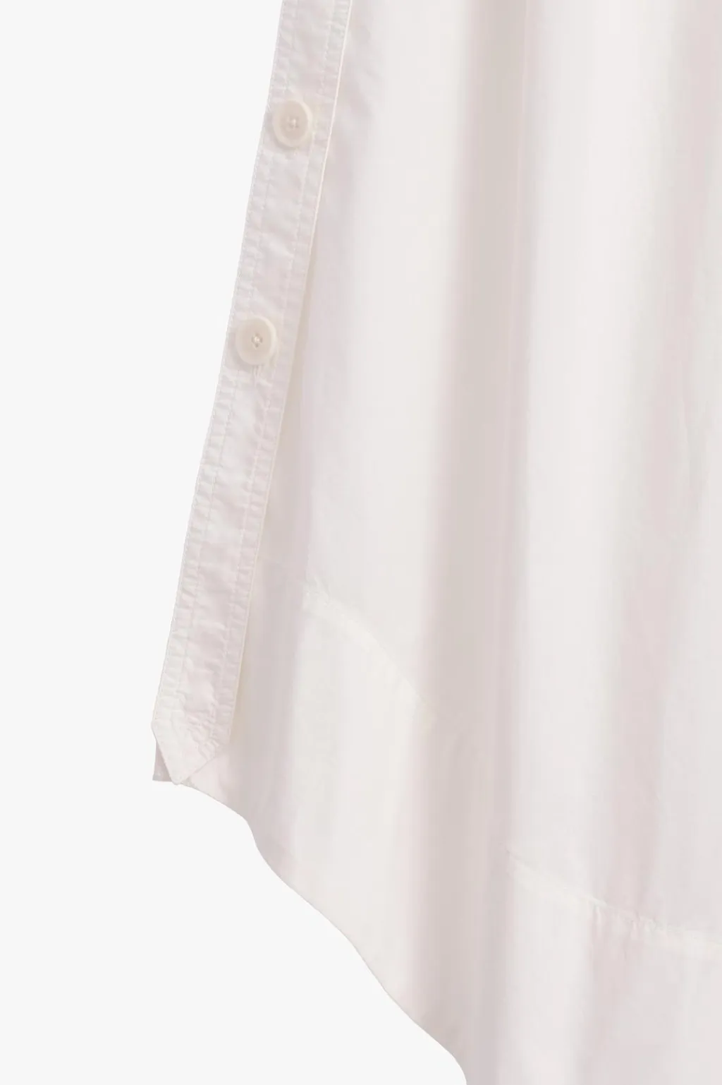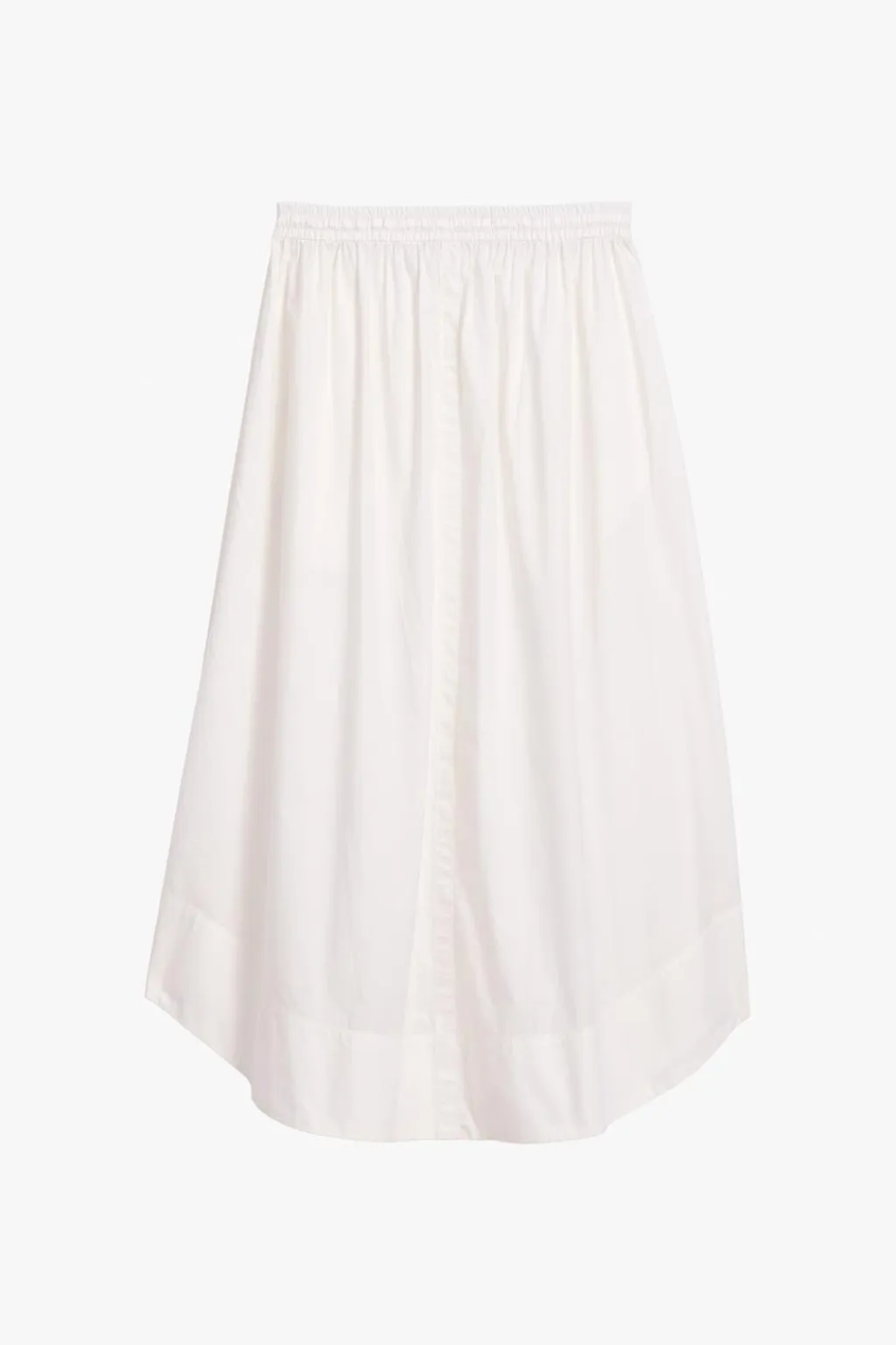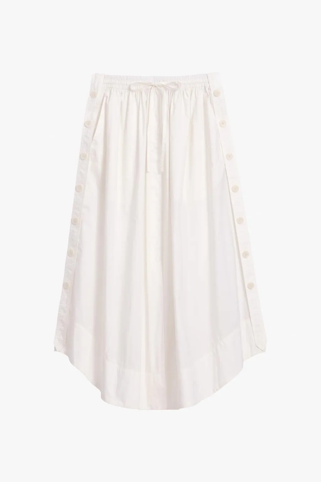 Falda midi confeccionada en hilatura de algodón 100%. Tiro medio y cintura elástica ajustable con cordones. Bolsillos en delantero. Detalle de cintas laterales con botones. Bajo acabado en abertura frontal.