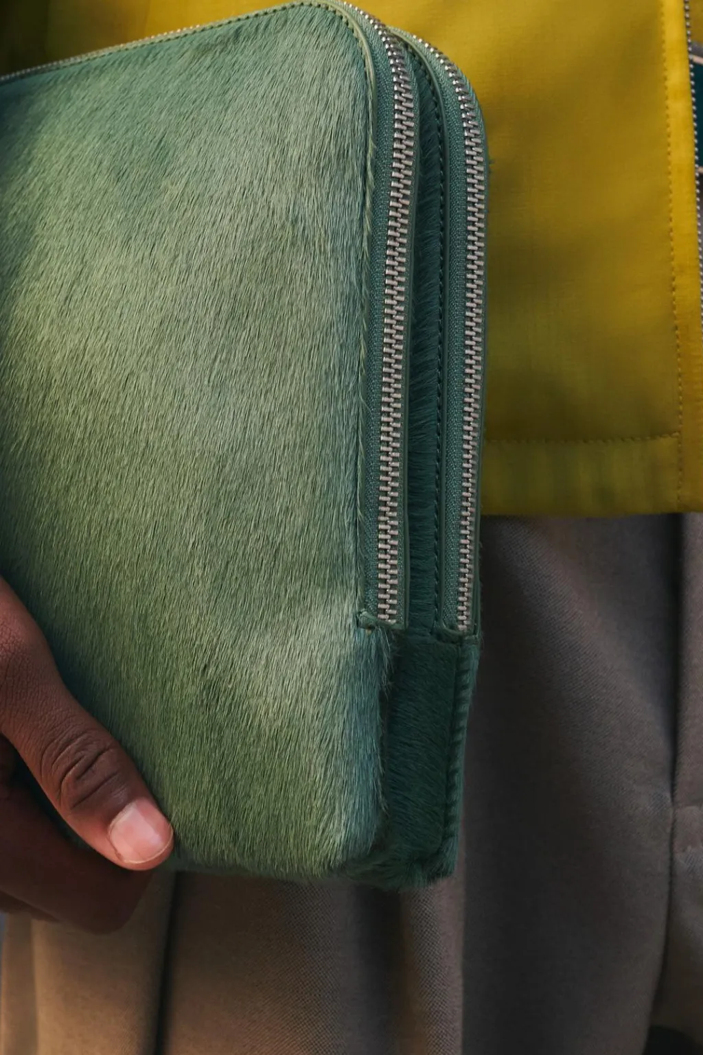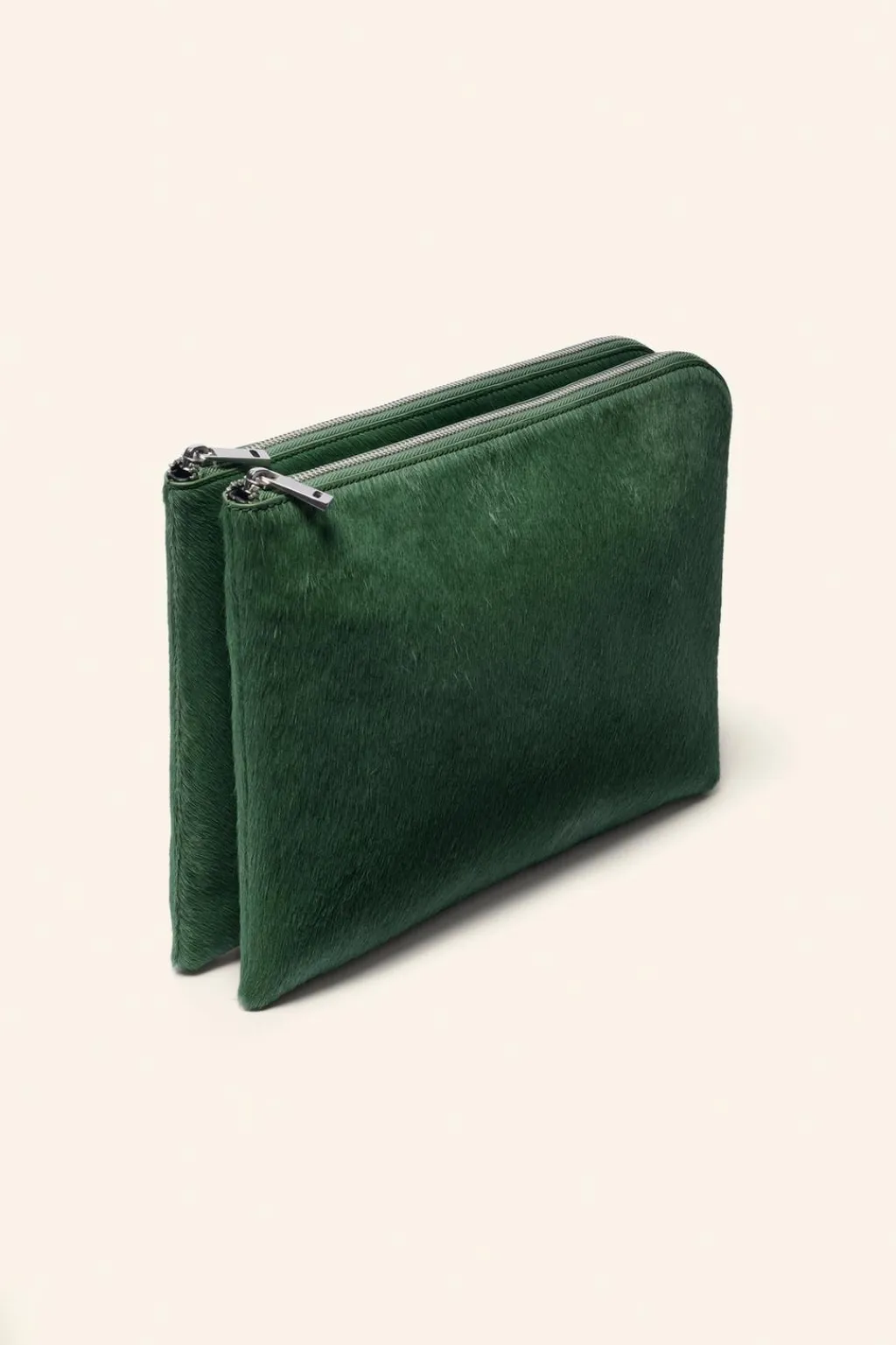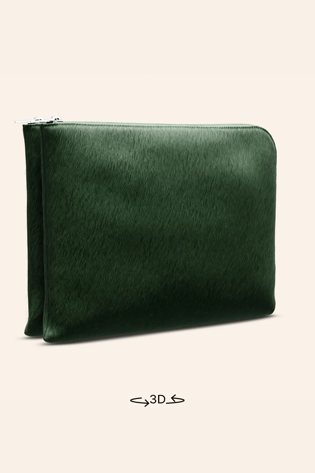 Bolso tipo sobre. Fabricado en piel con acabado pelo. Cuenta con dos compartimentos con cierre mediante cremallera. Bolsillo interior sin cierre.