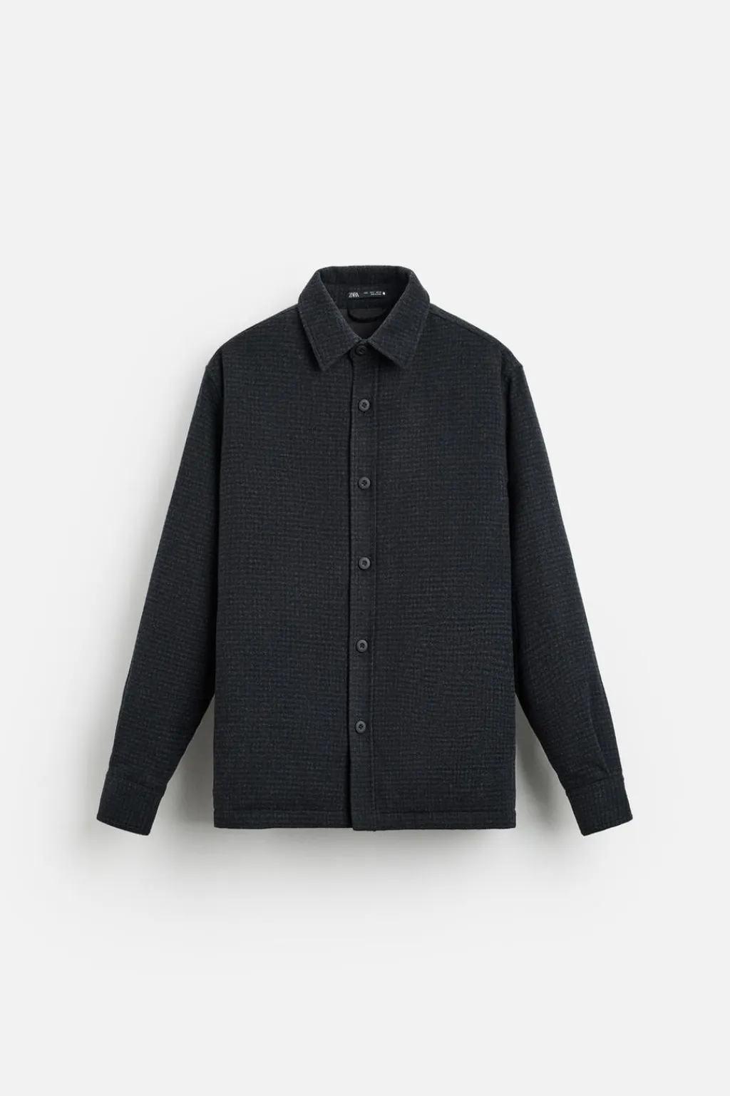 Sobrecamisa boxy fit confeccionada en tejido con lana ligeramente acolchada en su interior. Cuello solapa y manga larga acabada en puño con botón. Bolsillos laterales en cadera. Cierre frontal de botonadura.