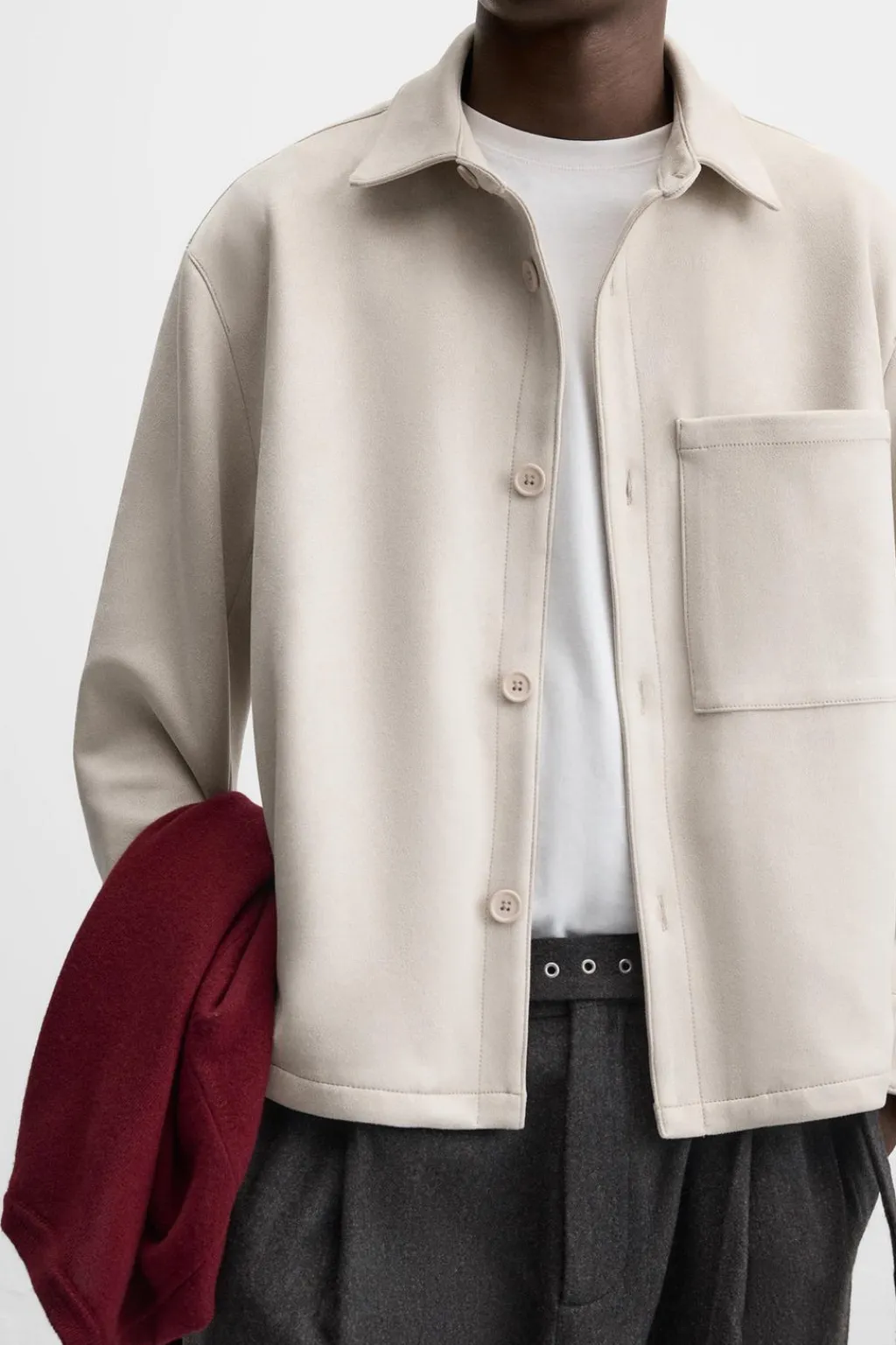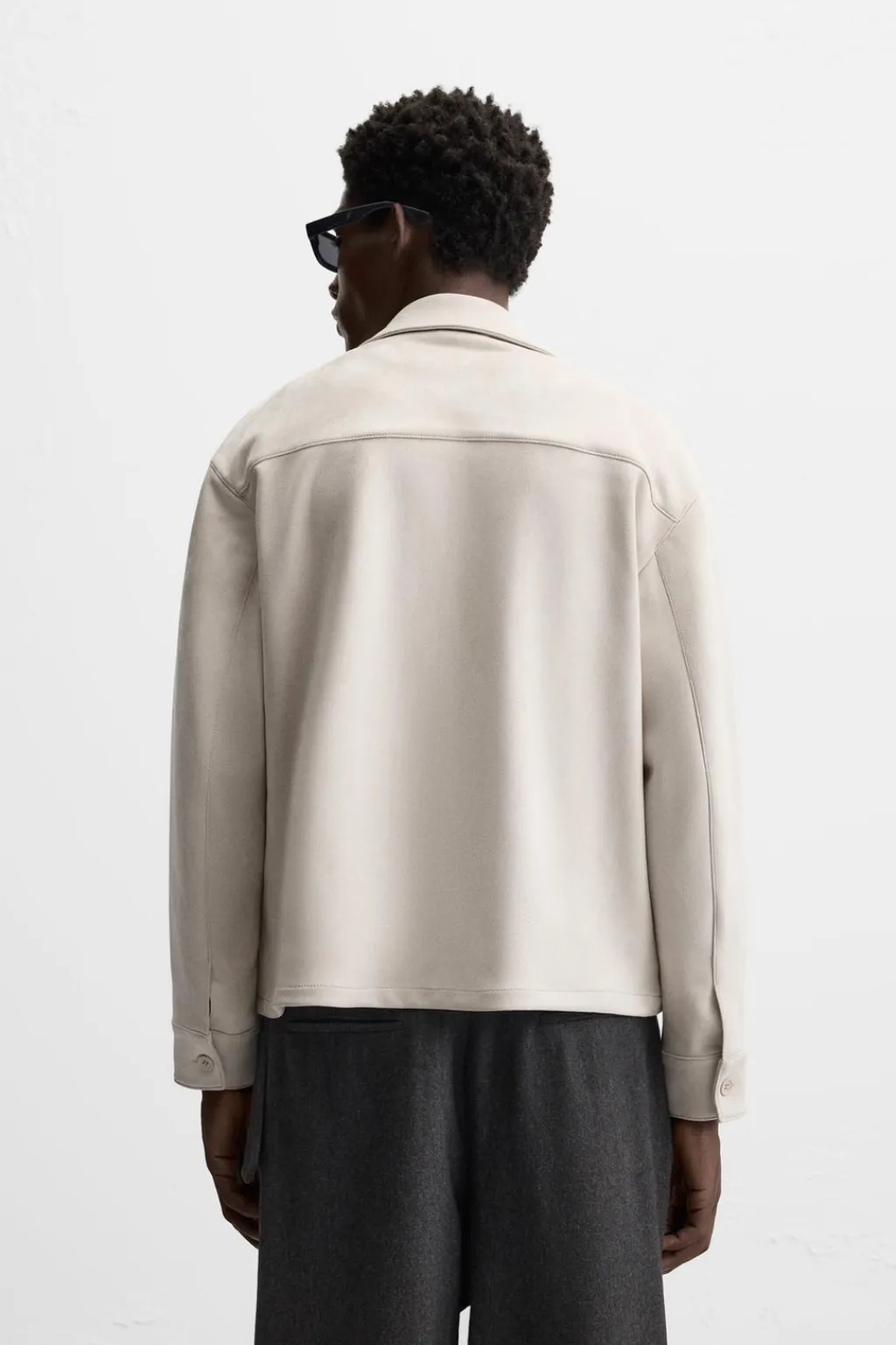 Sobrecamisa regular fit confeccionada en tejido efecto ante. Cuello solapa y manga larga acabada en puño con botón. Detalle de bolsillo plastrón en pecho y laterales en cadera. Cierre frontal de botonadura.