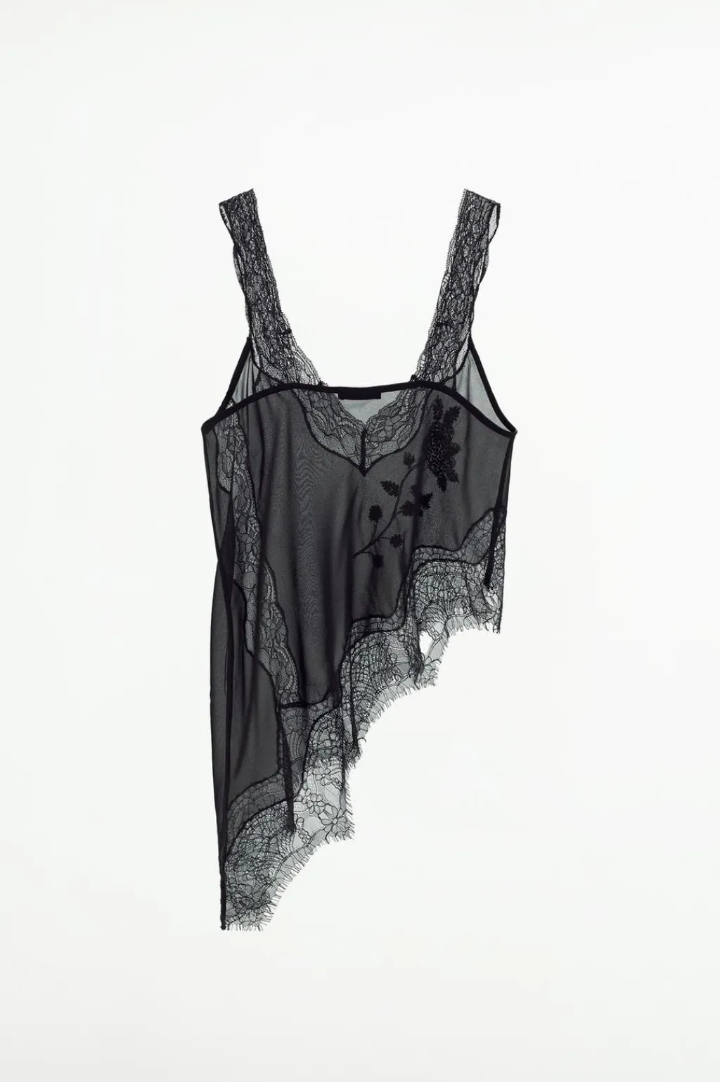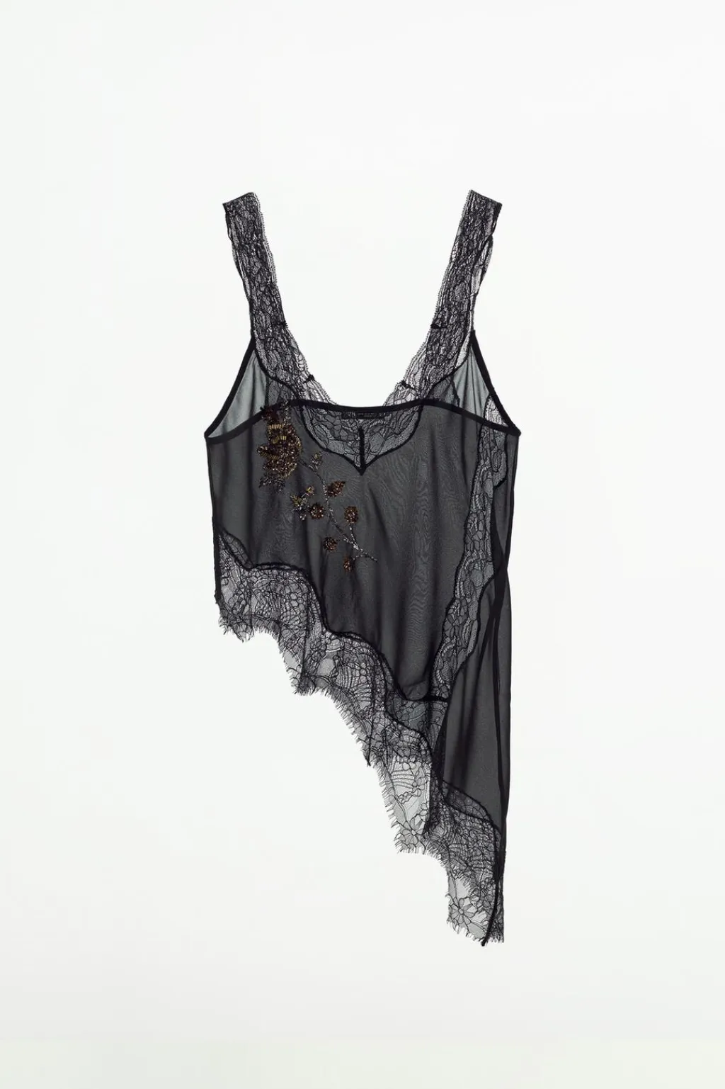 Top de escote pico y tirantes anchos. Detalle aplicación de encaje suave combinado a tono y bordado floral con abalorios a color. Bajo asimétrico.