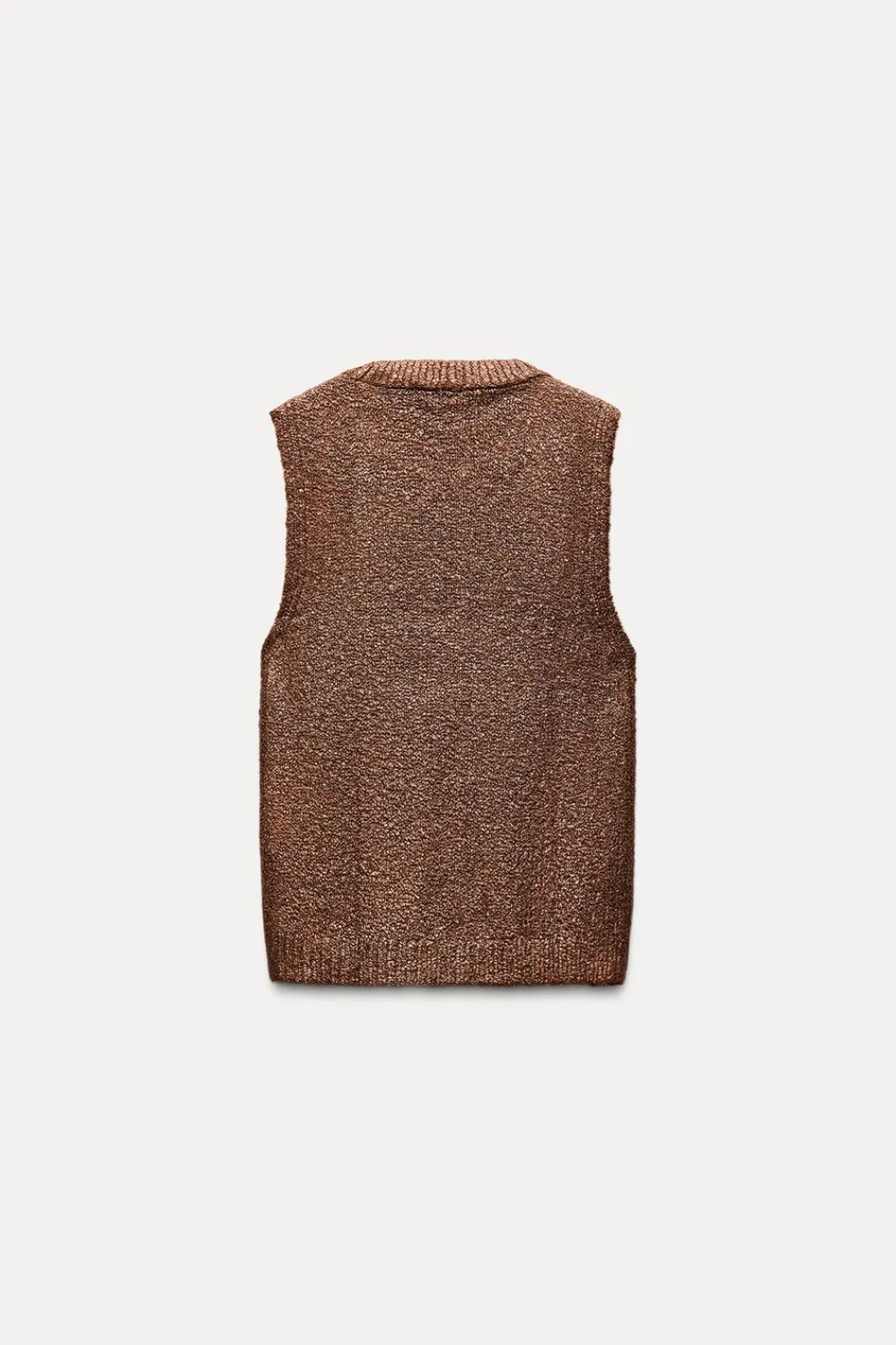 Top chaleco de cuello redondo y manga sisa. Detalle de tejido efecto metalizado.