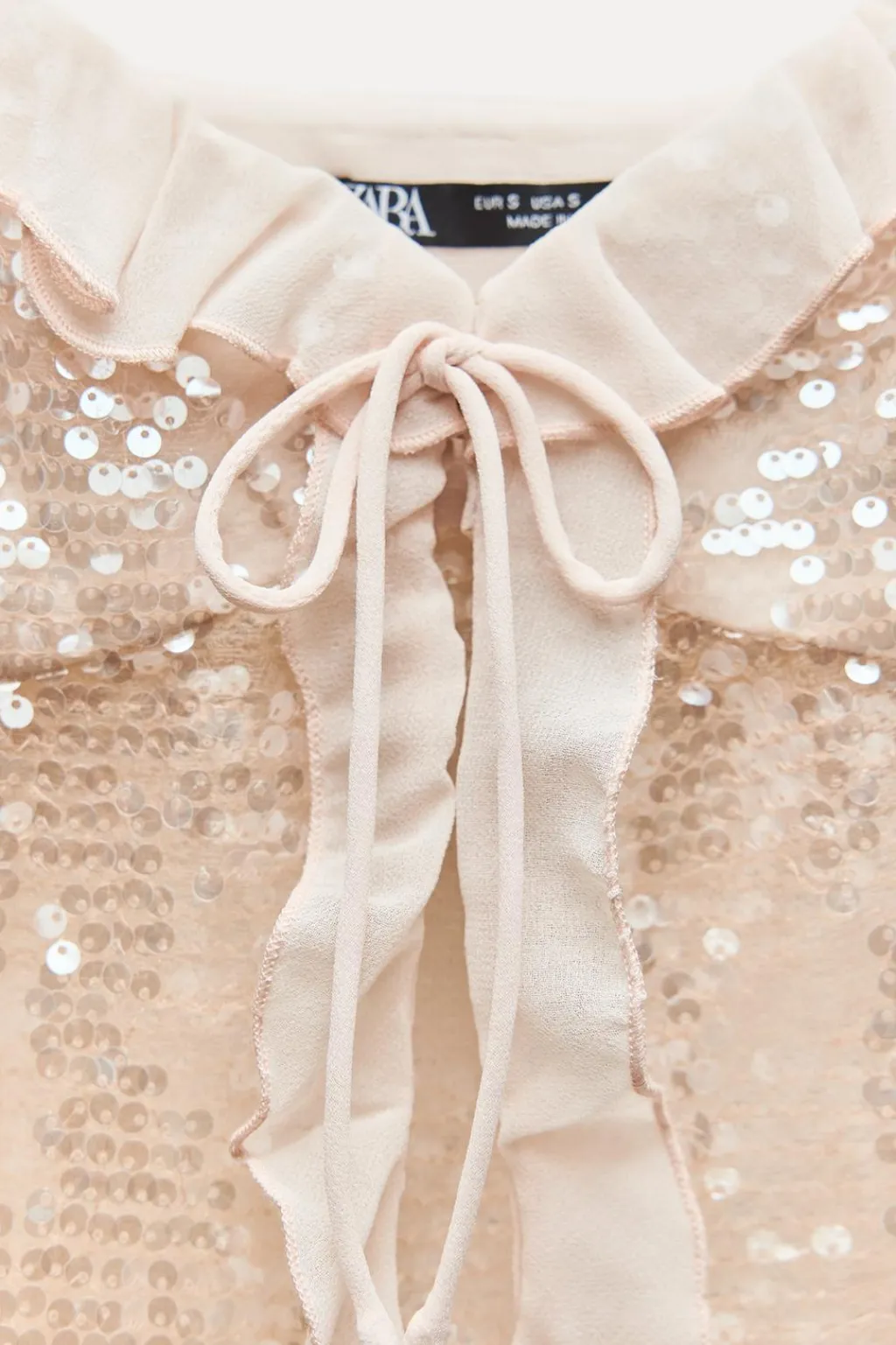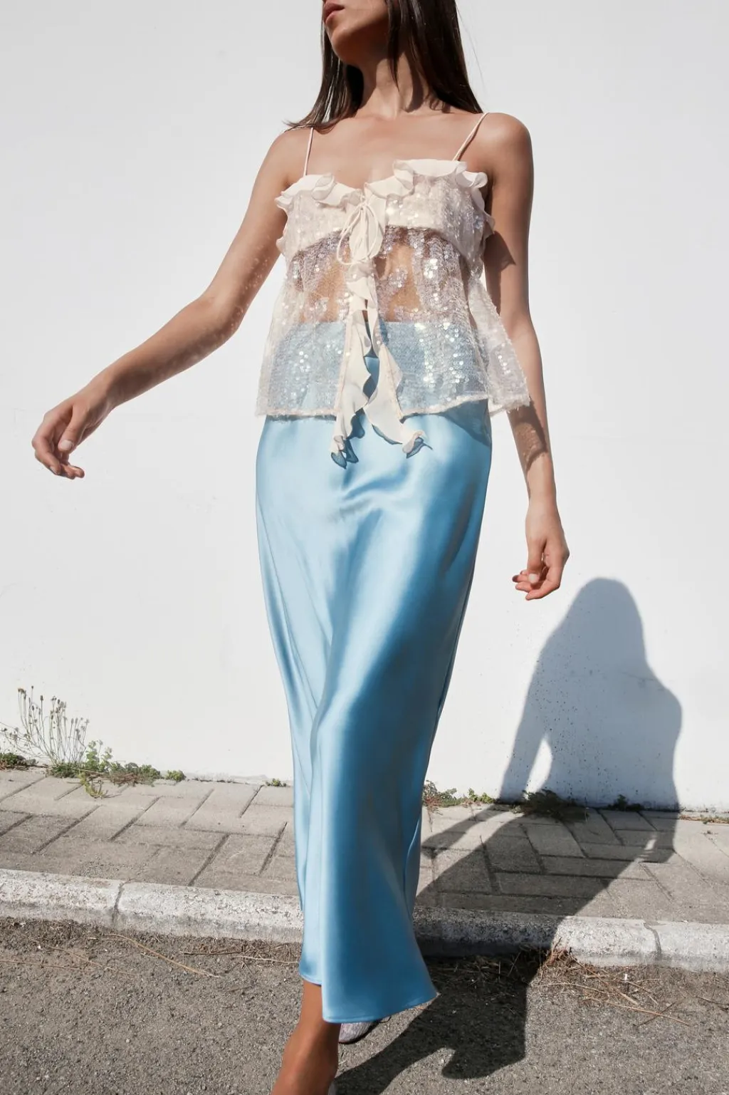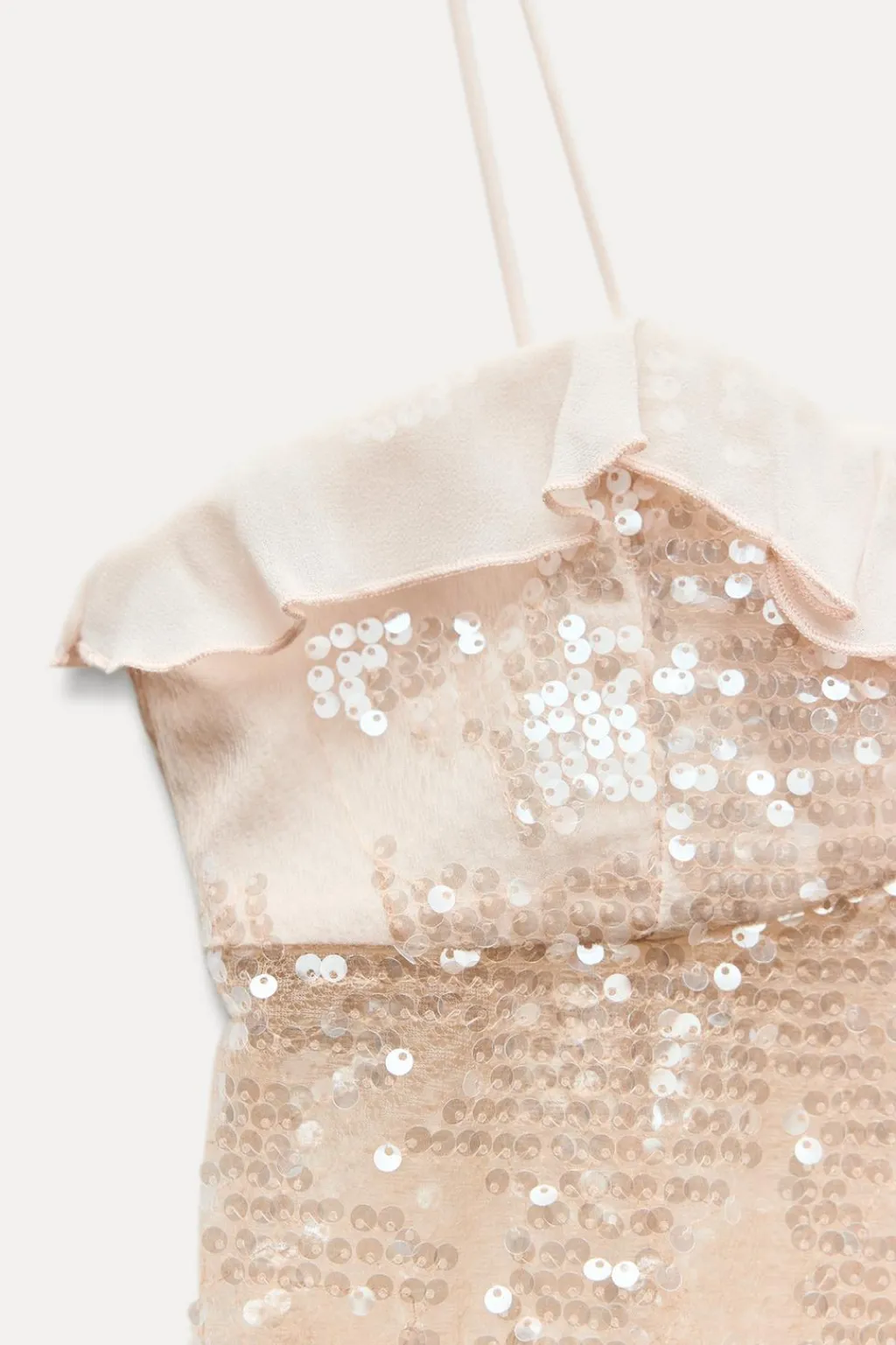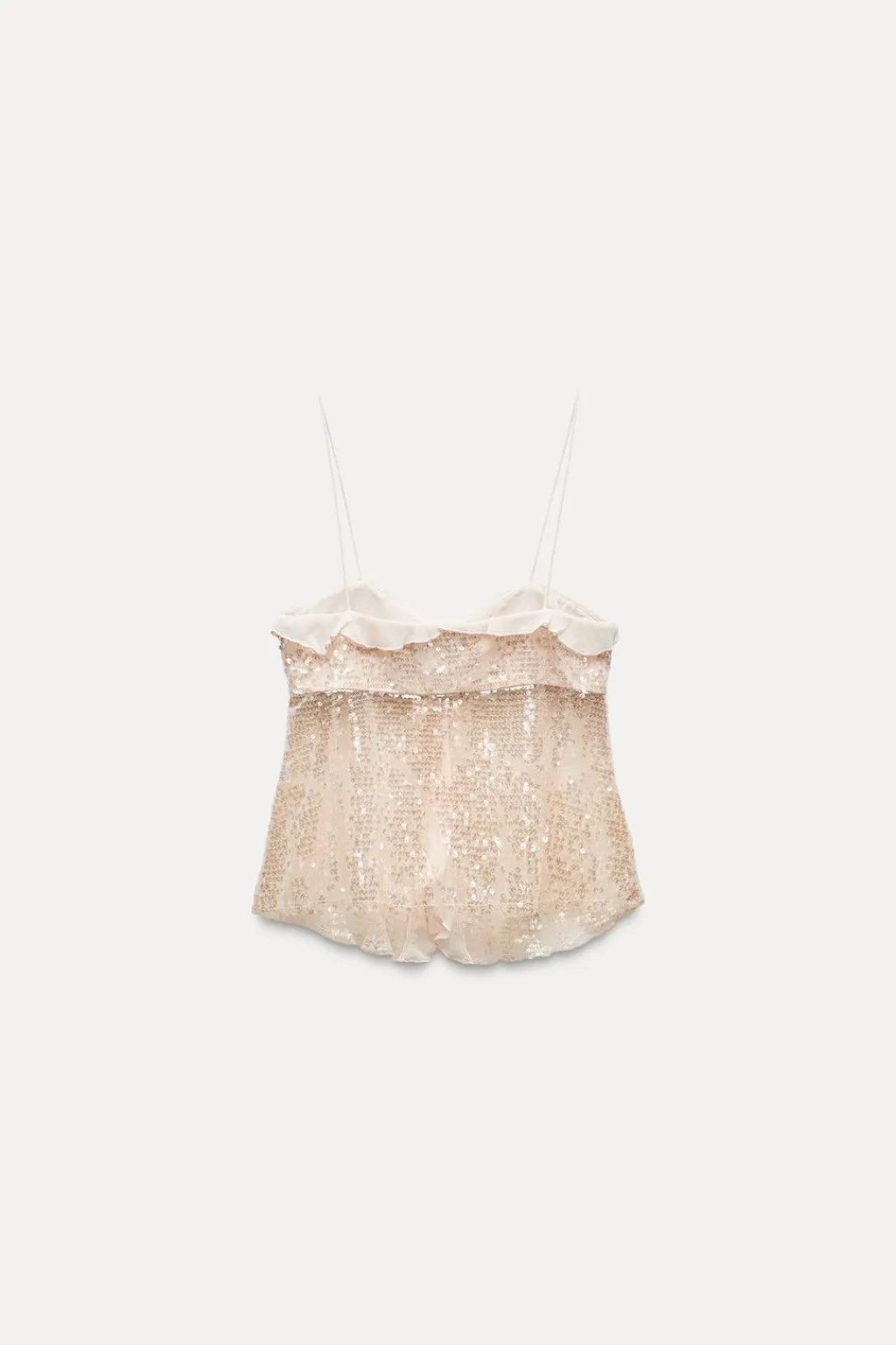 Top con tejido combinado con lentejuelas. Escote pico con volante y tirantes finos. Bajo con abertura frontal. Cierre delantero con botones ocultos y cordón.