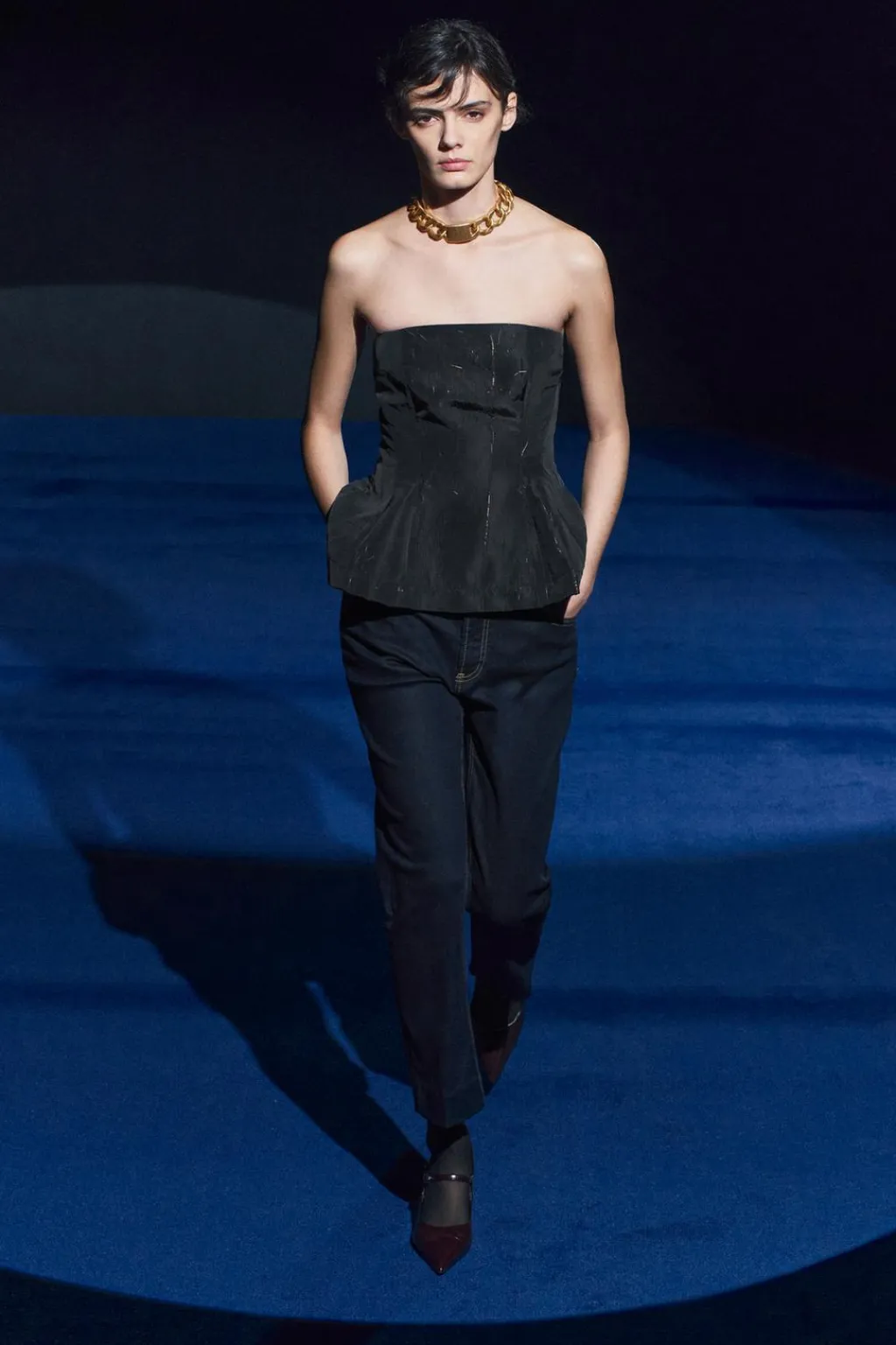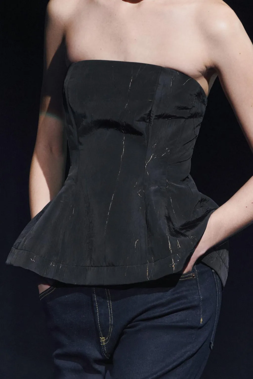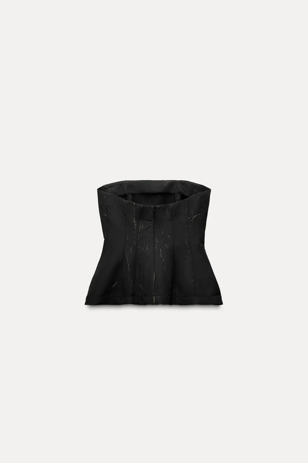 Top palabra de honor con aplicación de hilo metalizado. Bajo acabado en peplum. Cierre con cremallera oculta en costura.