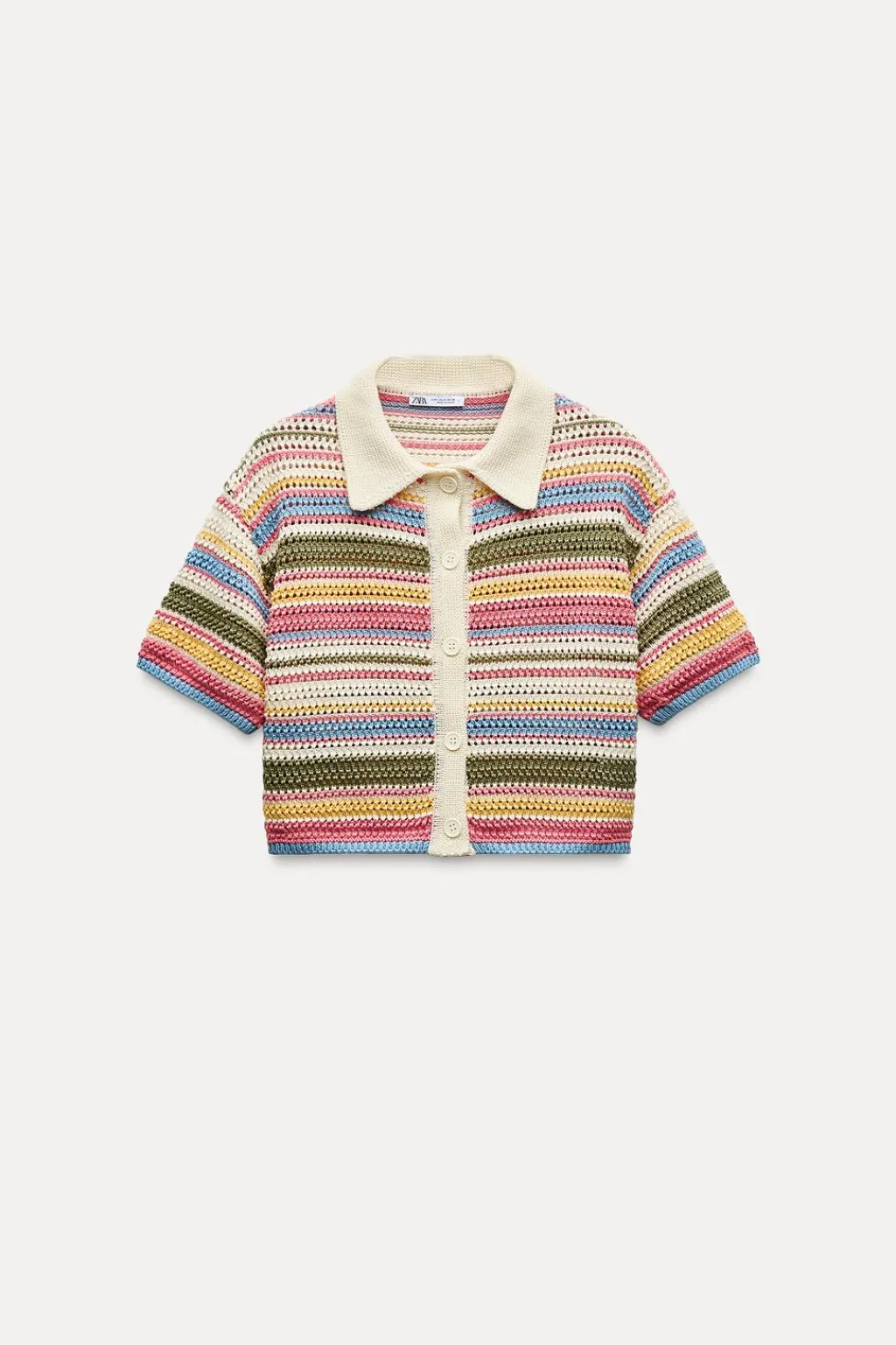 Top confeccionado en crochet. Cuello tipo polo y manga corta. Cierre frontal con botones.
