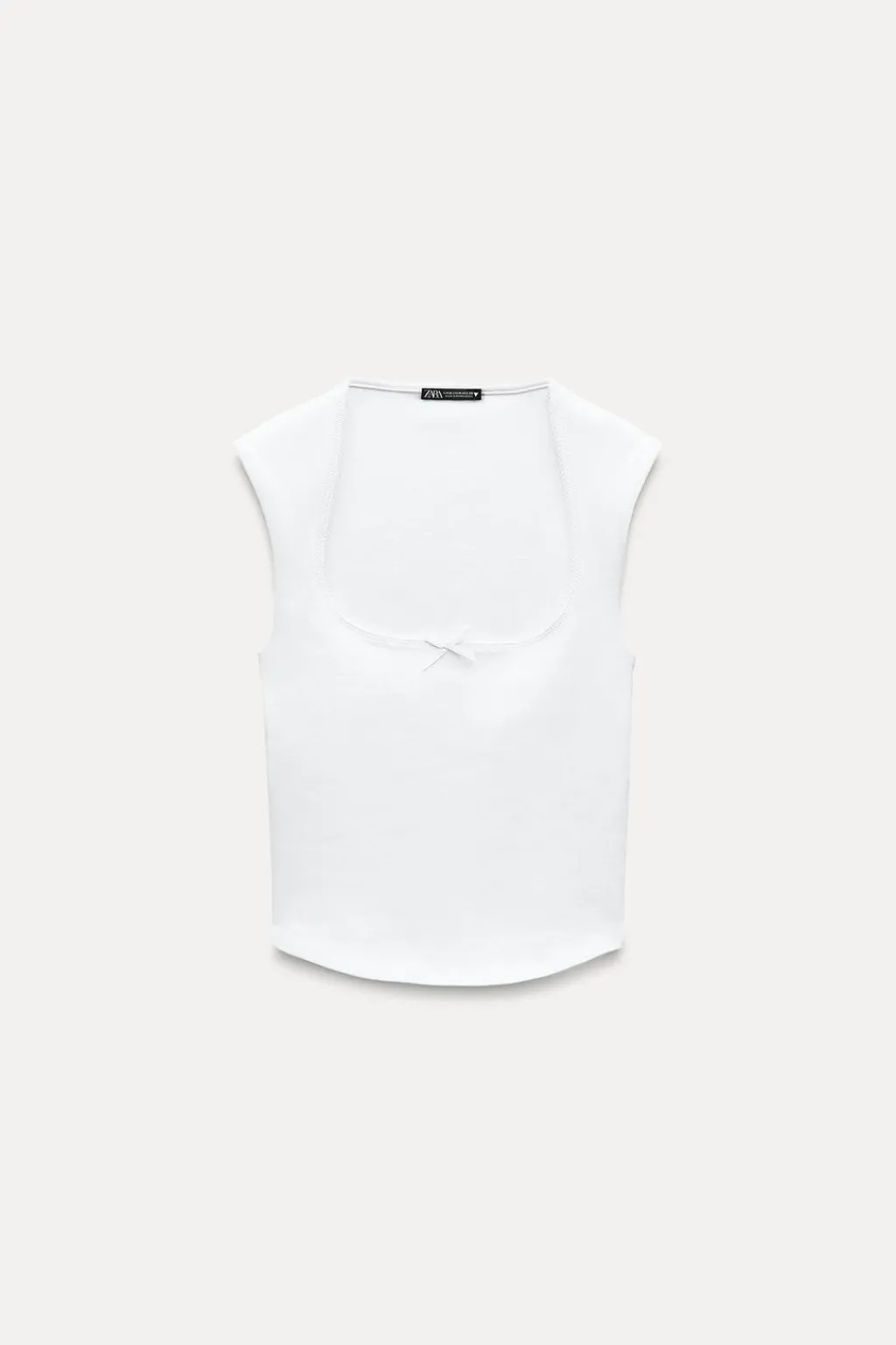 Top de escote cuadrado y manga muy corta. Detalle aplicación de lazo en delantero combinado a tono. Acabados en puntilla.
