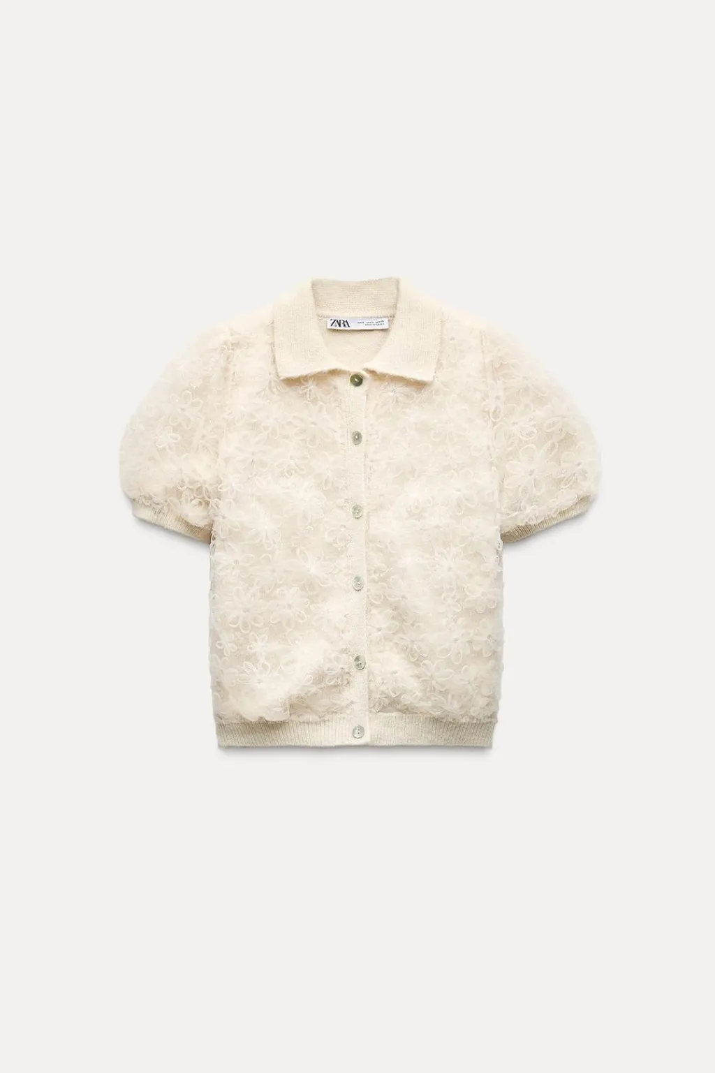 Top de cuello solapa y manga corta abullonada. Detalle de tejido combinado con encaje y aplicación de lentejuelas. Cierre frontal con botones.