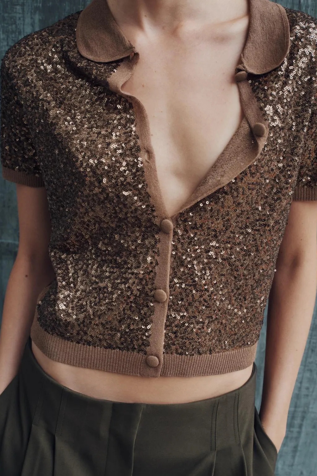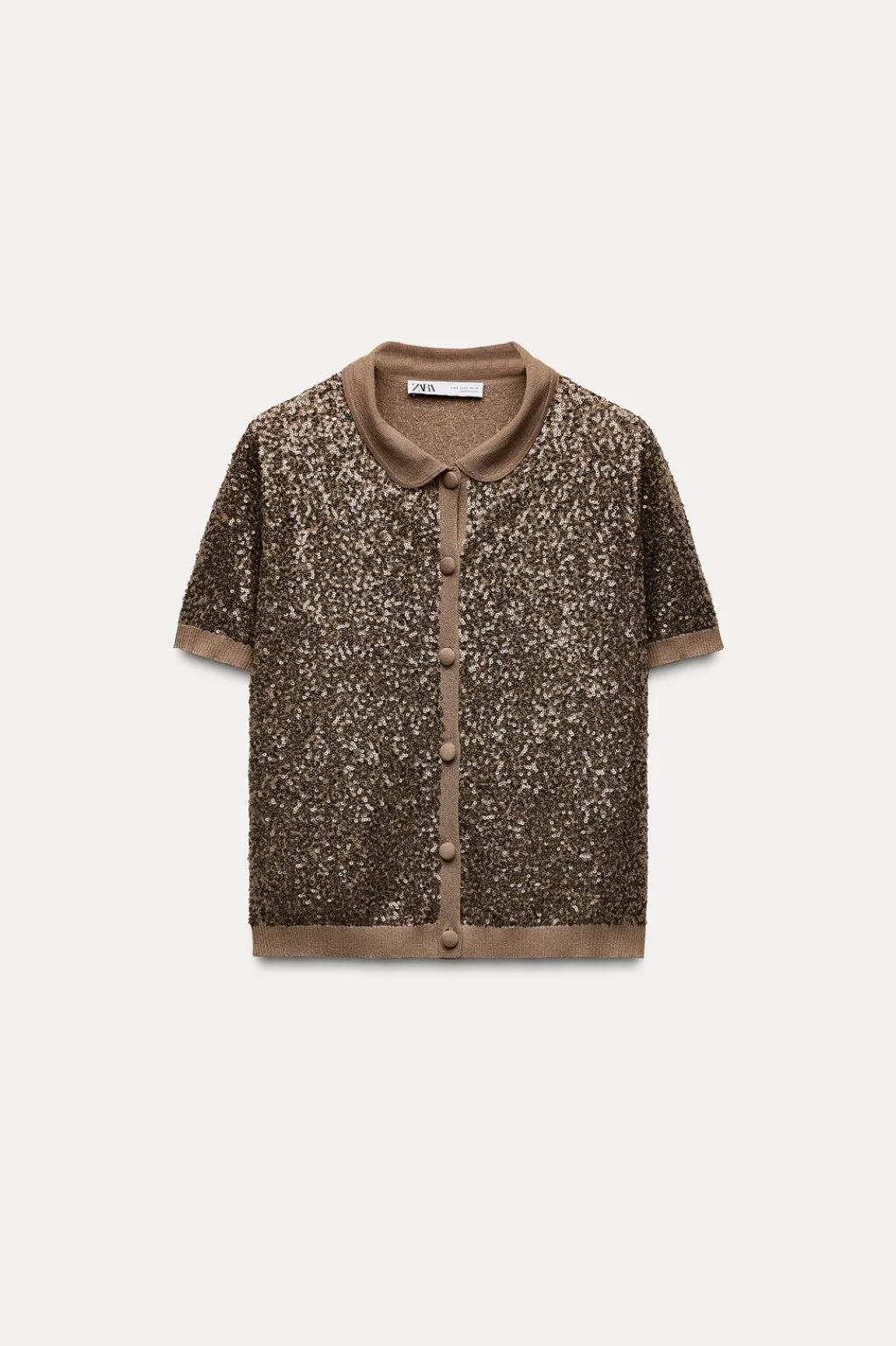 Top con cuello bobo y manga corta. Detalle de aplicación de lentejuelas. Cierre frontal con botones.