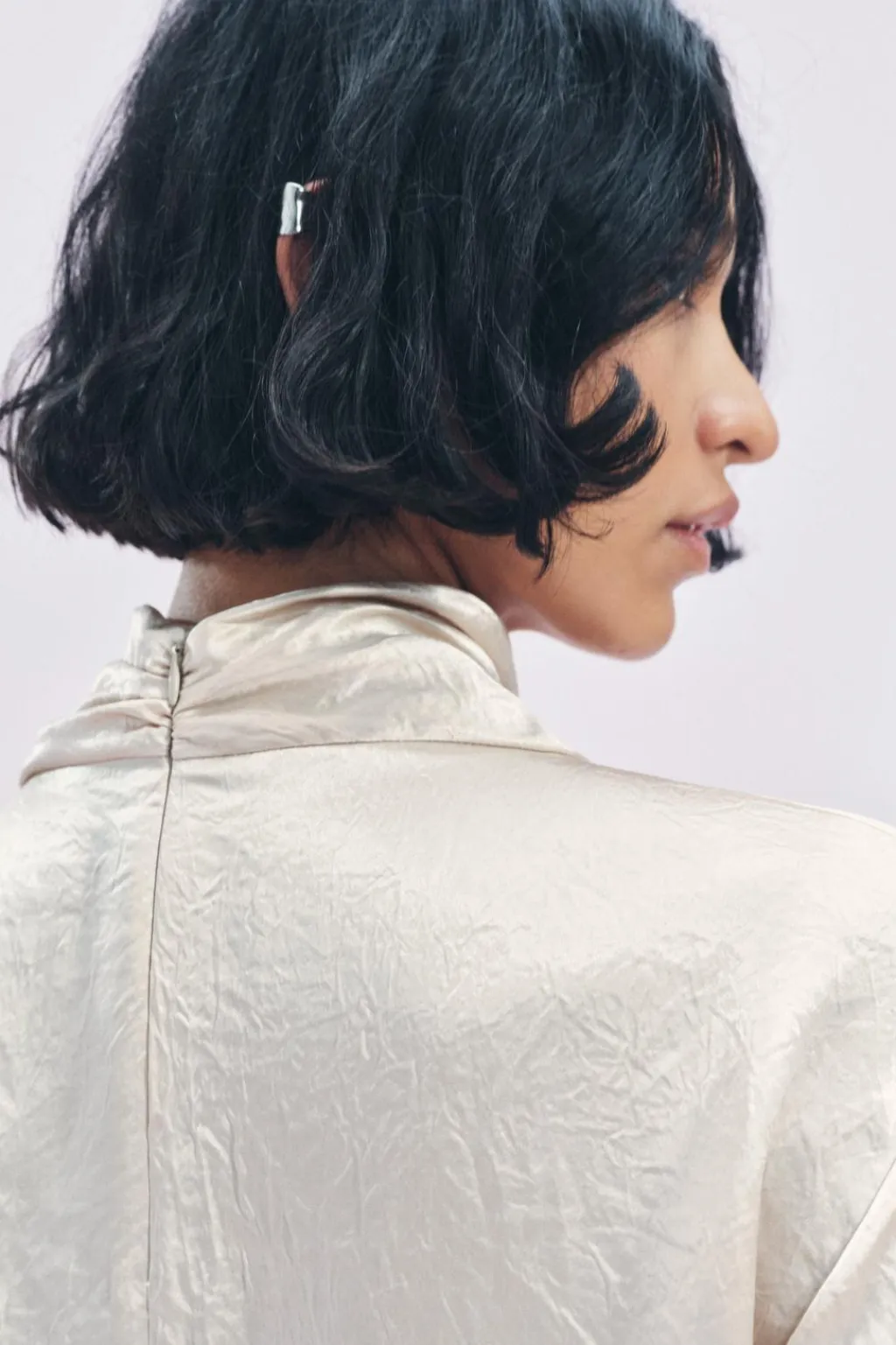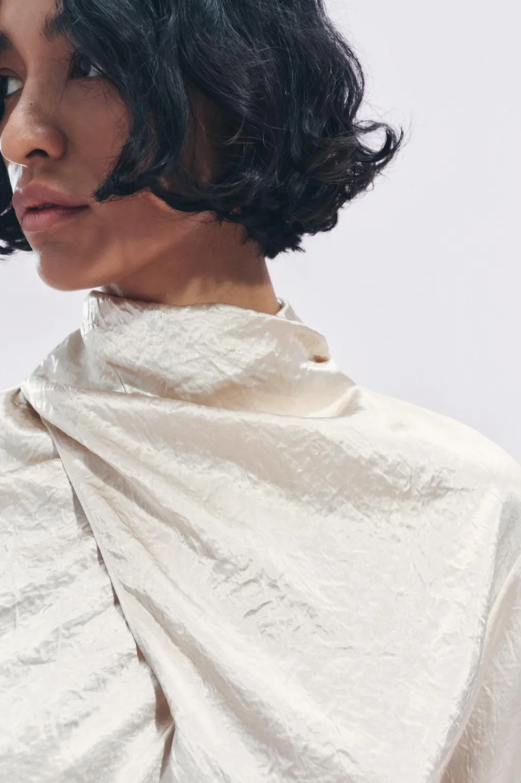 Top de cuello alto drapeado y manga larga. Detalle de tejido arrugado. Cierre en espalda con cremallera oculta en costura.