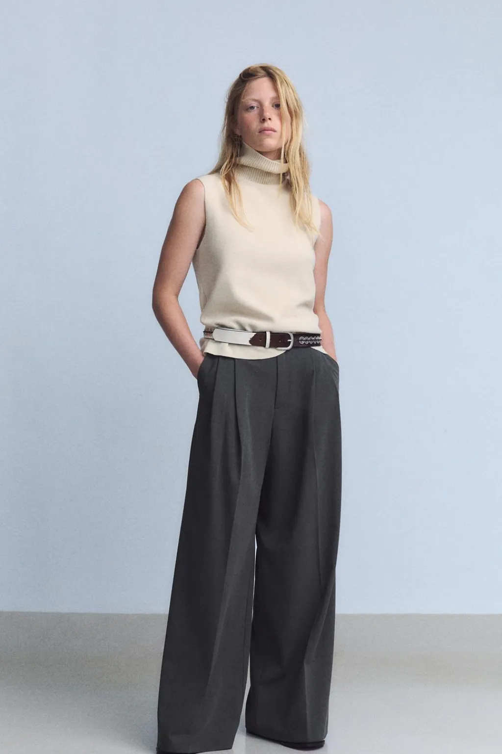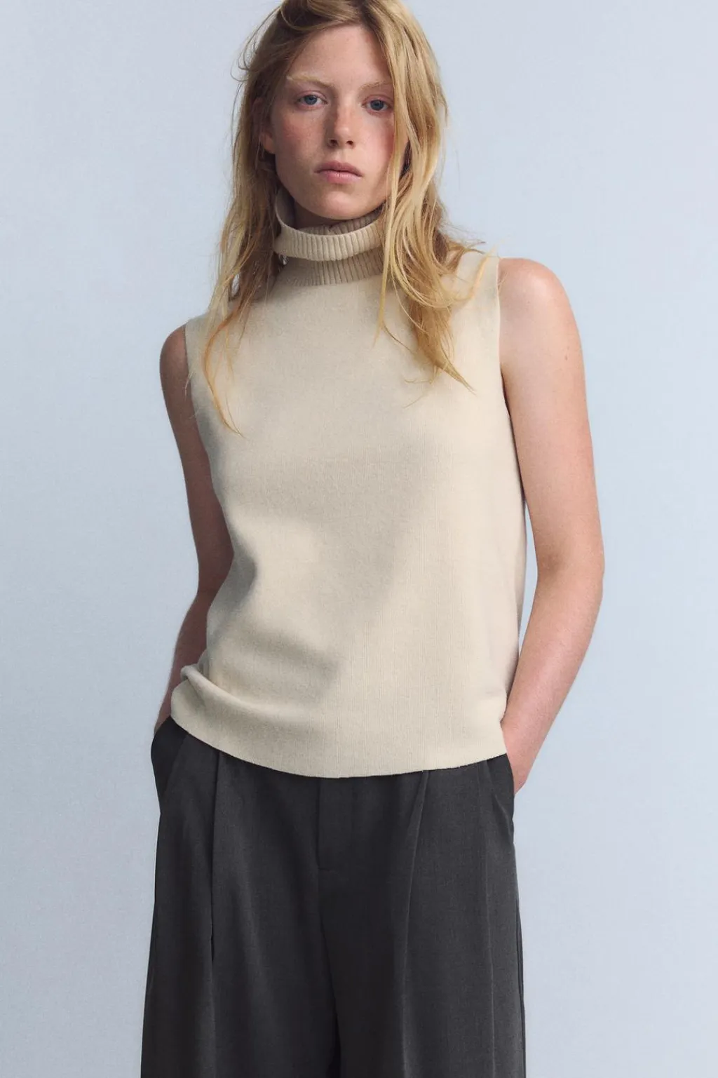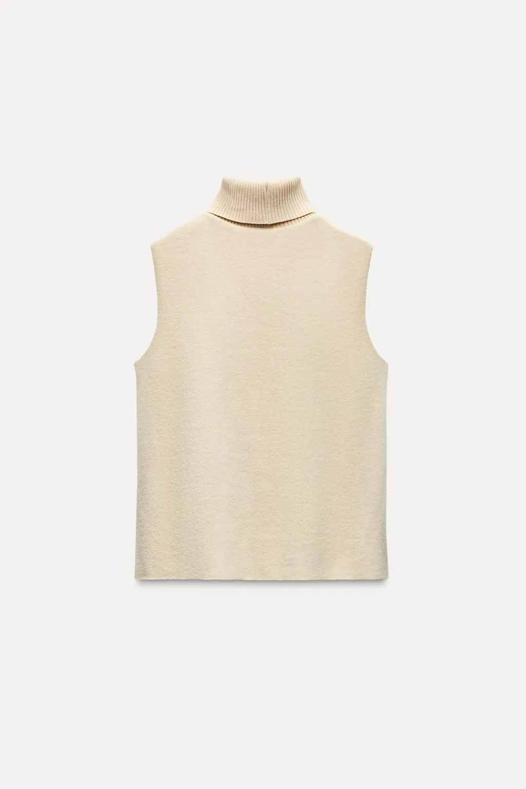 Top de cuello alto y manga sisa. Bajo acabado sin costura.
