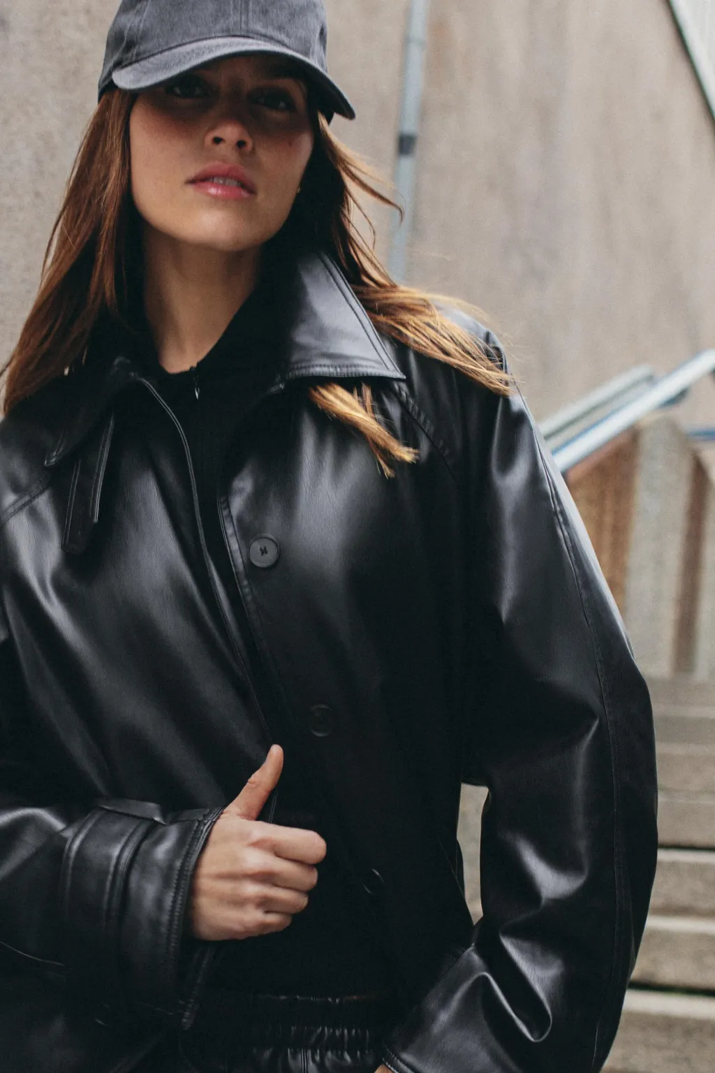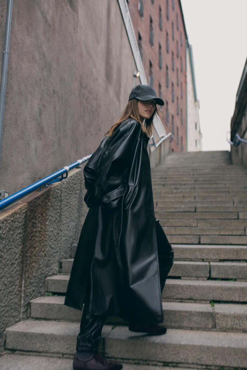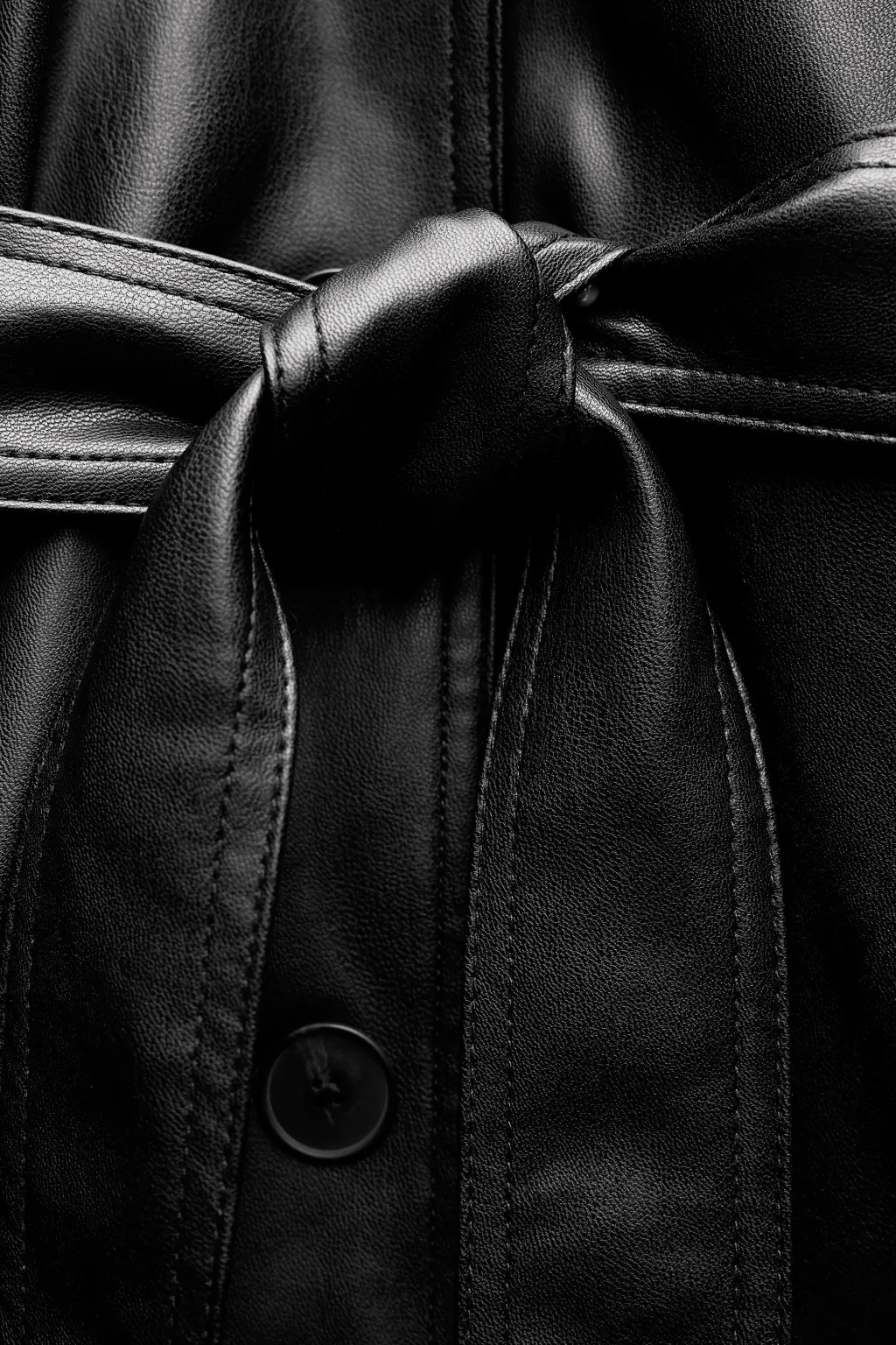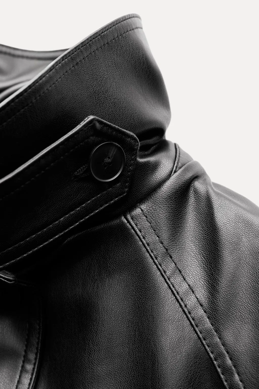 Trench de cuello solapa con trabilla confeccionado en tejido efecto piel. Manga larga con trabillas en puño. Bolsillos laterales. Forro interior combinado a tono. Bajo con abertura en espalda. Cierre frontal con botones.