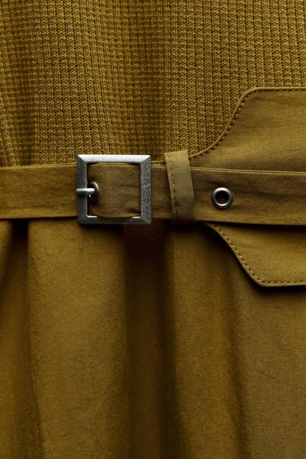 Vestido midi de escote redondo y manga larga. Cintura ajustable con hebilla metálica. Detalle de combinación de tejidos a tono. Bajo acabado en línea evasé.