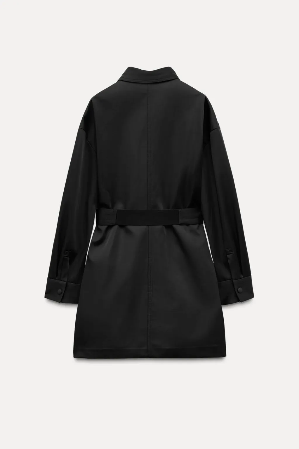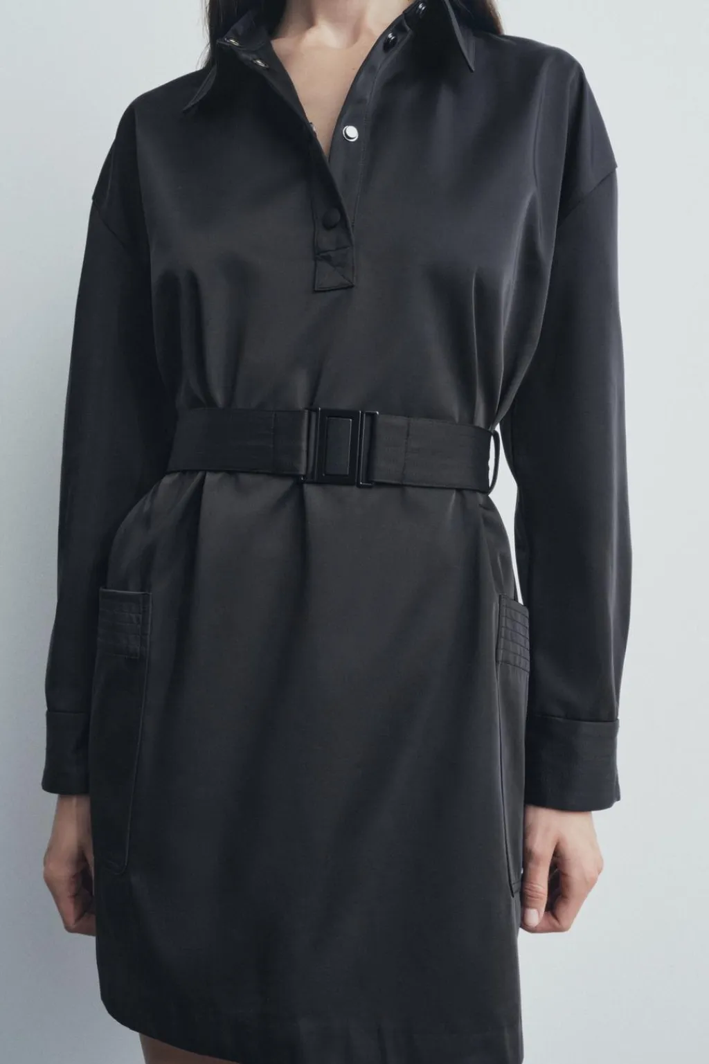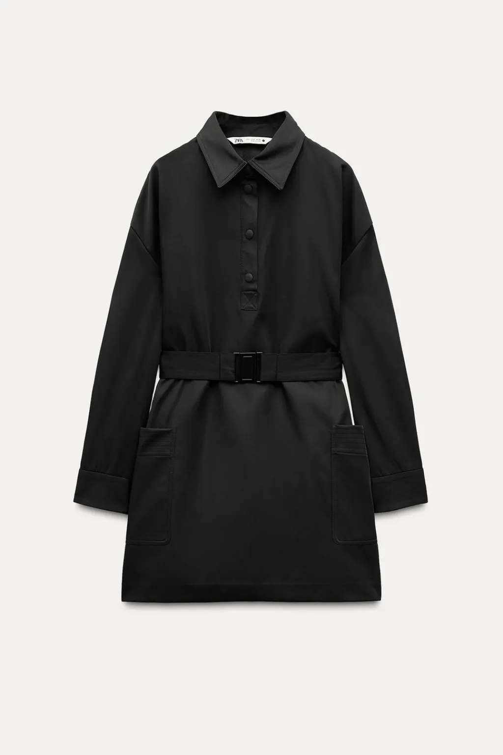 Vestido corto confeccionado en tejido tipo gabardina. Cuello solapa y manga larga acabada en puño. Bolsillos de plastrón en delantero. Cinturón en mismo tejido con hebilla metálica. Cierre frontal con botones.