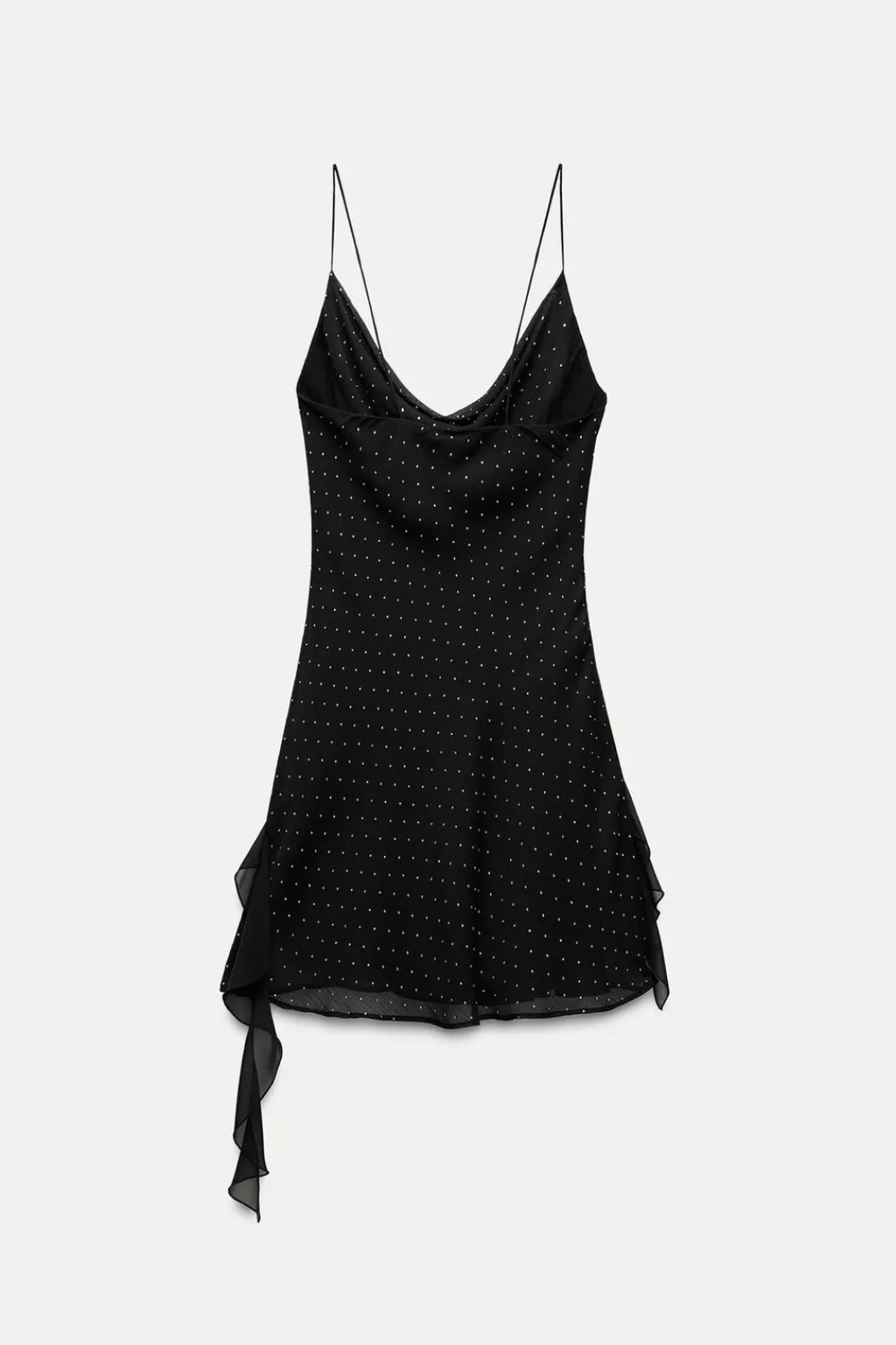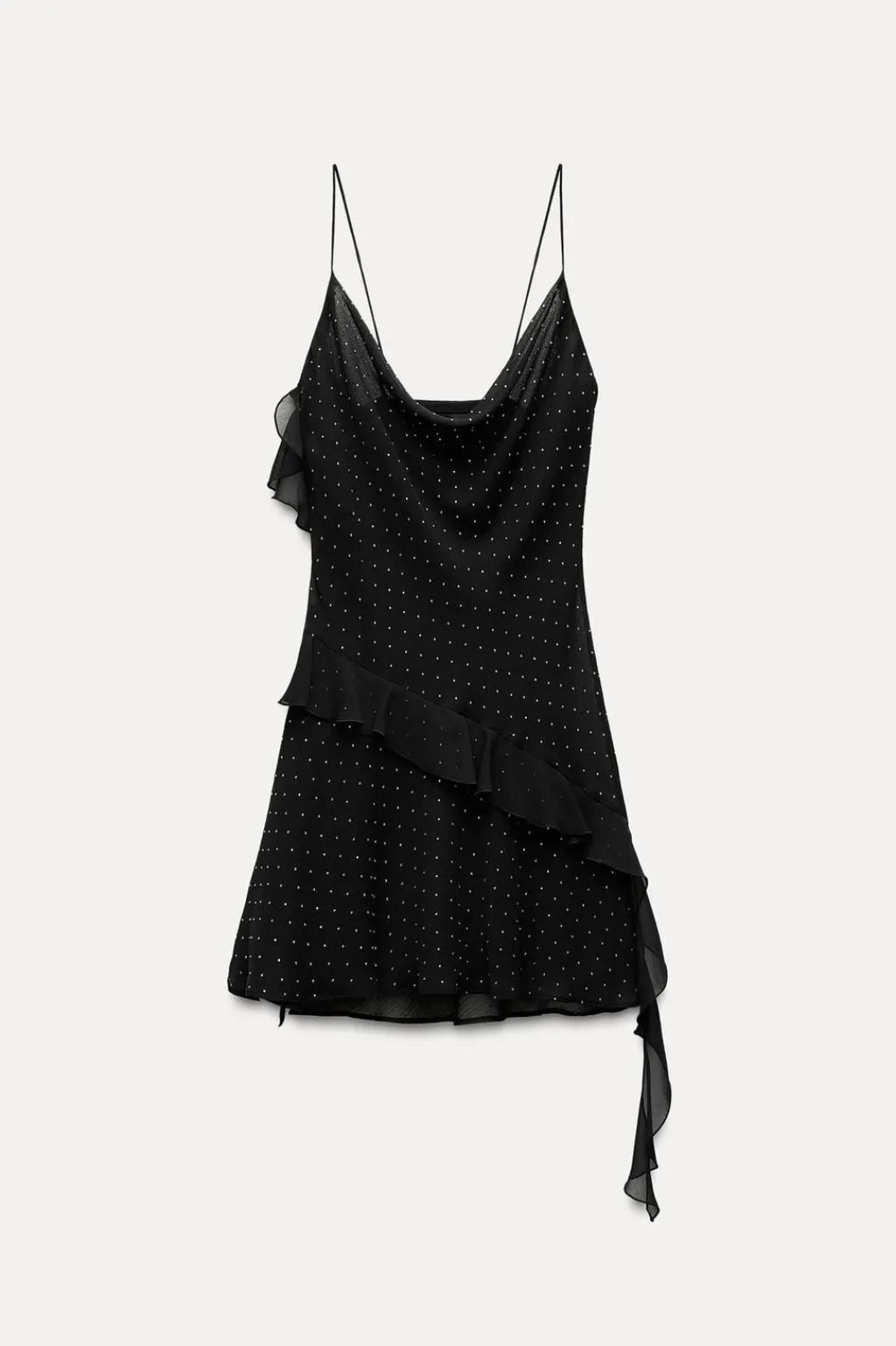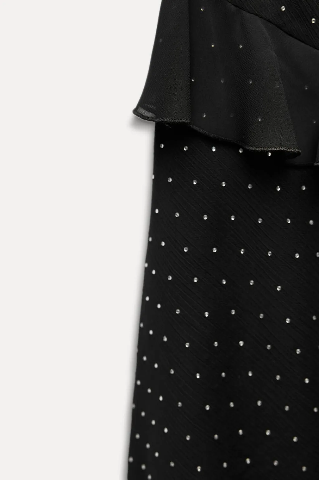 Vestido de escote fluido y tirantes finos. Detalle de acabados con volantes y tejido con brillos. Forro interior.