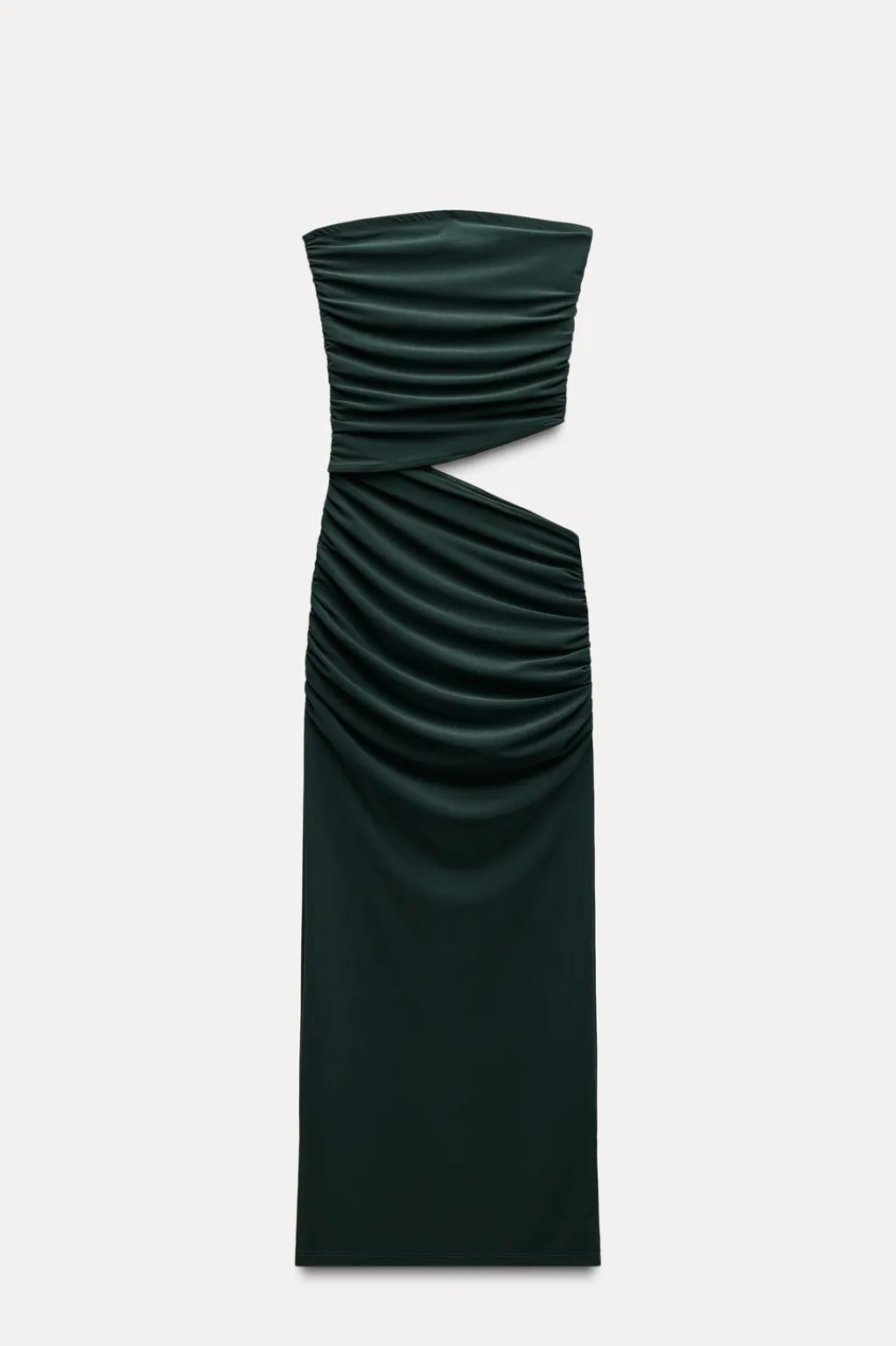 Vestido de escote recto y hombros descubiertos. Detalle de abertura en cintura. Tejido drapeado.