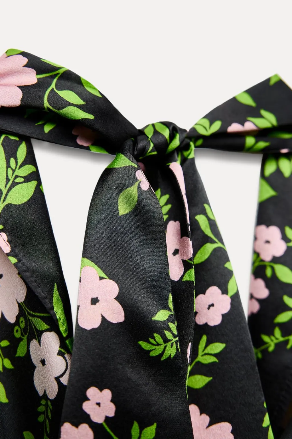 Vestido midi confeccionado en hilatura de seda 100%. Cuello halter fluido ajustable con lazadas. Detalle de superposición en mismo tejido tipo fajín ajustable con lazadas. Espalda descubierta. Cierre con cremallera oculta en costura.