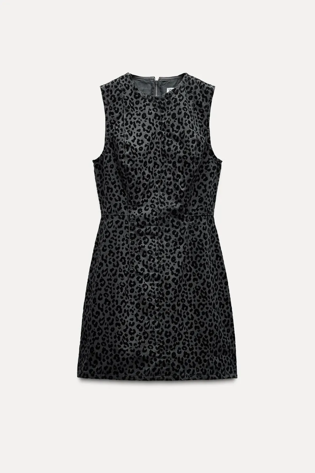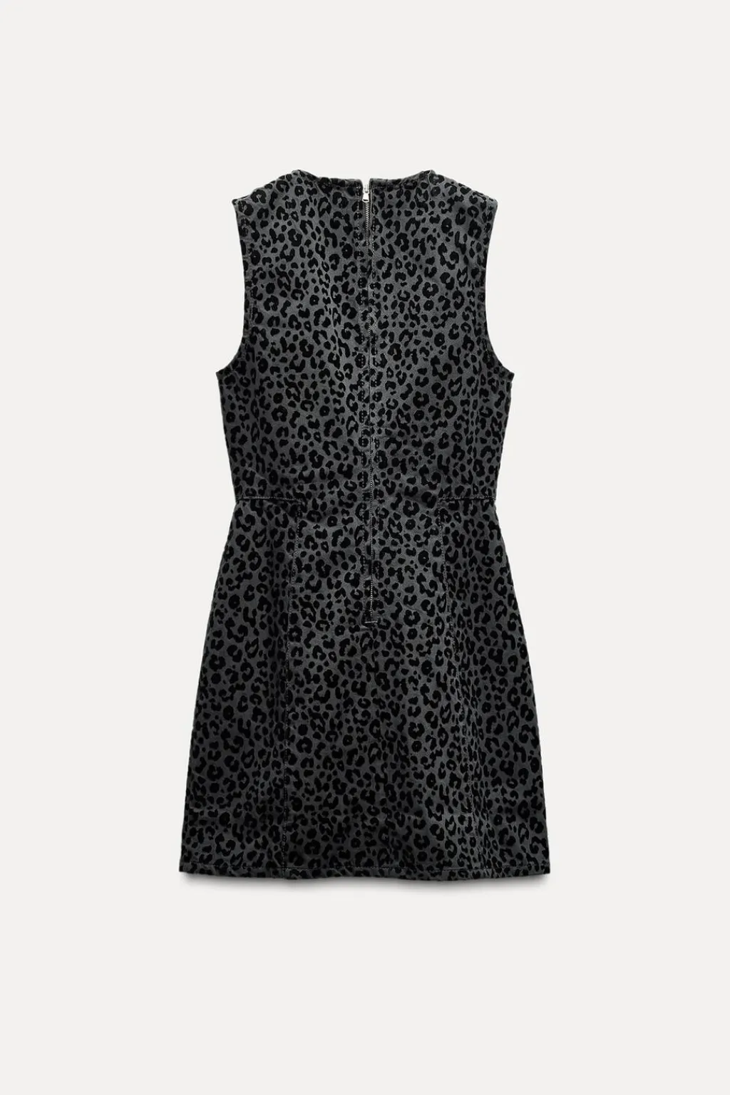Vestido corto de cuello redondo y manga sisa. Detalle de manchas efecto animal flocadas. Cierre en espalda con cremallera oculta en costura.