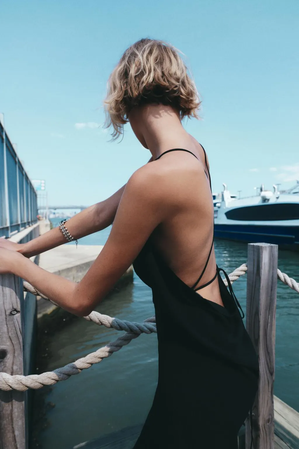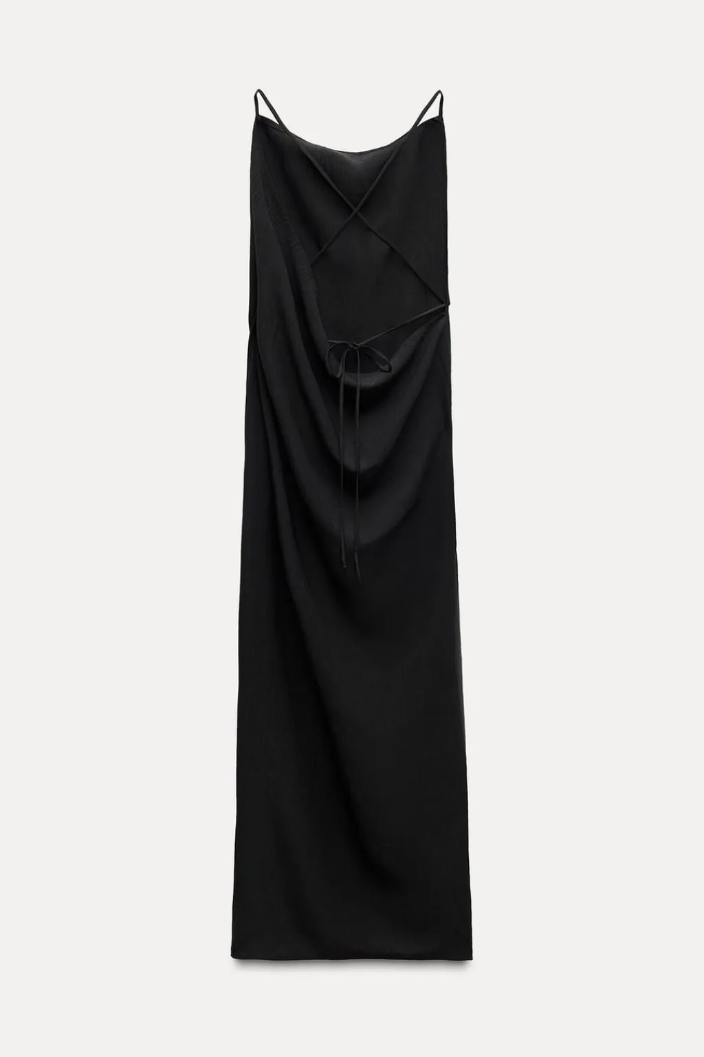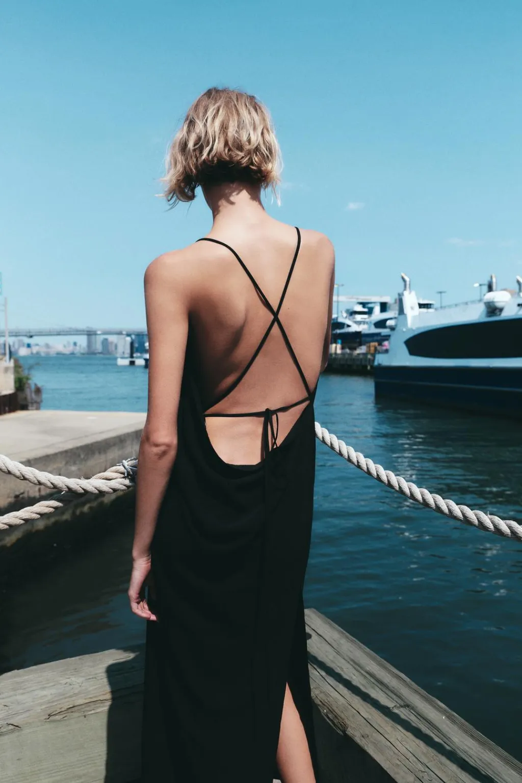 Vestido midi de escote asimétrico y tirantes finos. Espalda descubierta.