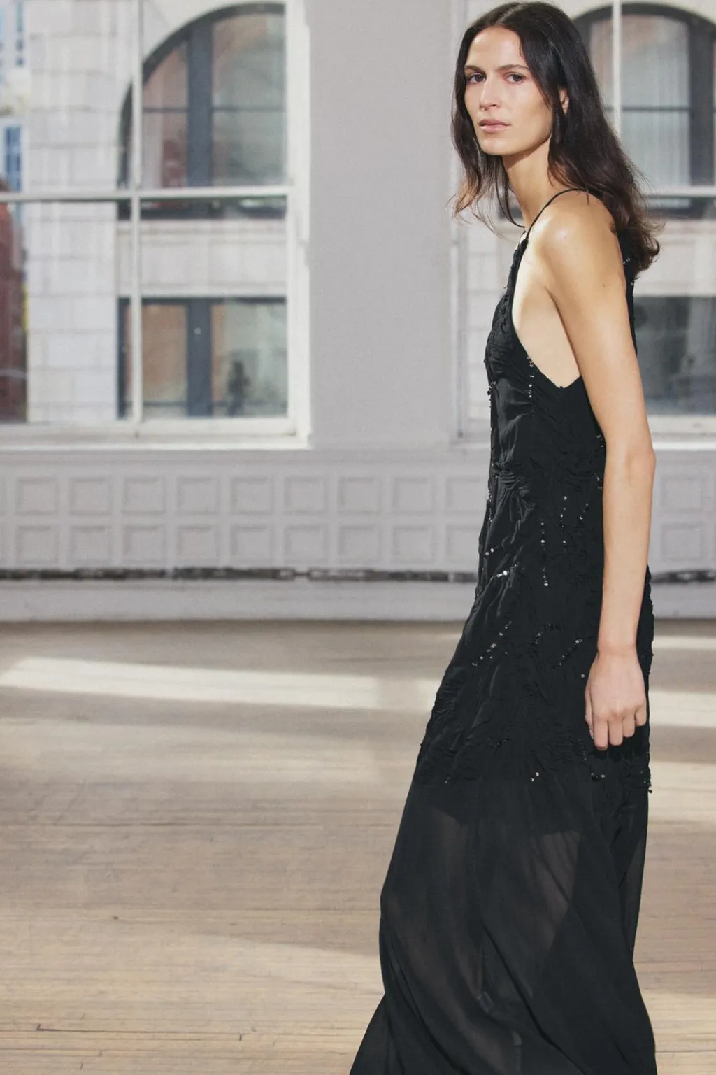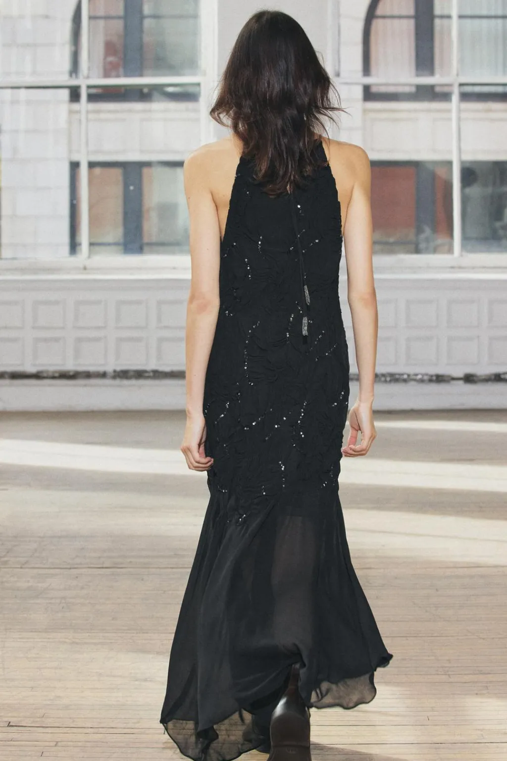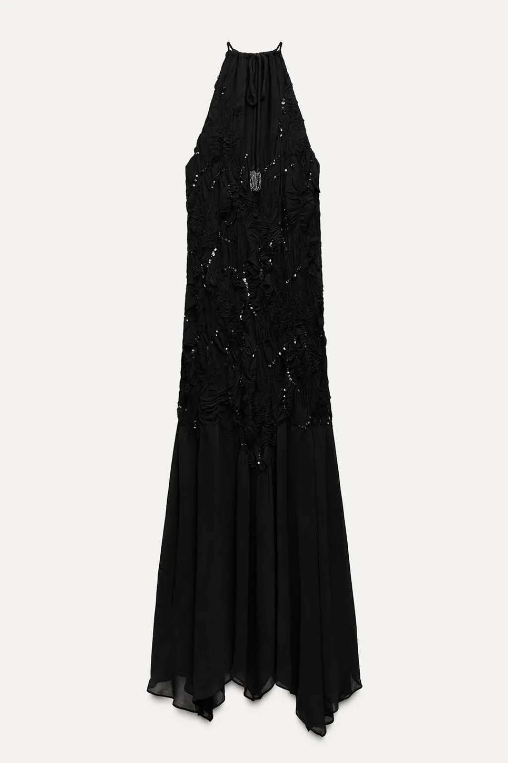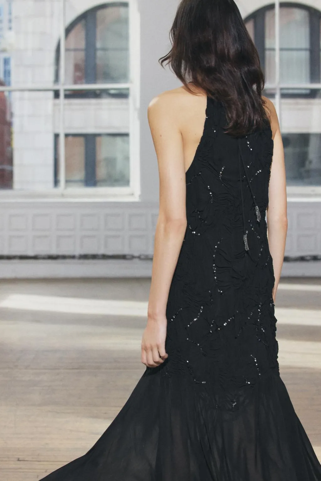 Vestido confeccionado en hilatura de viscosa. Cuello halter y hombros descubiertos. Detalle de aplicación de lentejuelas. Bajo asimétrico. Cierre en espalda con botón.