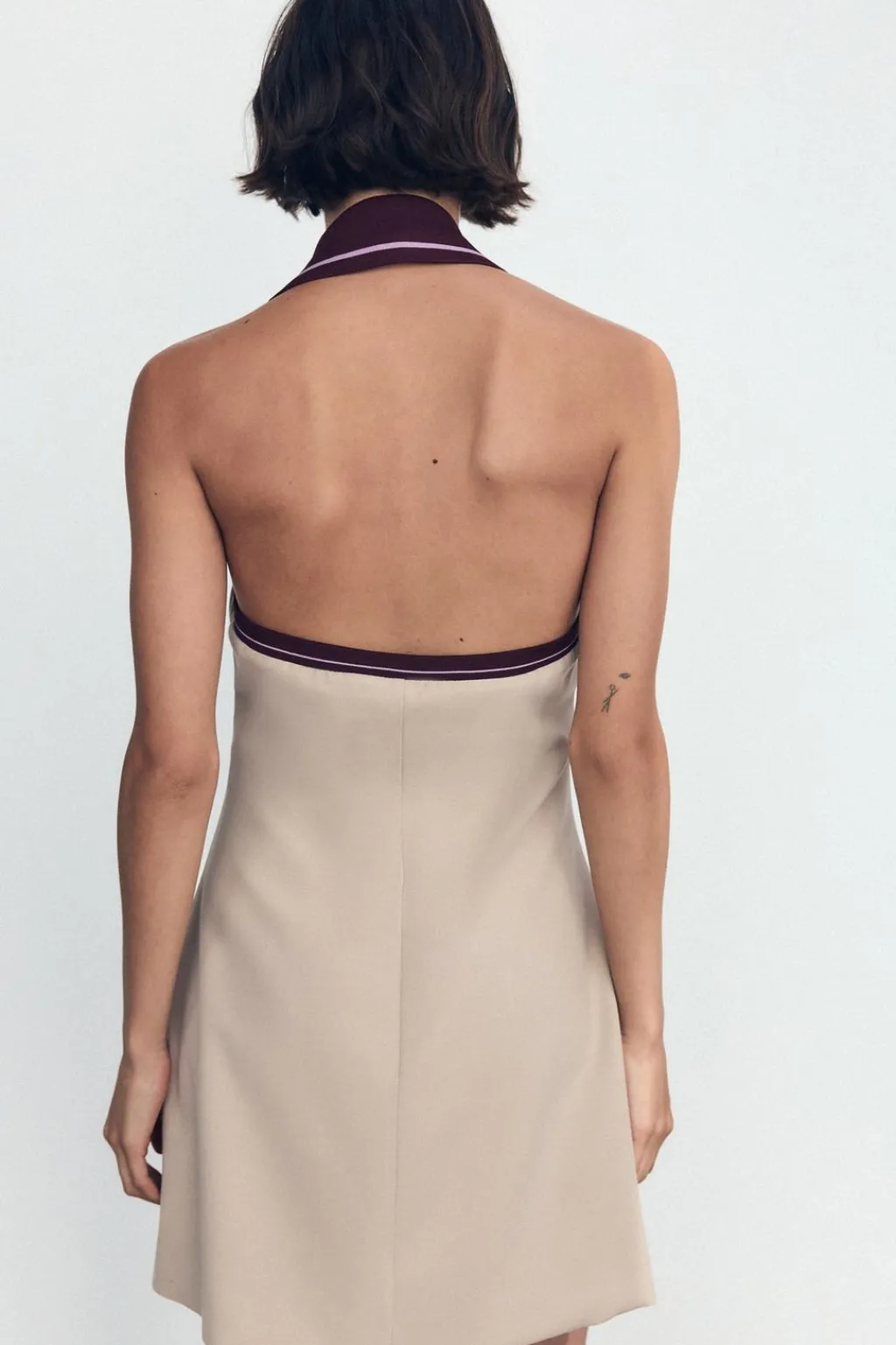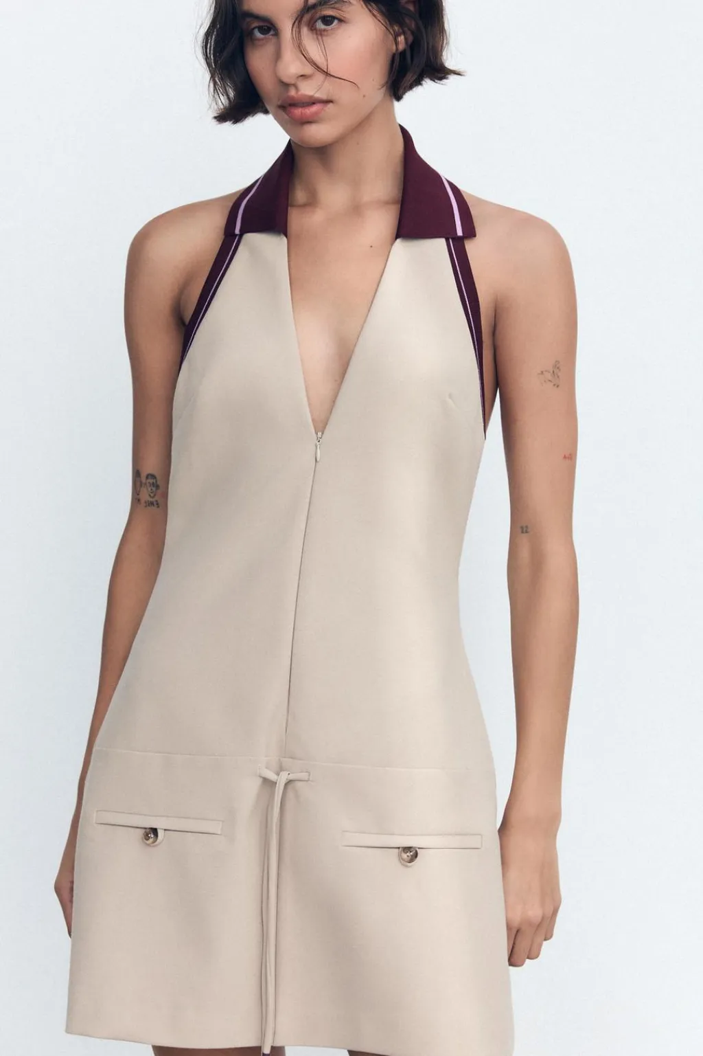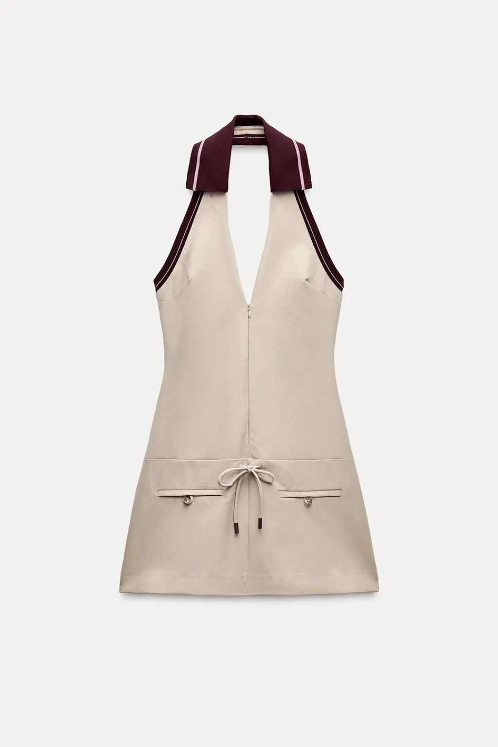 Vestido corto de cuello halter con solapa y escote pico. Tejido combinado en rib con raya. Falsos bolsillos de vivo en delantero. Espalda descubierta. Forro interior. Cierre frontal con cremallera oculta en costura.