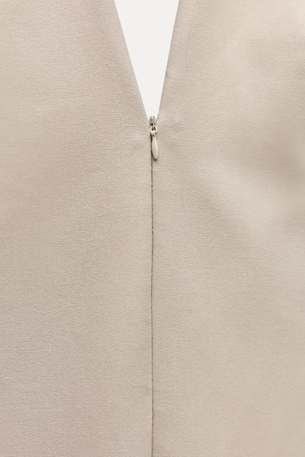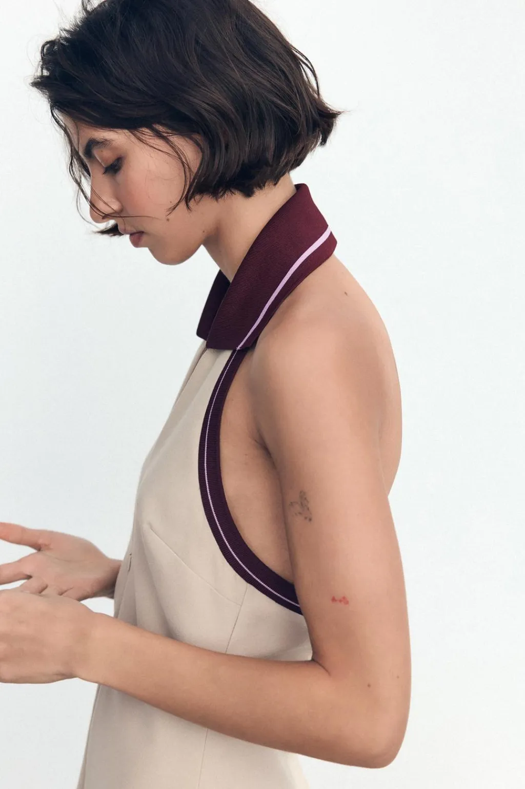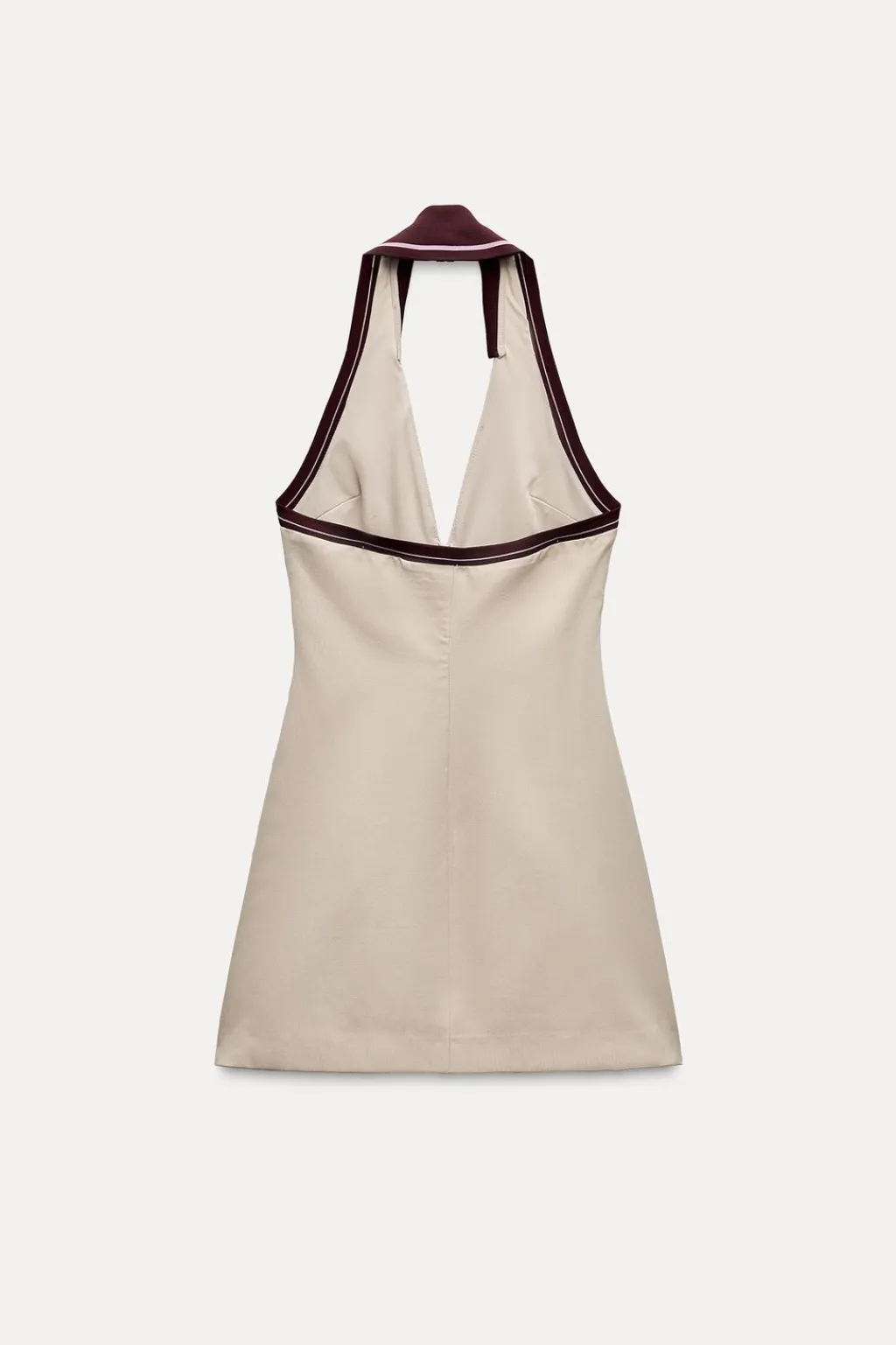 Vestido corto de cuello halter con solapa y escote pico. Tejido combinado en rib con raya. Falsos bolsillos de vivo en delantero. Espalda descubierta. Forro interior. Cierre frontal con cremallera oculta en costura.