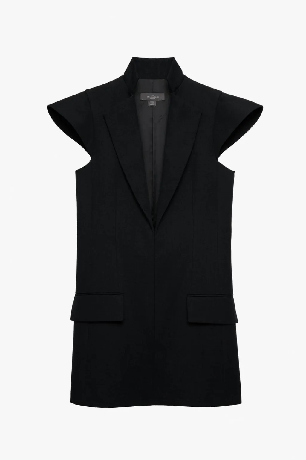 Vestido corto confeccionado en hilatura de lana 100%. Cuello solapa de muescas y escote pico. Manga corta con hombreras. Bolsillos con solapa en delantero. Forro interior a tono.