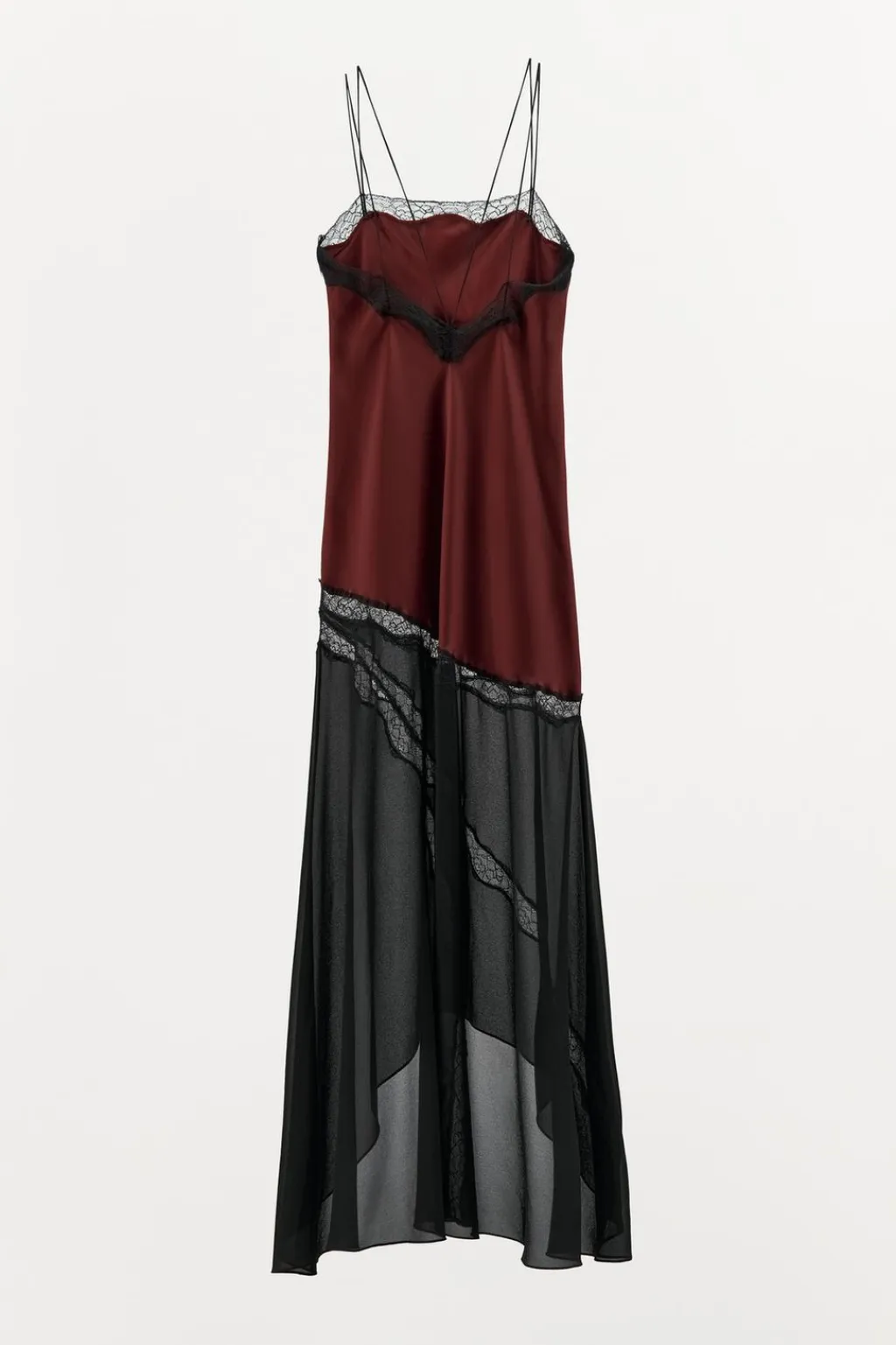 Vestido largo de escote recto y tirantes finos. Detalle combinación de tejidos y aplicación de encaje combinado a contraste. Bajo asimétrico.