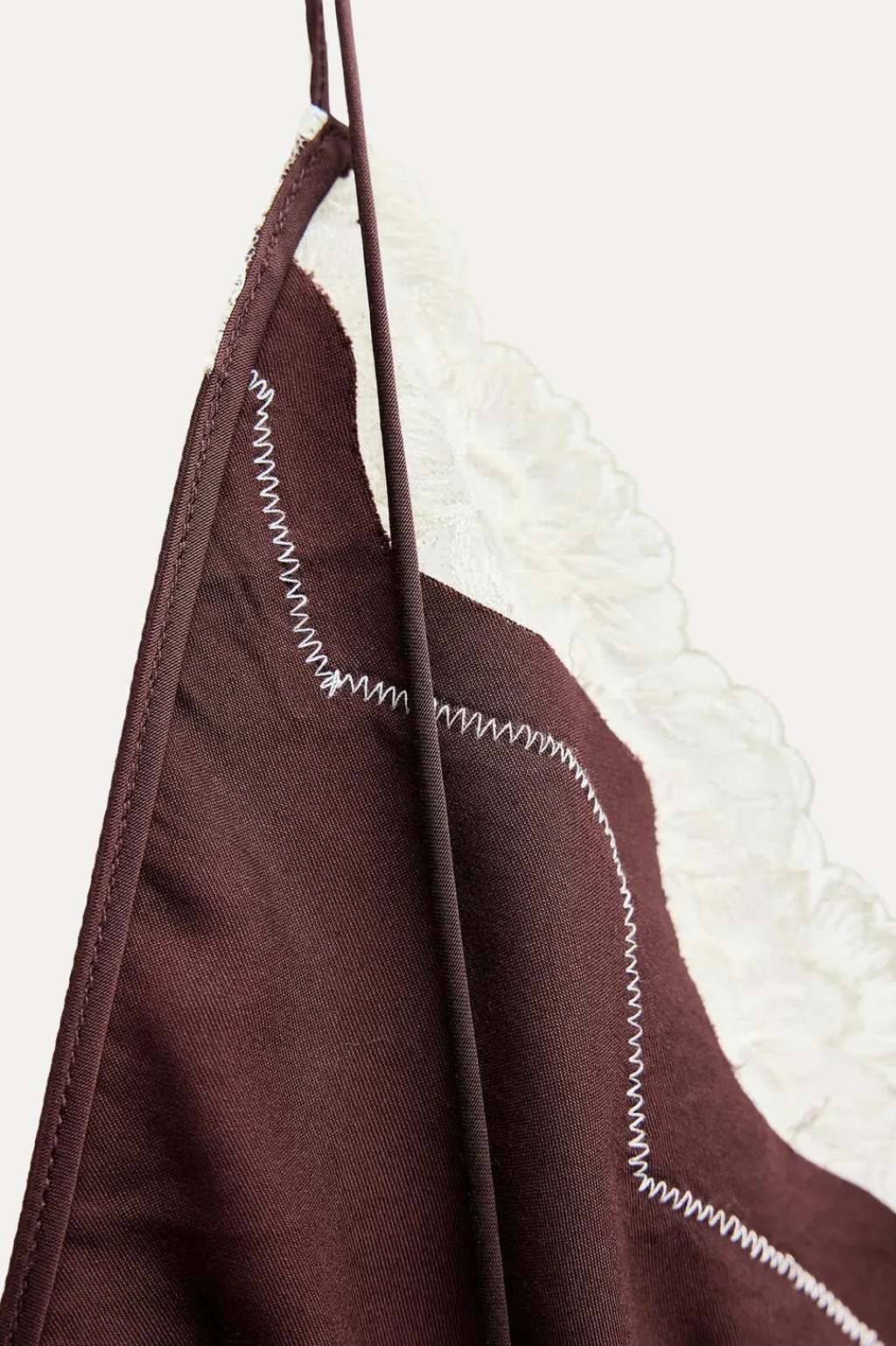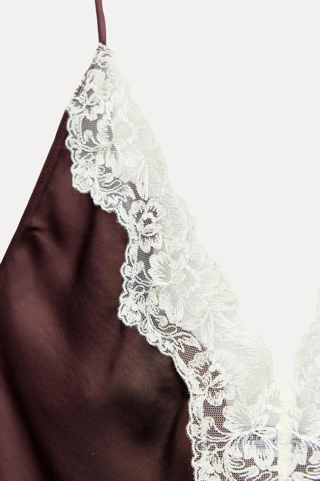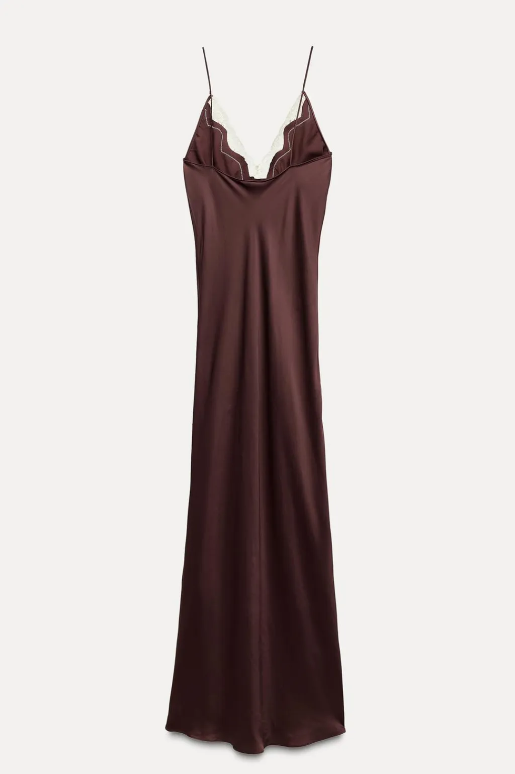 Vestido largo de escote pico y tirantes finos. Detalle de aplicación de encaje a contraste. Bajo acabado en línea evasé.
