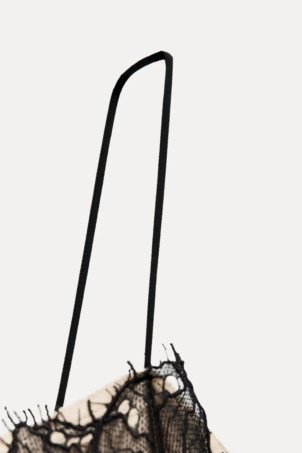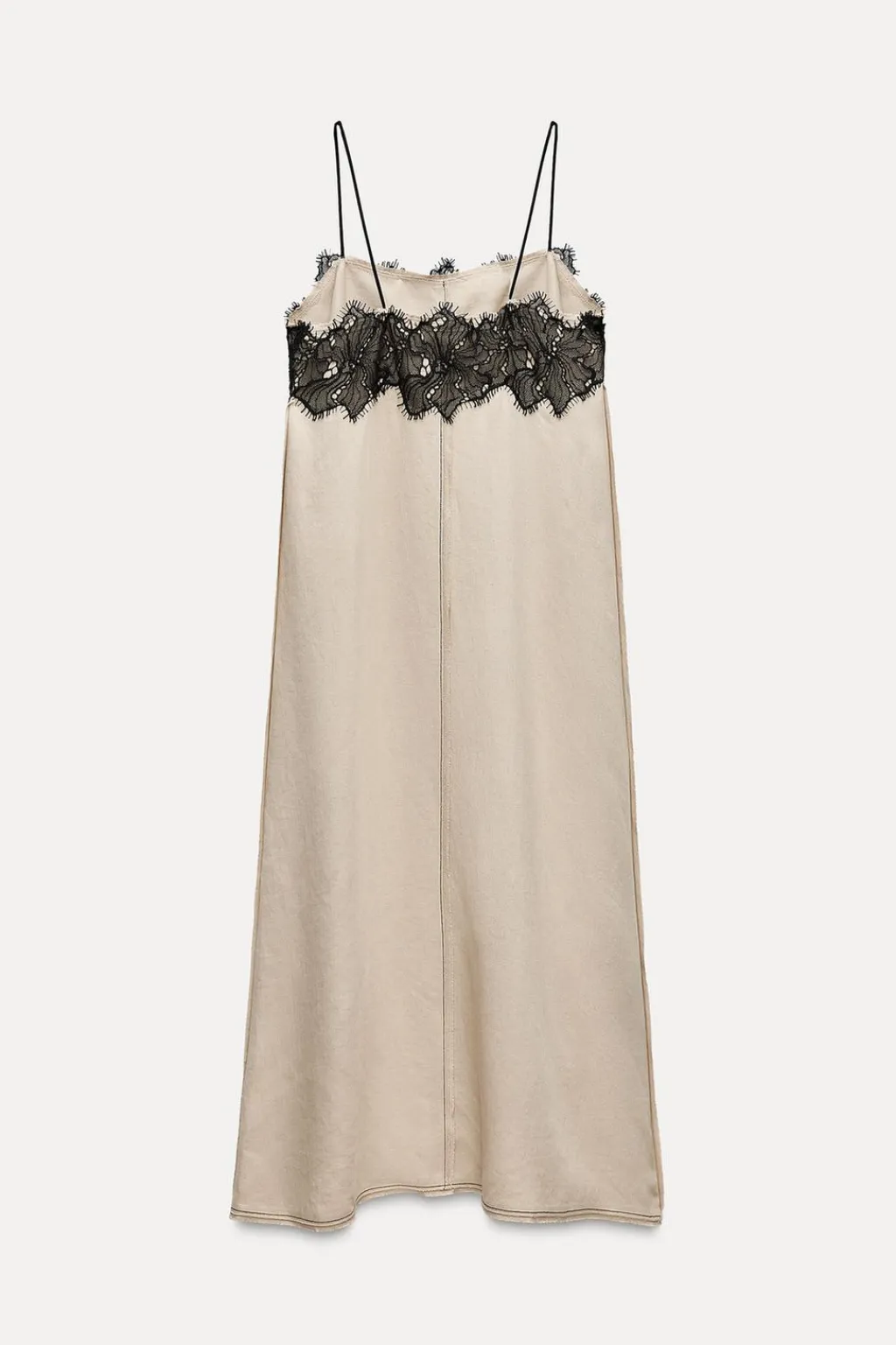 Vestido midi confeccionado en hilatura con mezcla de lino. Escote recto y tirantes finos. Detalle de pespuntes marcados y aplicación de puntilla a contraste. Bajo acabado en línea evasé.