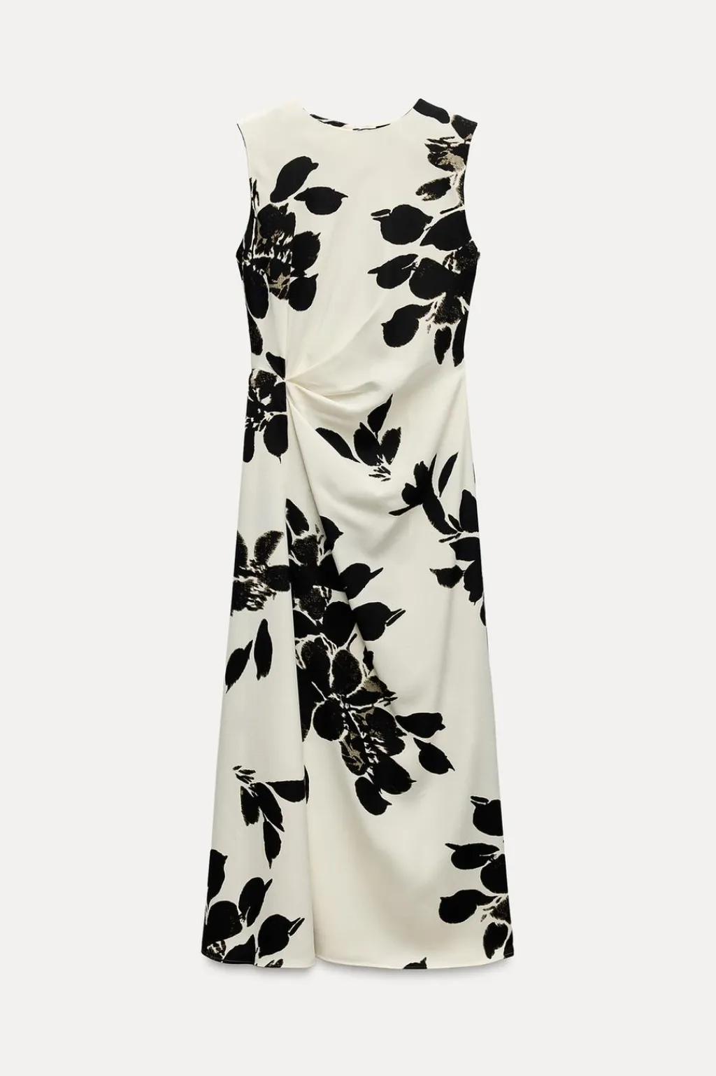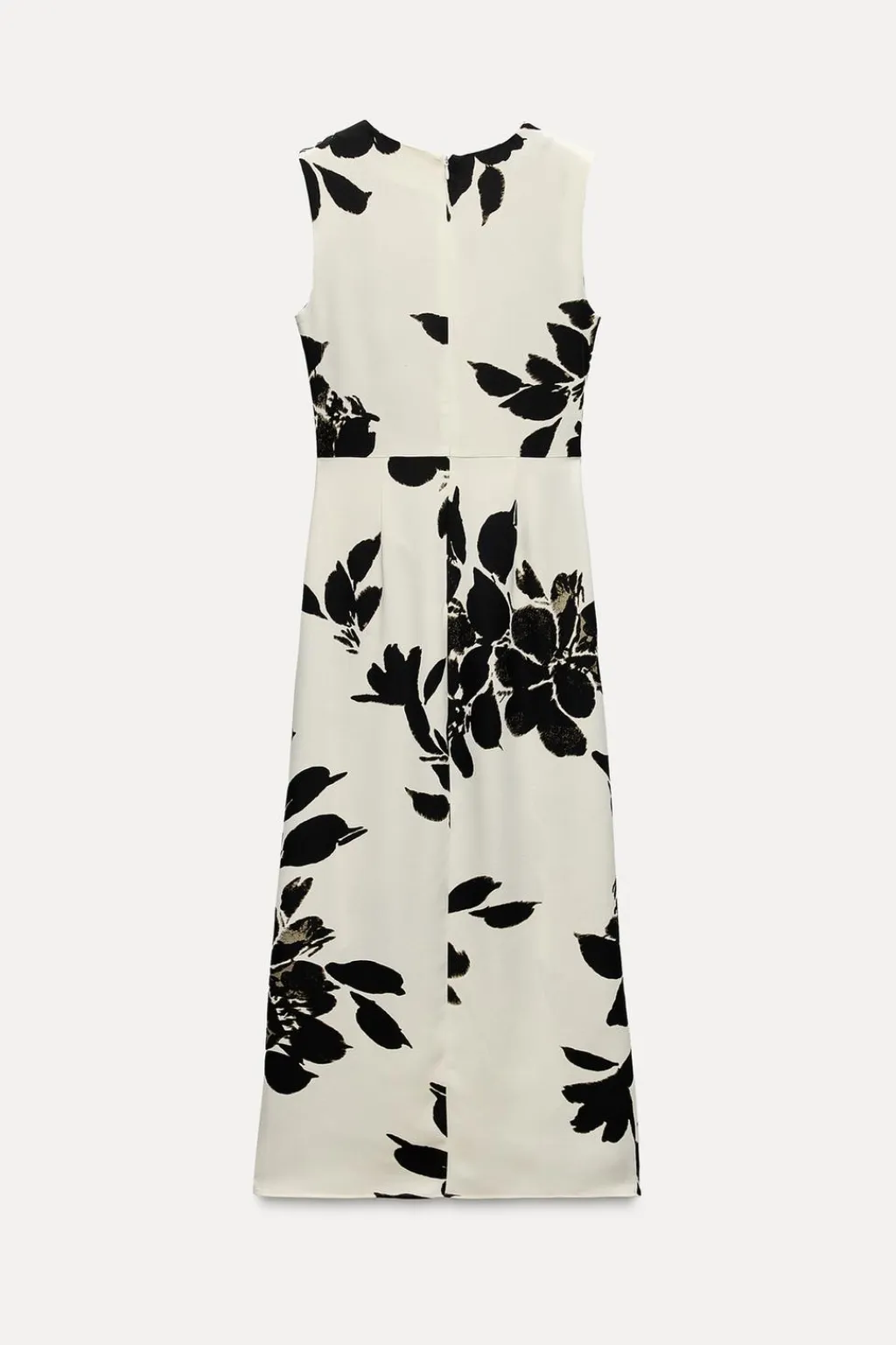 Vestido de cuello redondo y manga sisa. Detalle de frunces delanteros en cintura. Cierre en espalda con cremallera oculta en costura.