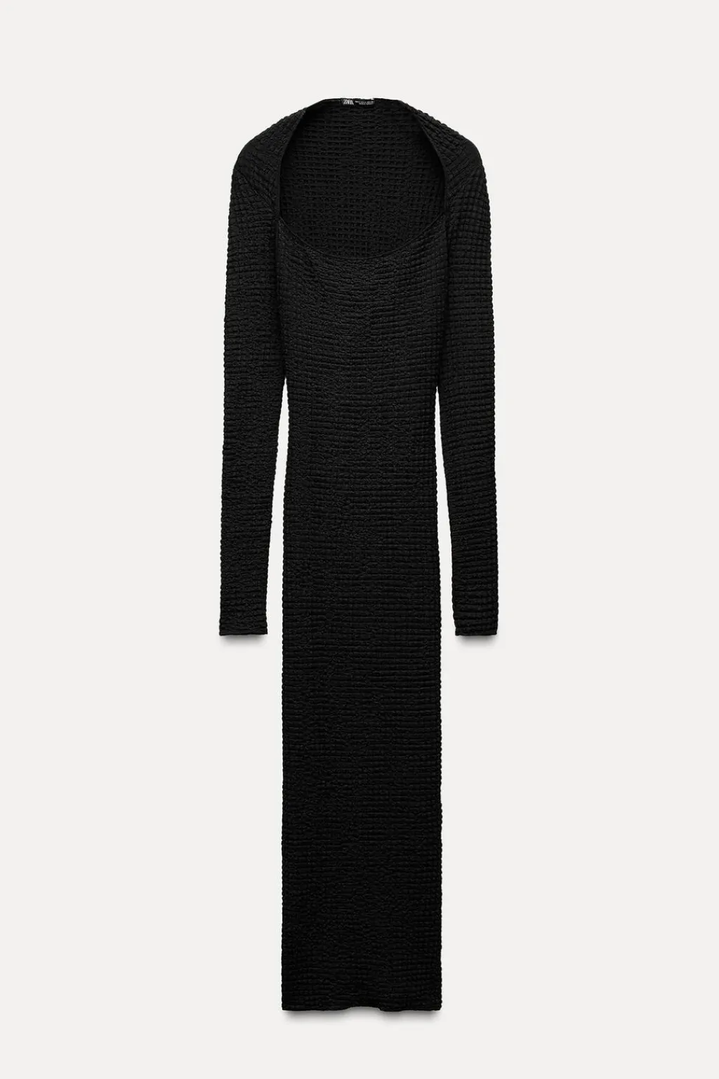 Vestido midi de escote cuadrado y manga larga. Detalle de tejido con textura.