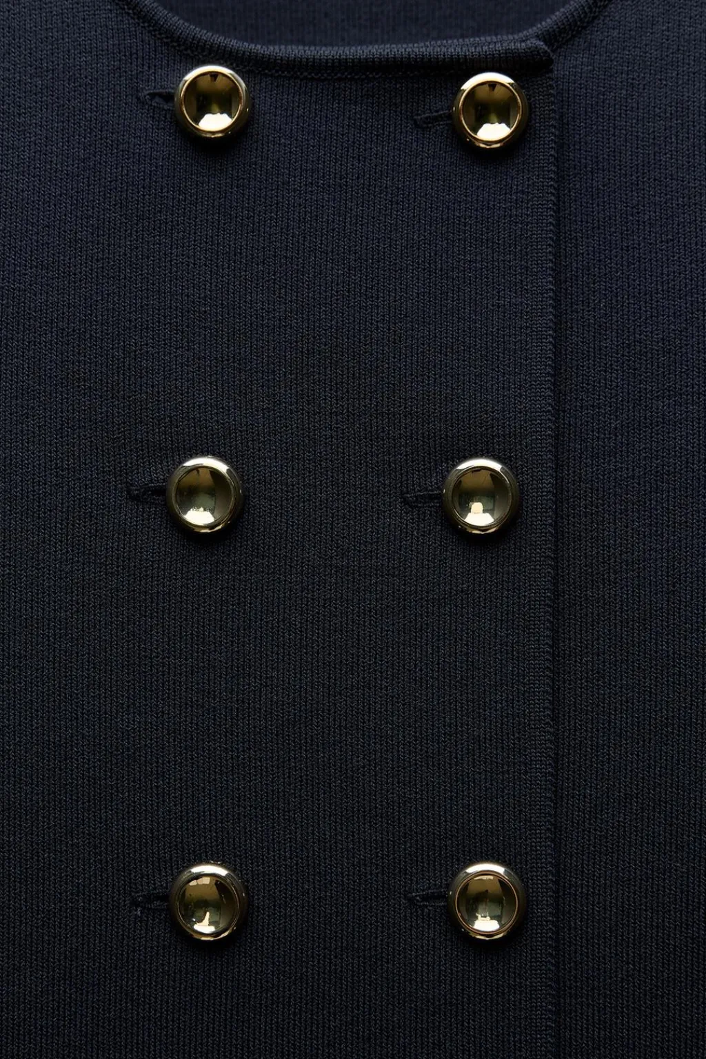 Vestido de punto liso con cuello redondo y manga larga. Cierre frontal cruzado con botones.