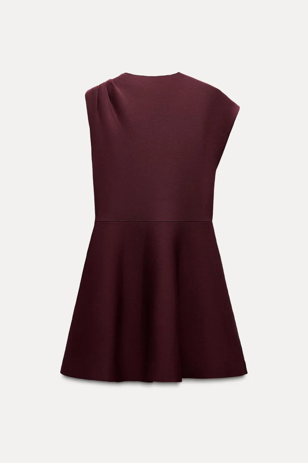Vestido de cuello redondo y manga asimétrica con pliegues en hombro. Bajo en evasé.