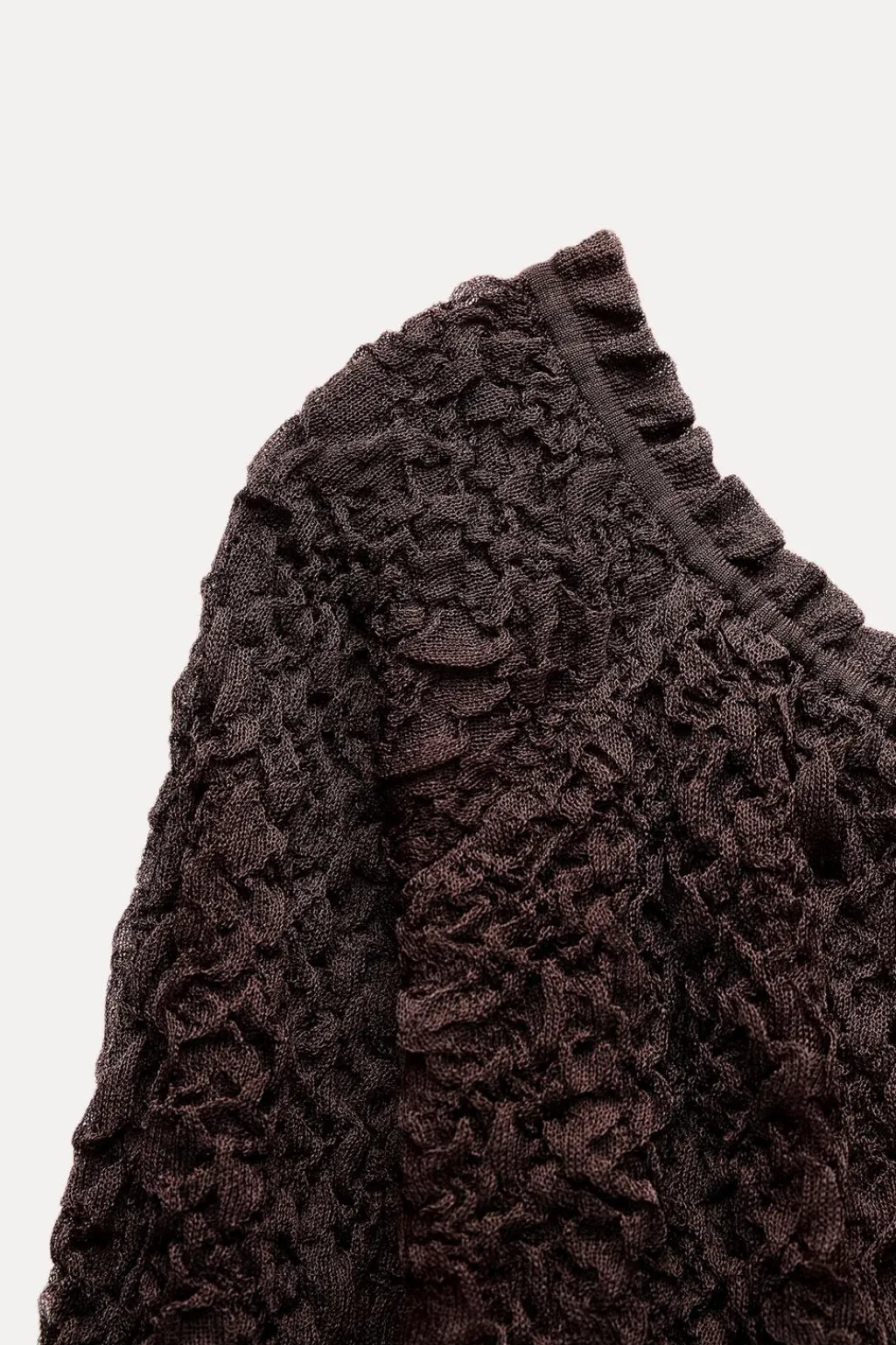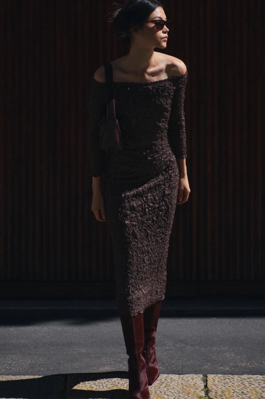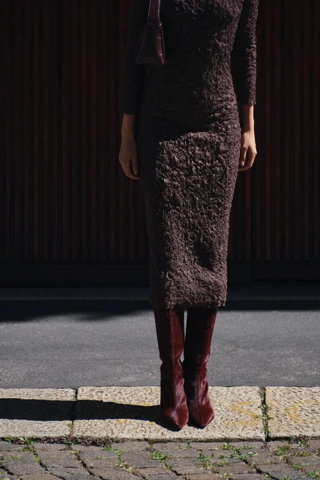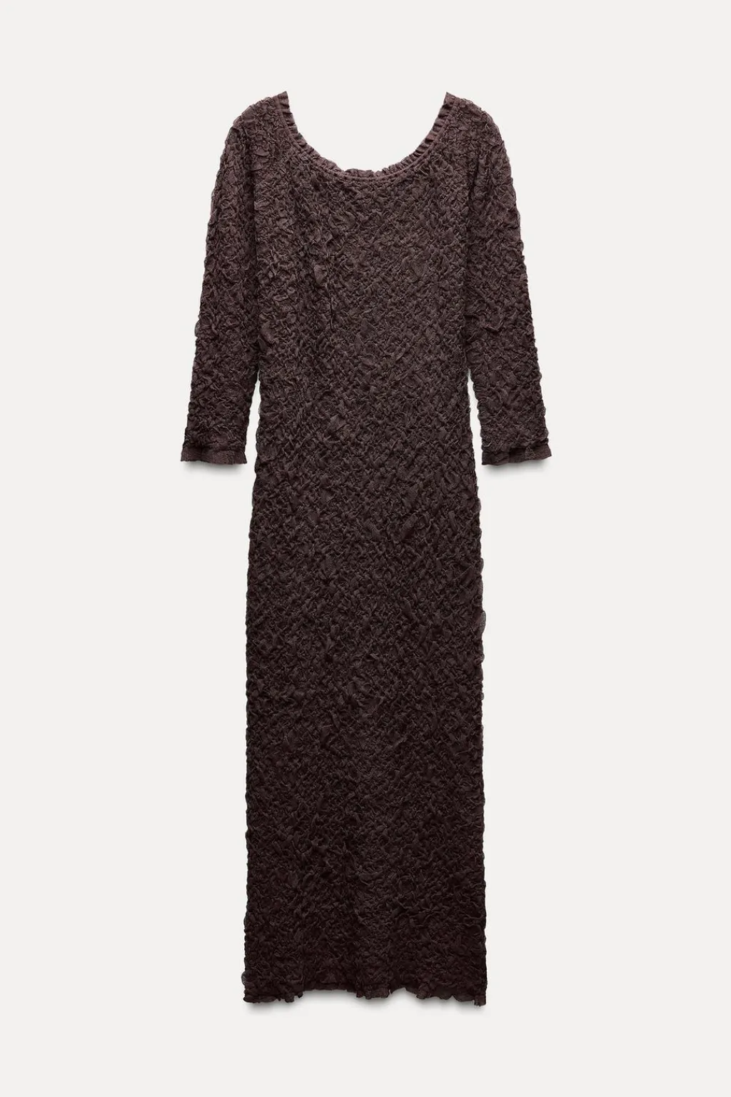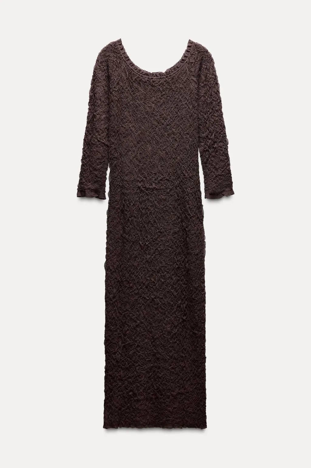 Vestido de cuello redondo amplio y manga larga. Detalle de tejido con textura.
