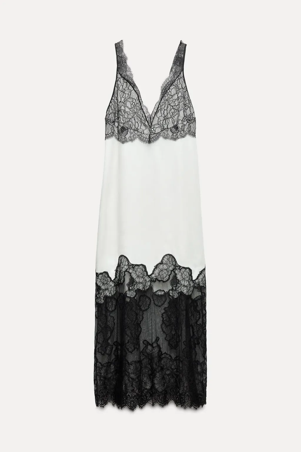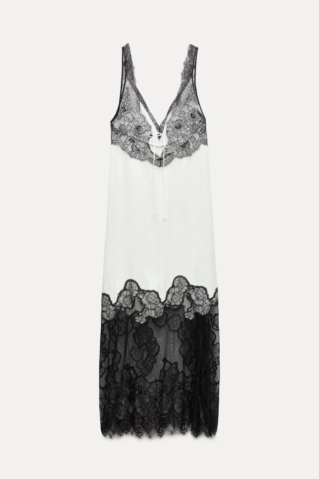 Vestido midi confeccionado en hilatura con viscosa 29%. Escote pico y tirantes anchos. Detalle de aplicación de puntilla a contraste.