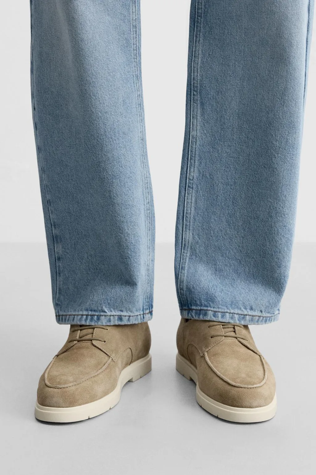 Zapato tipo derby. Parte superior fabricada en piel con acabado serraje. Detalle de bordón. Cordonera con tres pasados. Suela a contraste.