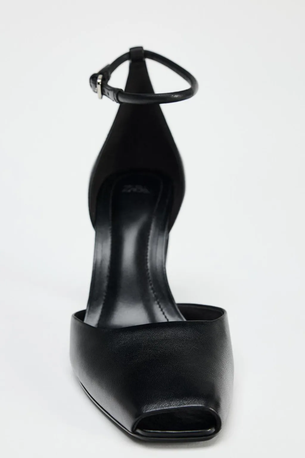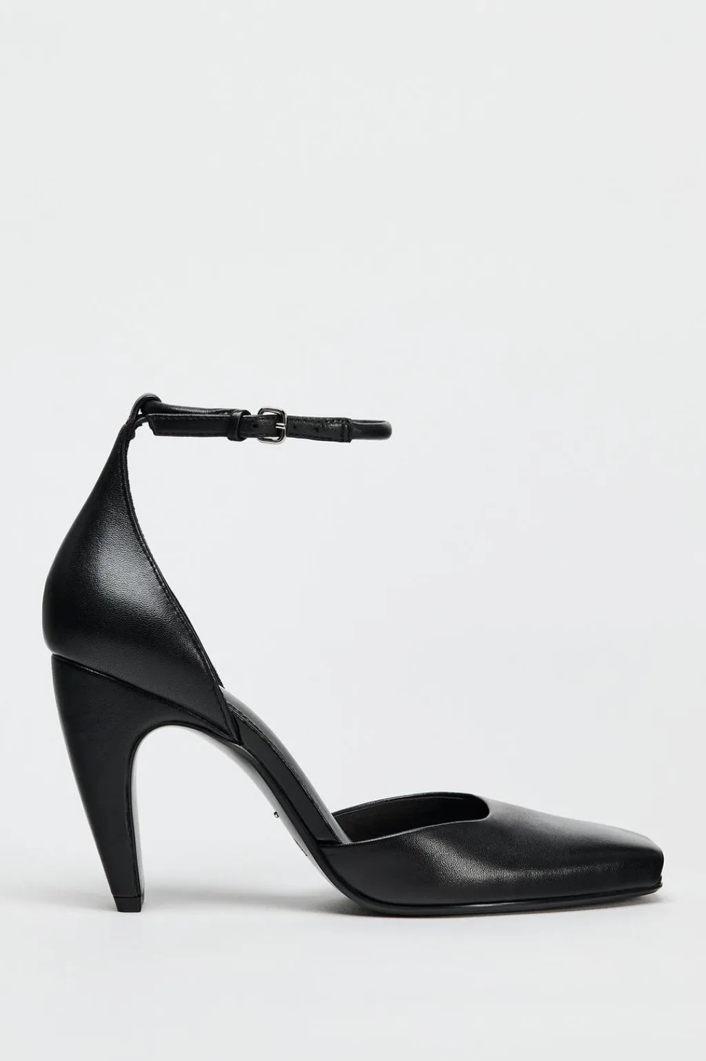 Zapato de tacón curvado en piel. Cierre mediante pulsera con hebilla al tobillo. Acabado en punta cuadrada.