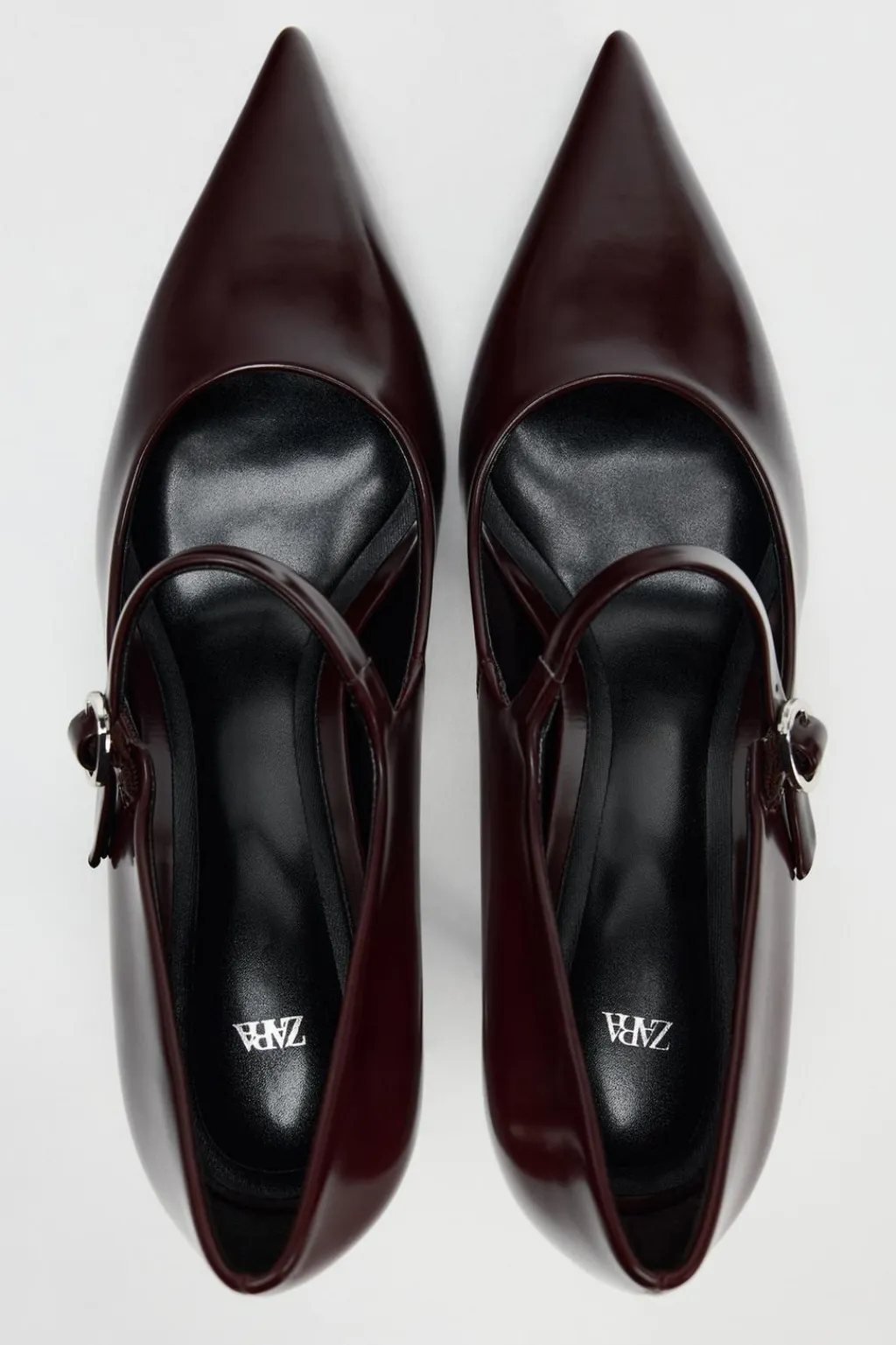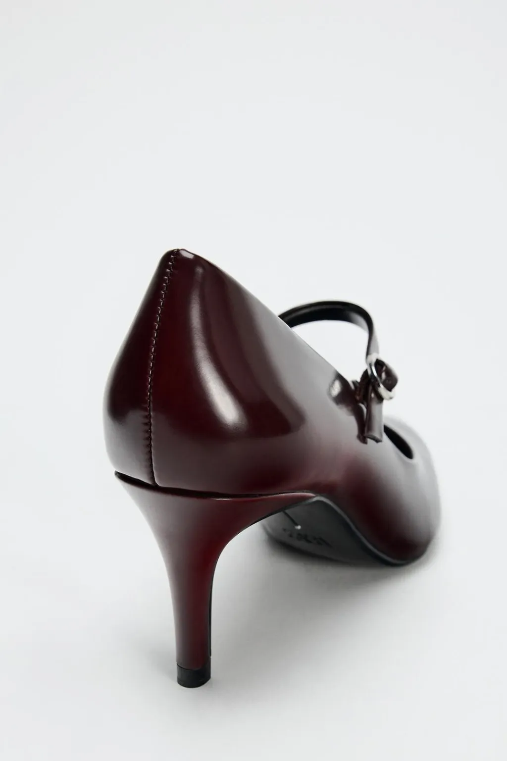 Zapato tacón fino. Detalle de hebilla en el empeine. Acabado en punta.