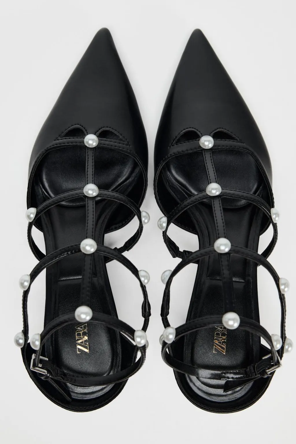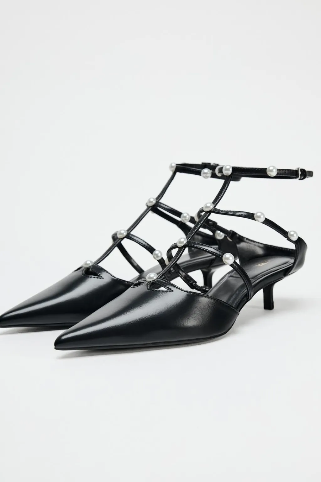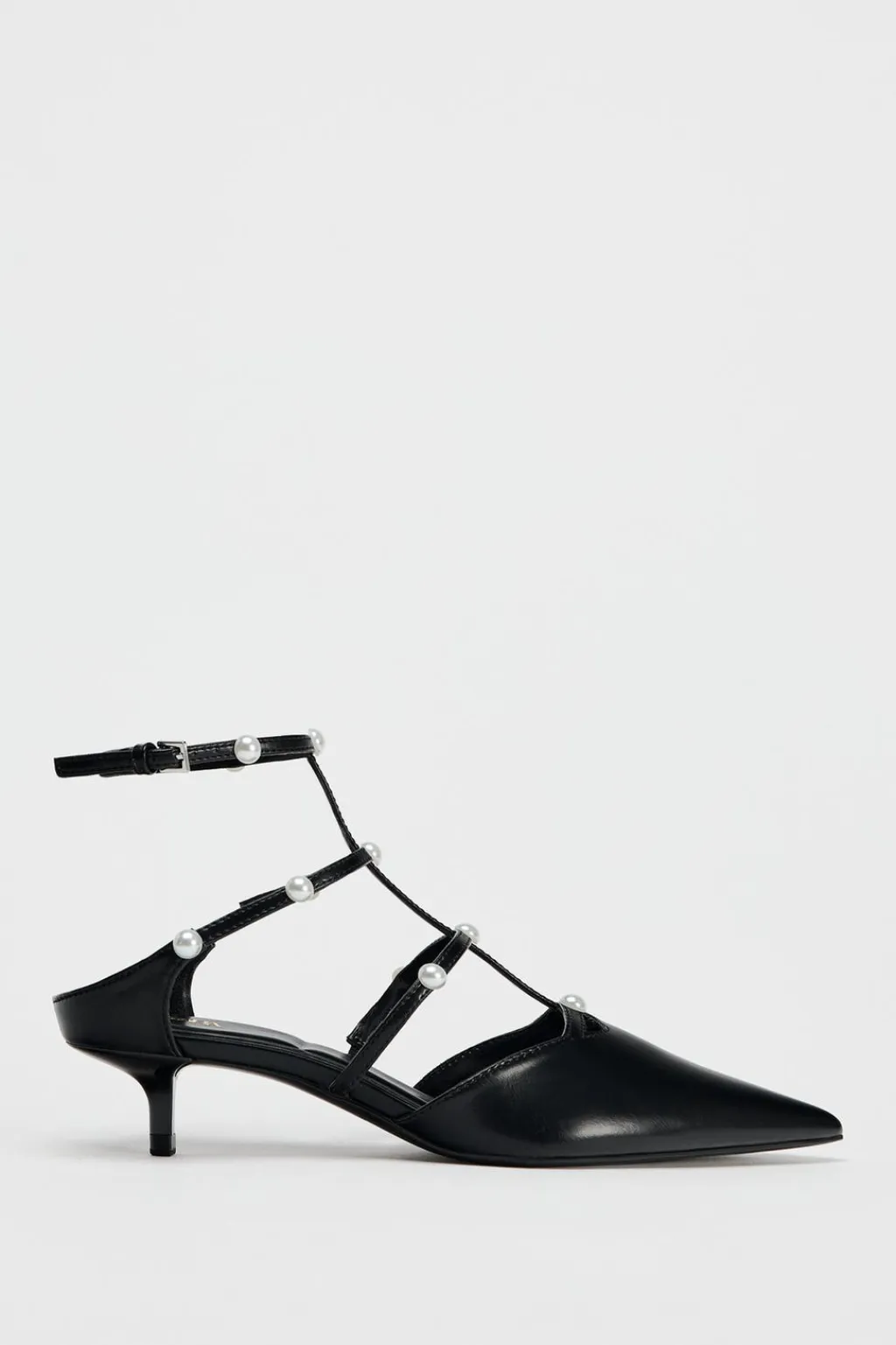 Zapato tipo destalonado con tacón kitten. Detalle de tiras con perlas. Cierre mediante tira con hebilla ajustable. Acabado en punta.