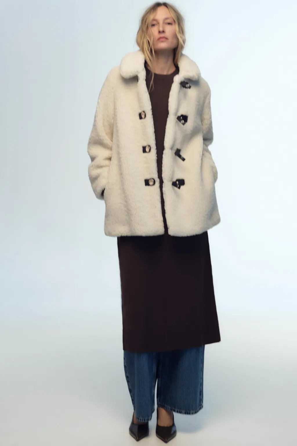 Abrigo de cuello solapa y manga larga. Bolsillos laterales ocultos en costura. Cierre frontal con alamares.