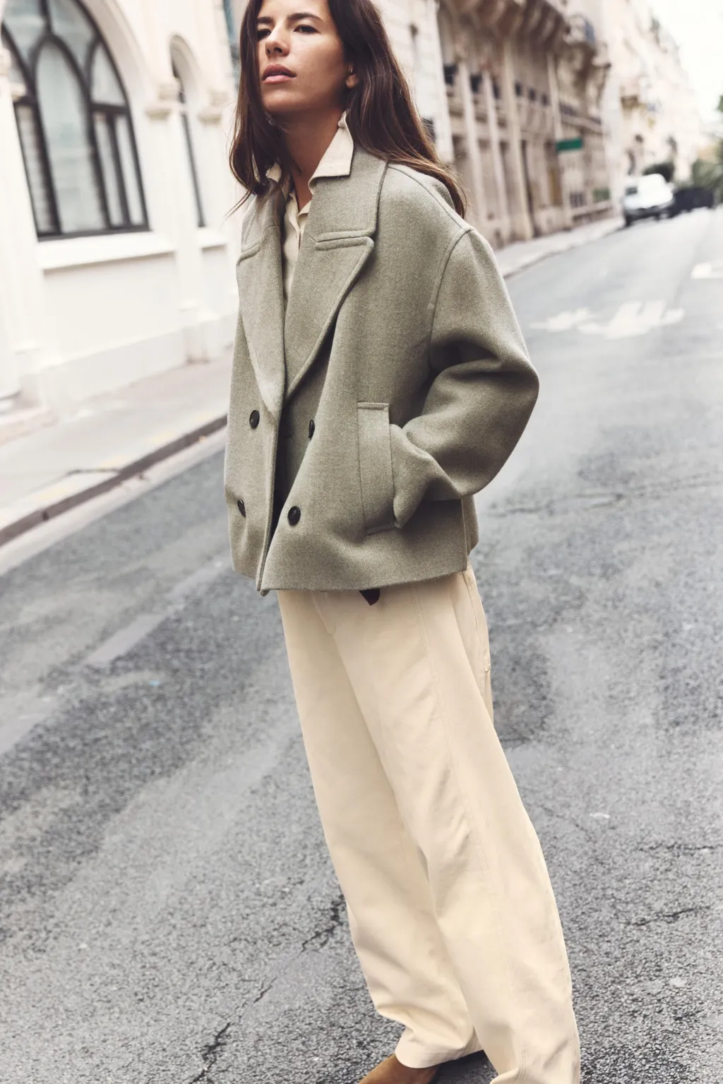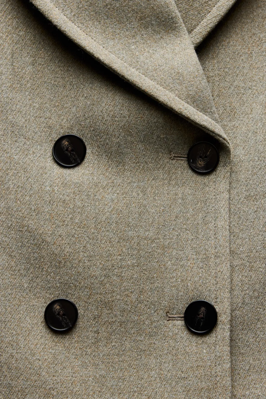 Abrigo de cuello solapa y manga larga. Bolsillos delanteros de vivo. Cierre frontal cruzado con botones.