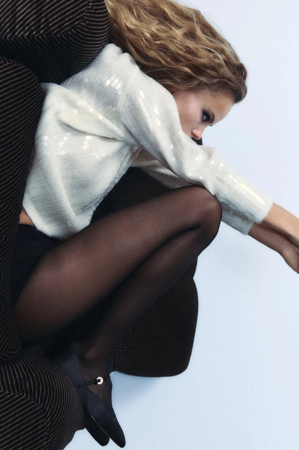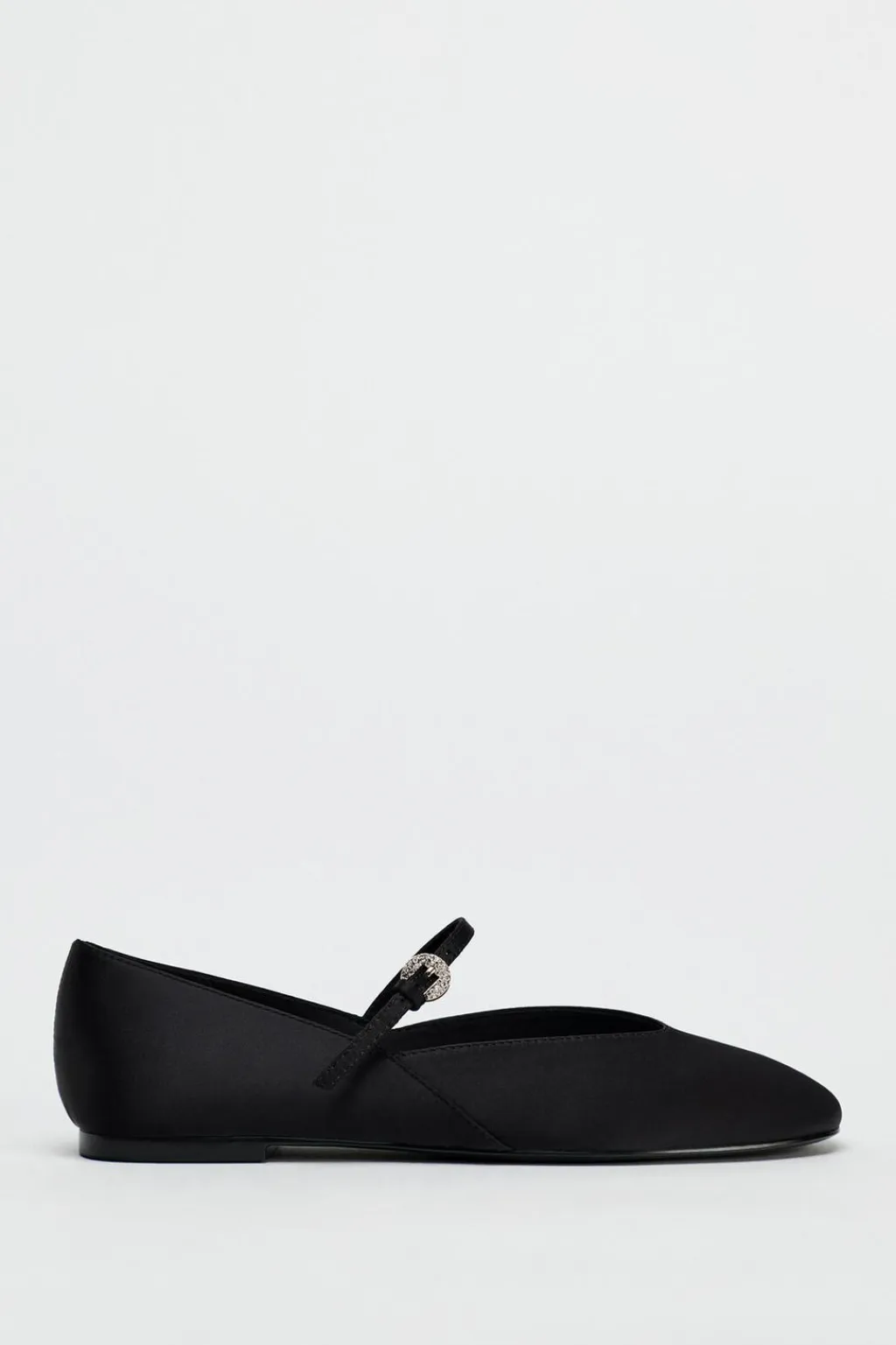 Zapato tipo bailarina en efecto satinado. Detalle de tira con hebilla ajustable en brillo. Acabado en punta redonda.