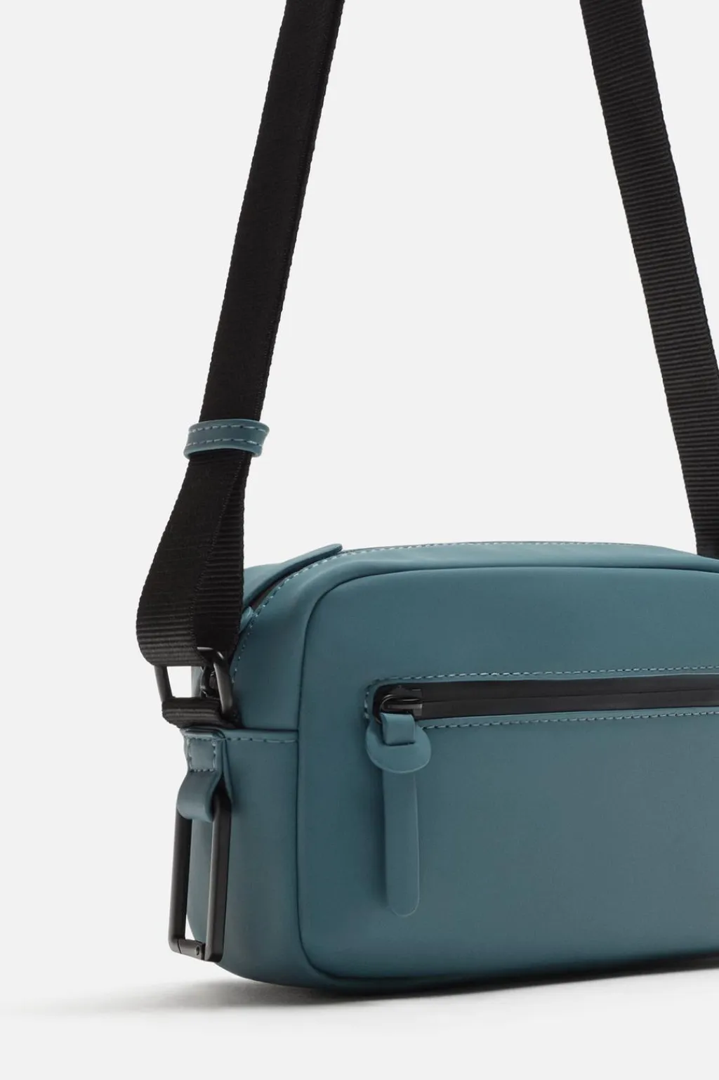 Bandolera de acabado engomado. Compartimento principal con cierre mediante cremallera y bolsillo frontal. Asa de hombro ajustable.