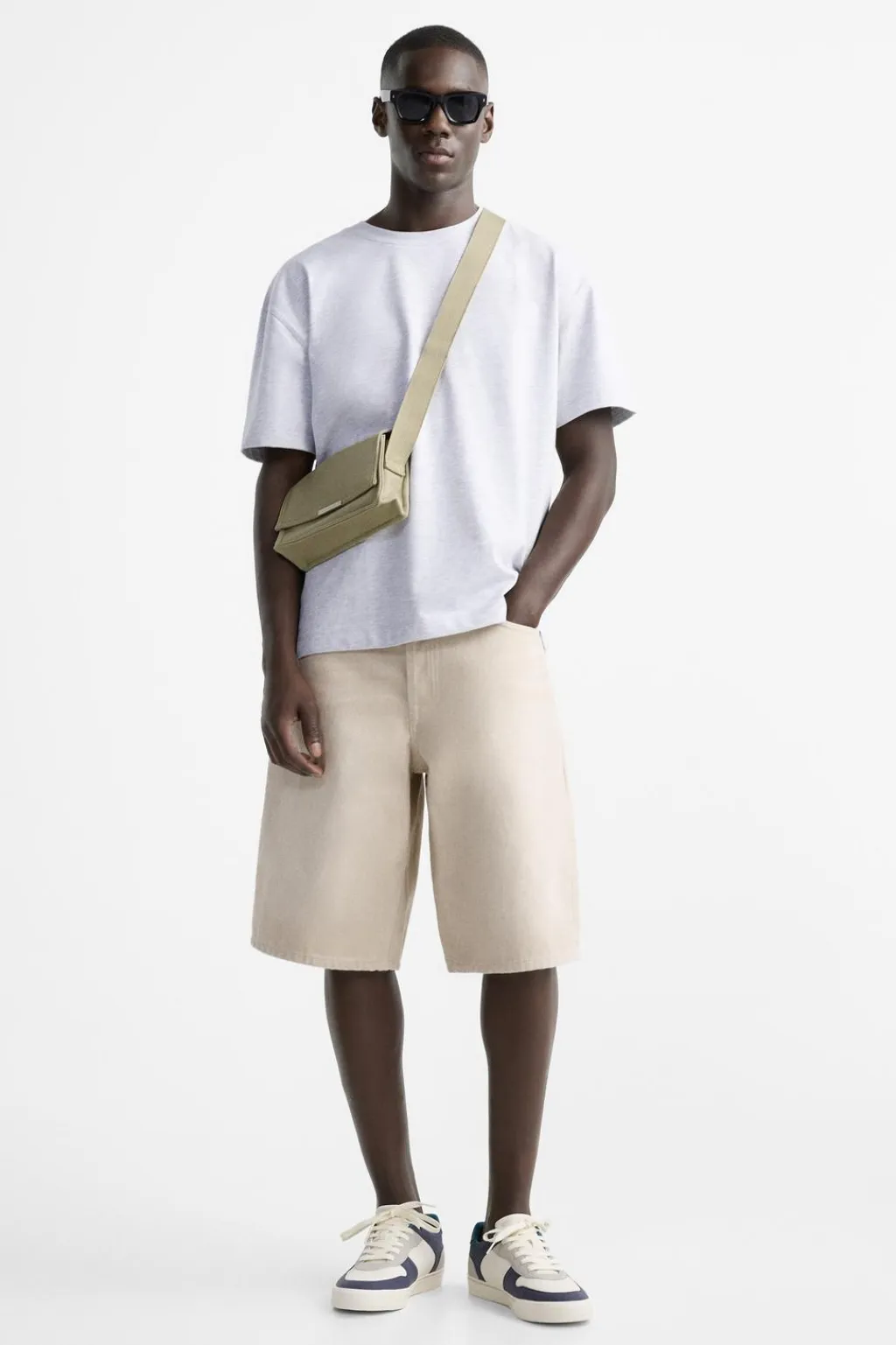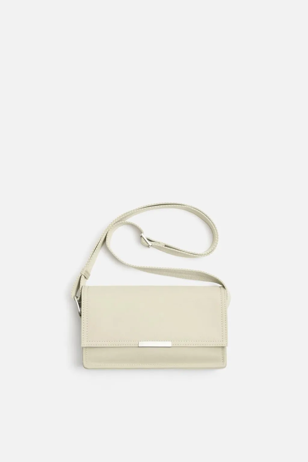 Bandolera confeccionada en tejido tipo gabardina. Compartimento principal con cierre mediante solapa. El interior cuenta con un bolsillo plano con cierre mediante cremallera. Compartimento secundario en la parte posterior. Asa de hombro ajustable.