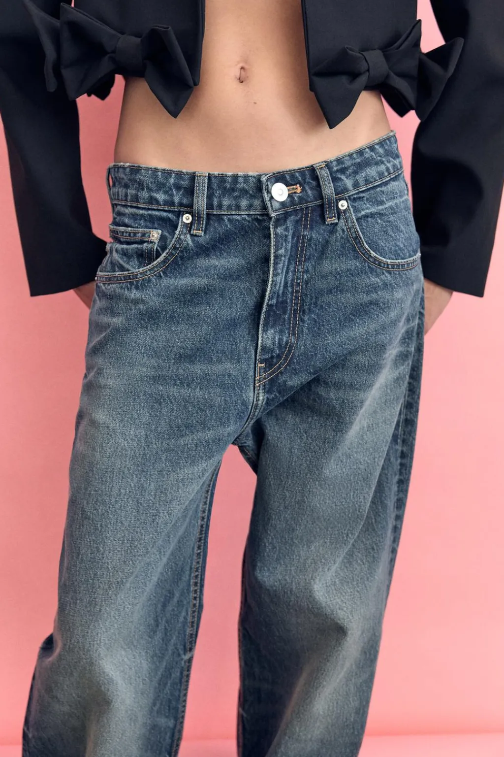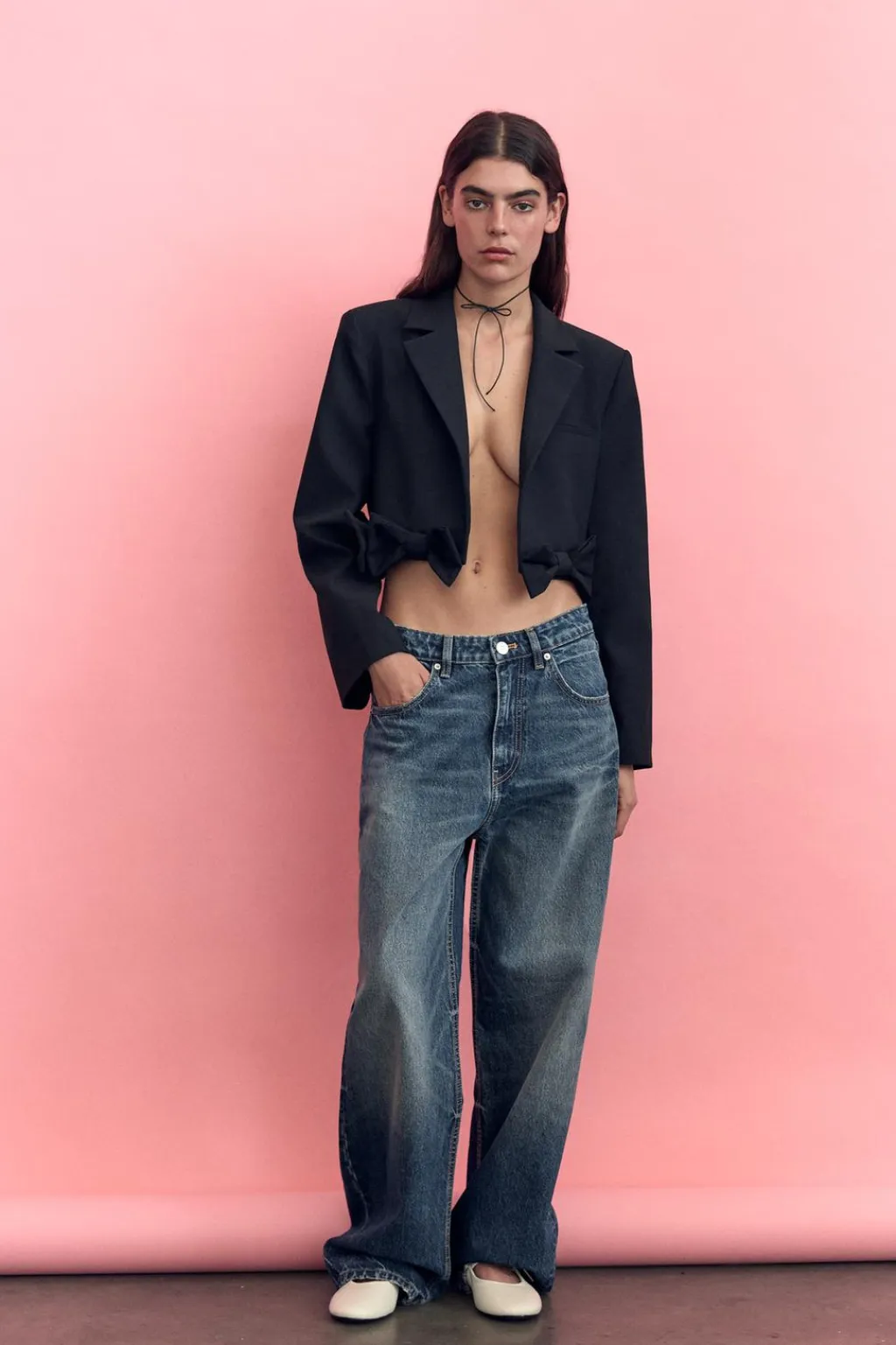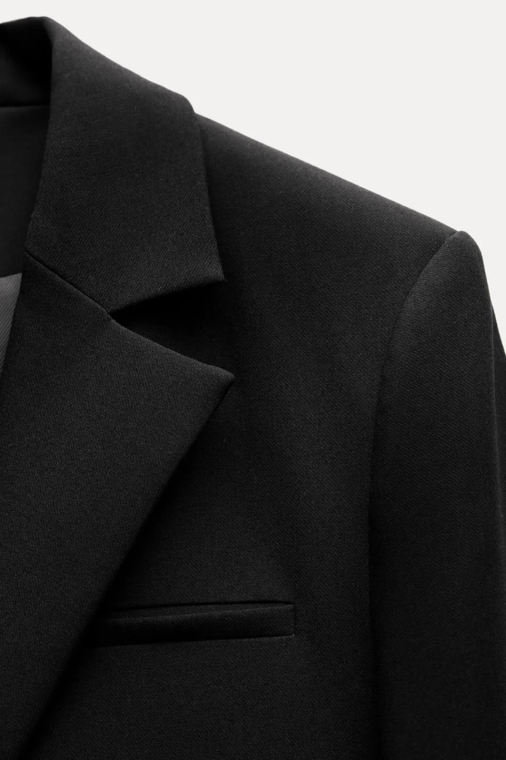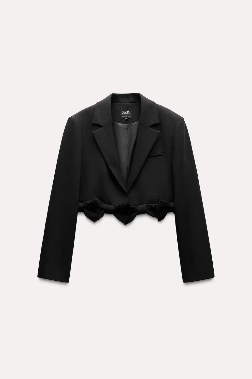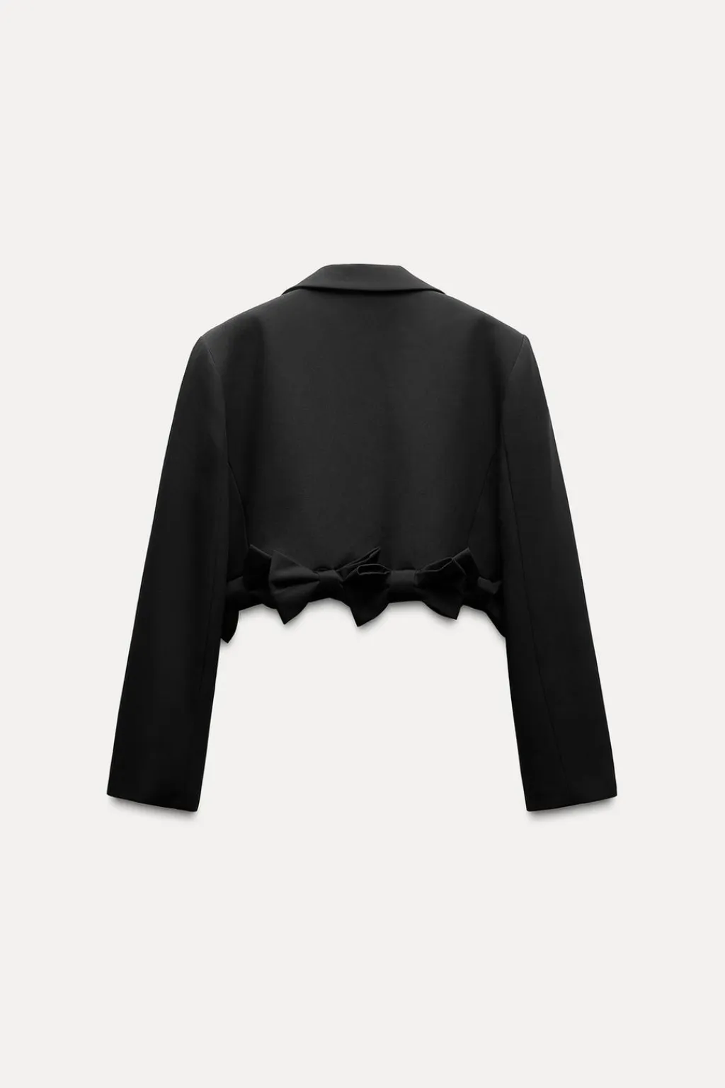 Blazer corta de cuello solapa y manga larga con hombreras. Falso bolsillo de vivo en pecho. Forro interior. Bajo con detalle de lazos en relieve.