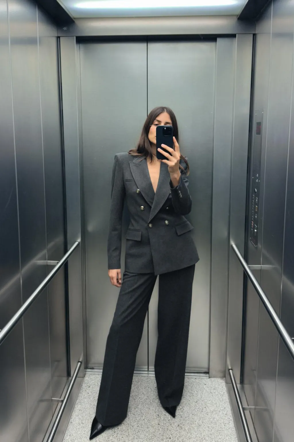 Blazer de cuello solapa y manga larga con hombreras. Bolsillos delanteros con solapa. Cierre frontal cruzado con botones con relieve.