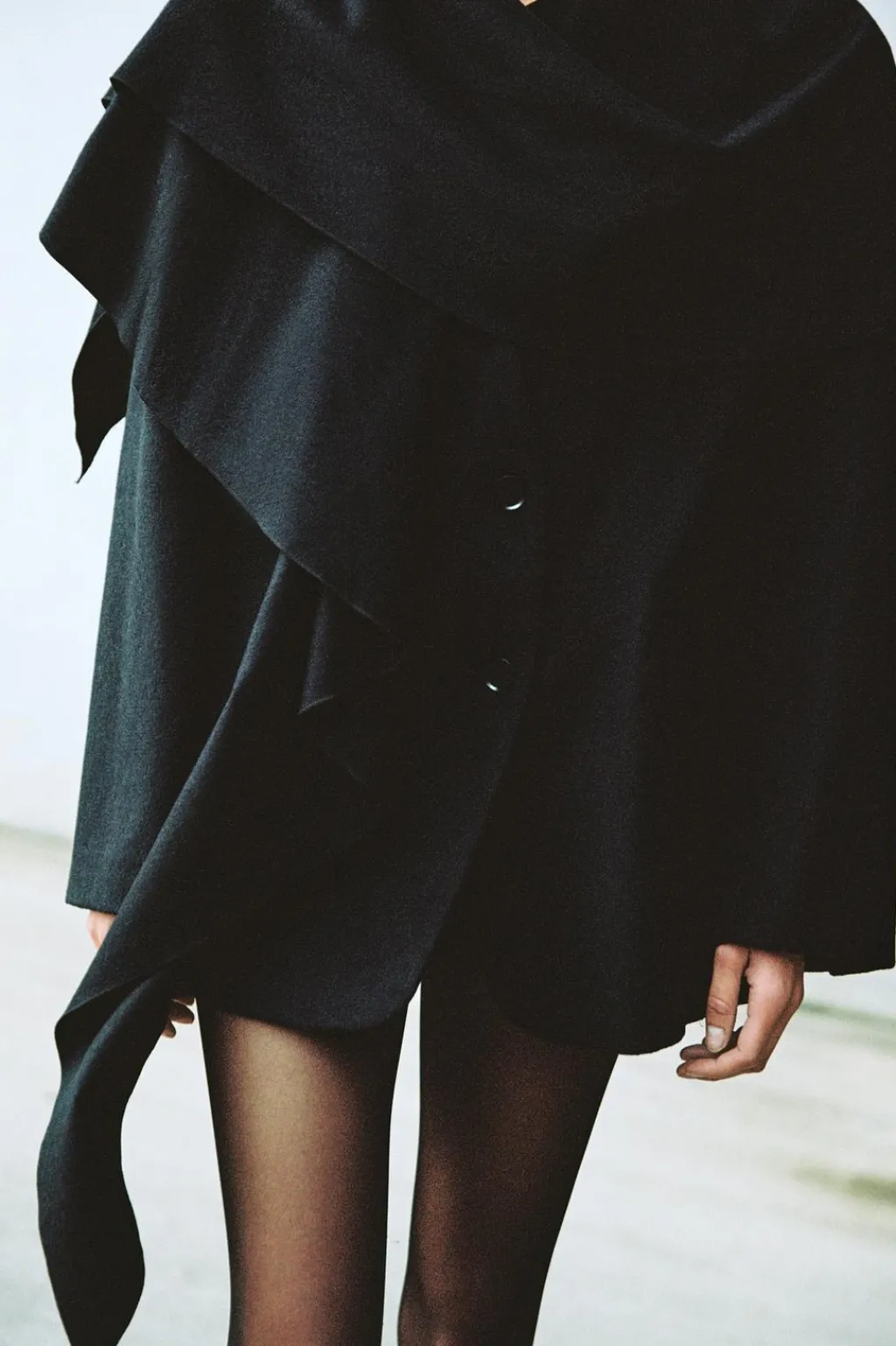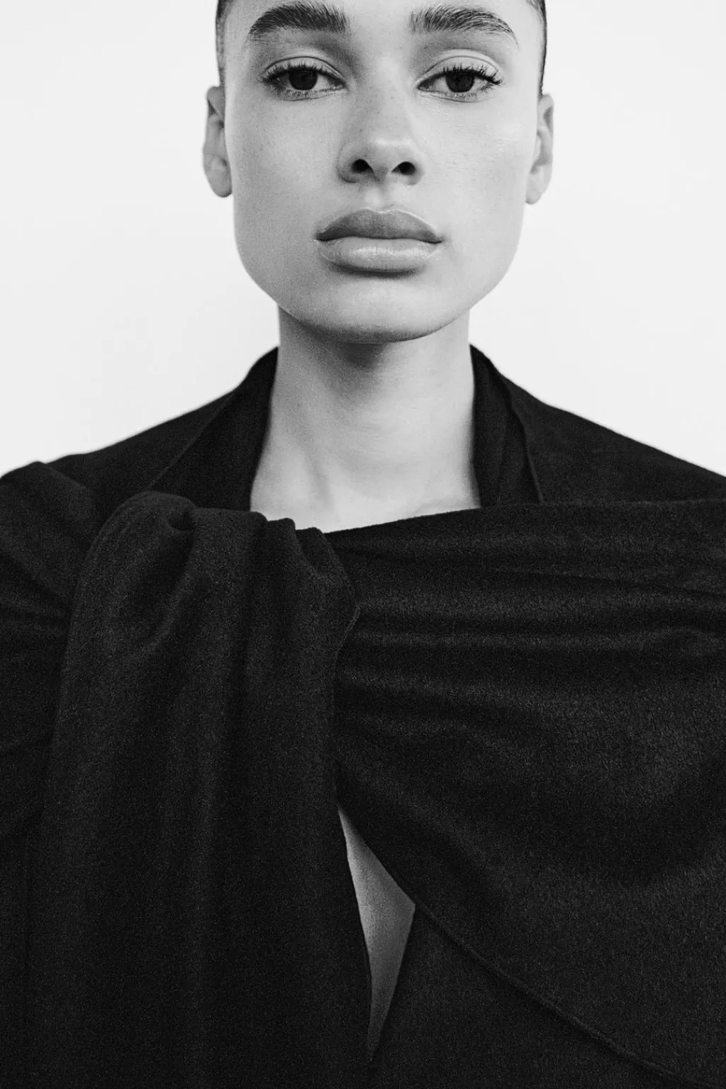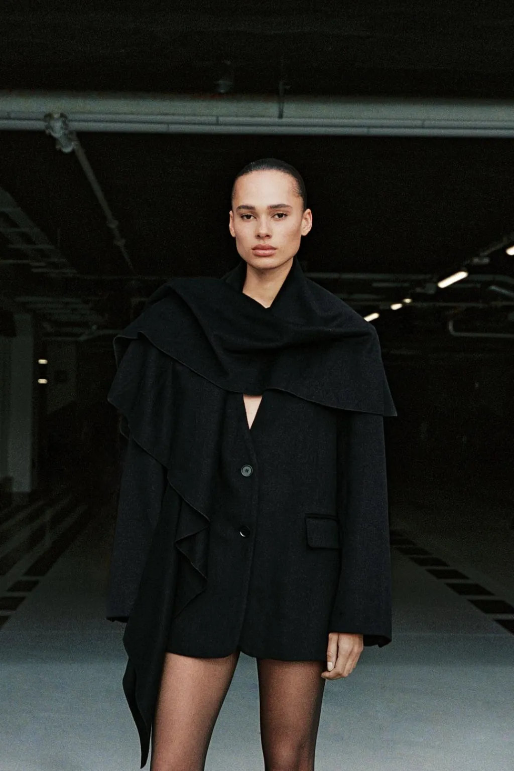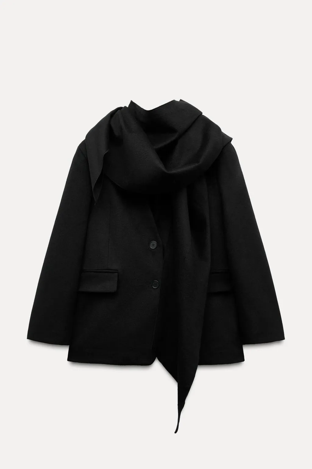 Blazer confeccionada con lana. Escote pico con detalle de bufanda en mismo tejido. Manga larga con hombreras. Bolsillos con solapa en delantero y de vivo en pecho. Forro interior. Cierre frontal con botones.