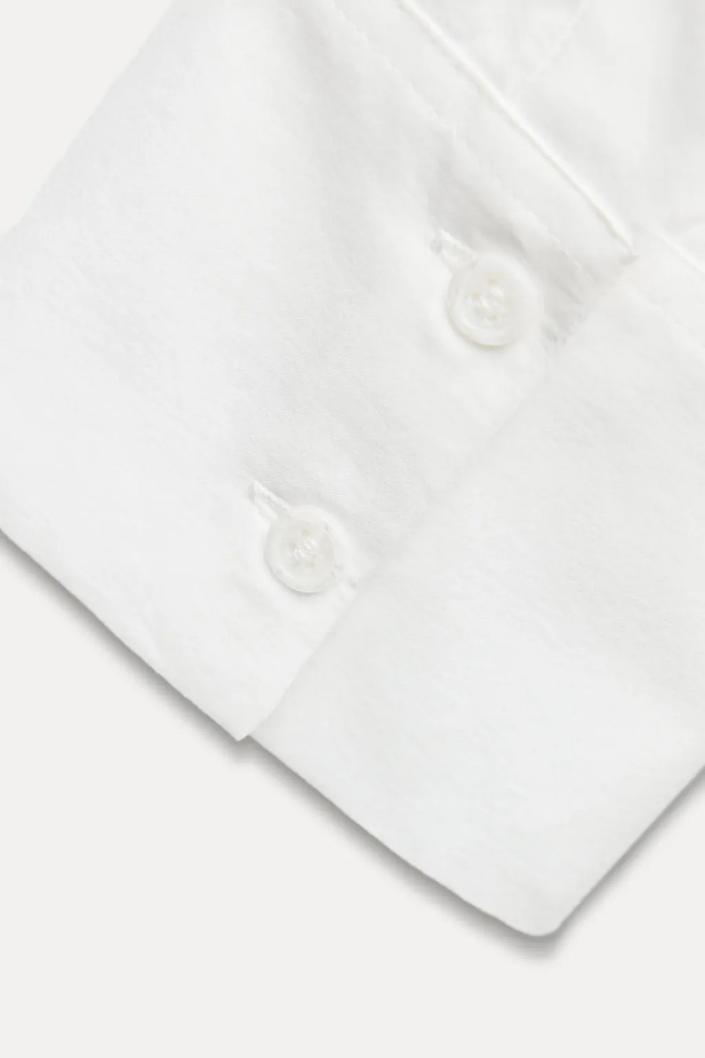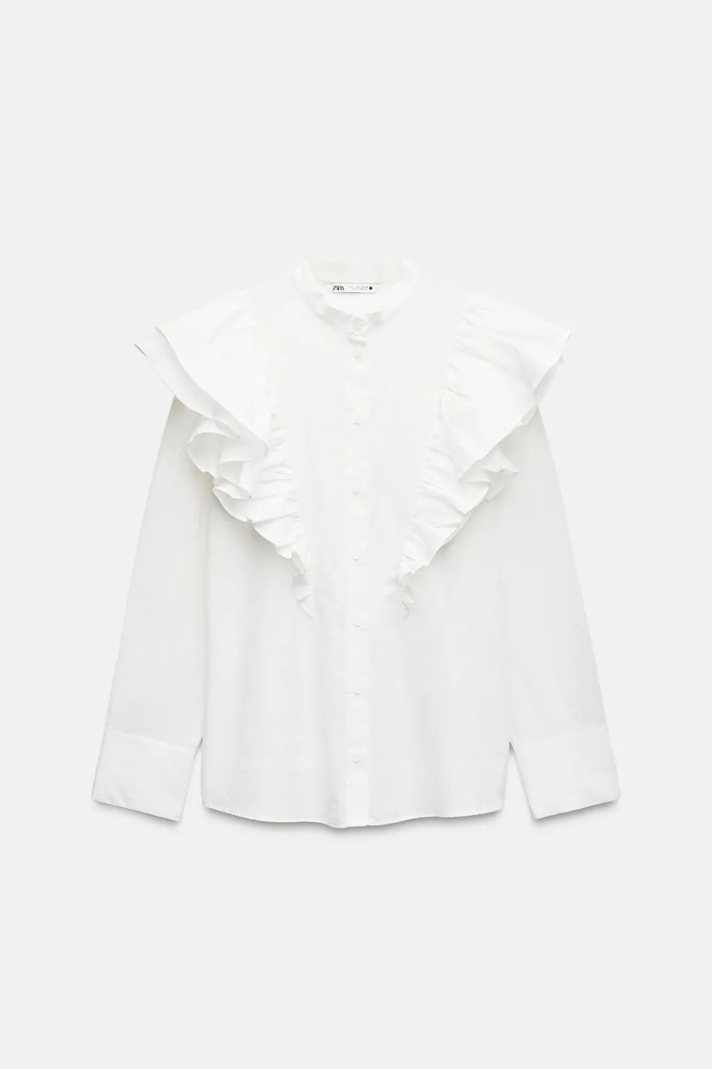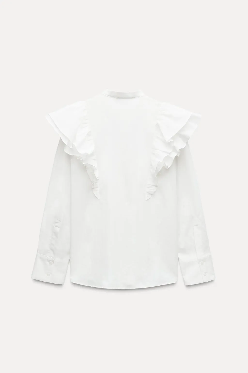 Blusa confeccionada en hilatura de algodón. Cuello redondo y manga larga acabada en puño. Detalle de volantes en mismo tejido. Cierre frontal con botones.