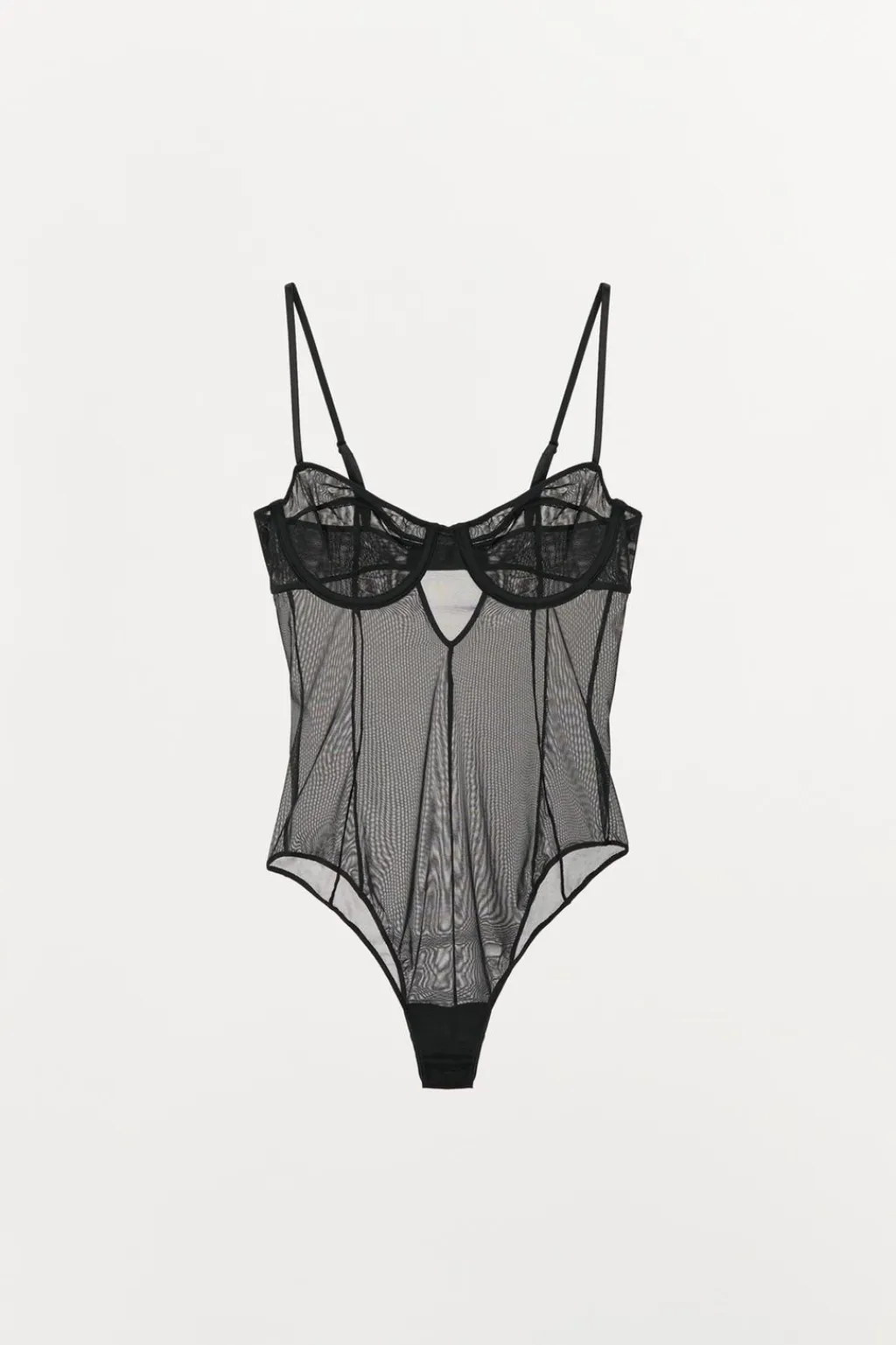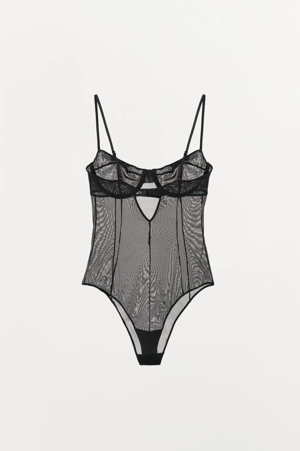 Body semitransparente con aros confeccionado en tejido efecto mesh. Escote redondo y tirantes finos ajustables. Cierre en espalda con ganchos metálicos y en bajo con botones a presión.