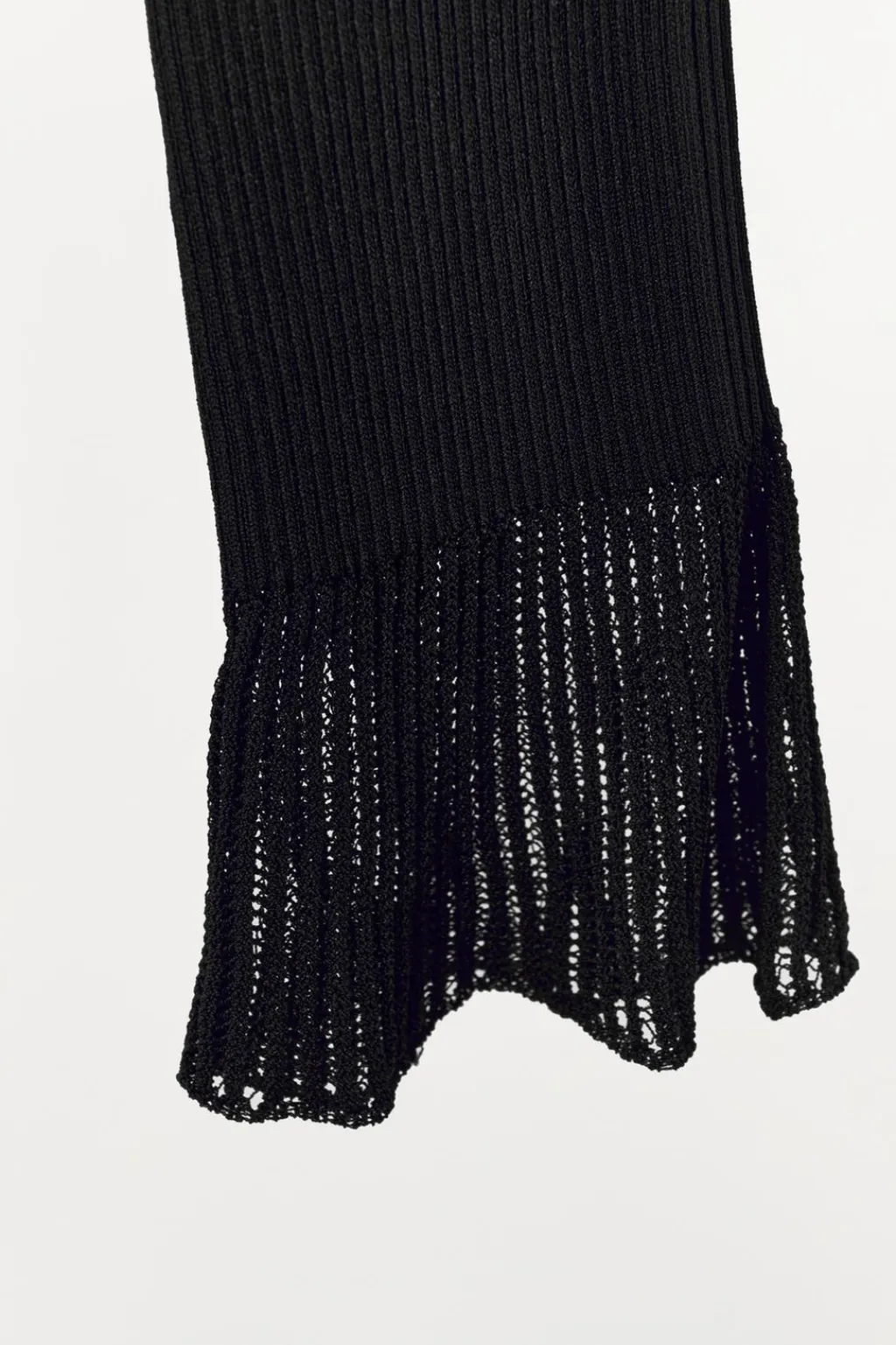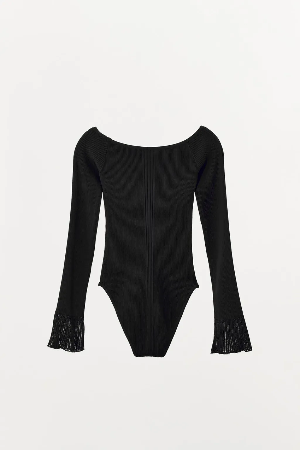 Body de escote barco y manga larga acabada en volantes. Tejido en rib. Cierre en bajo con botones a presión.